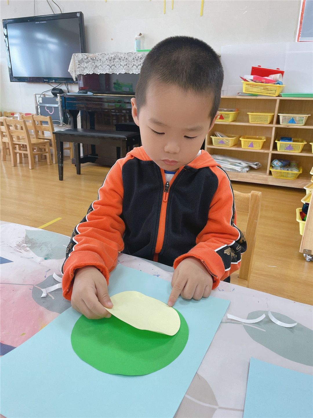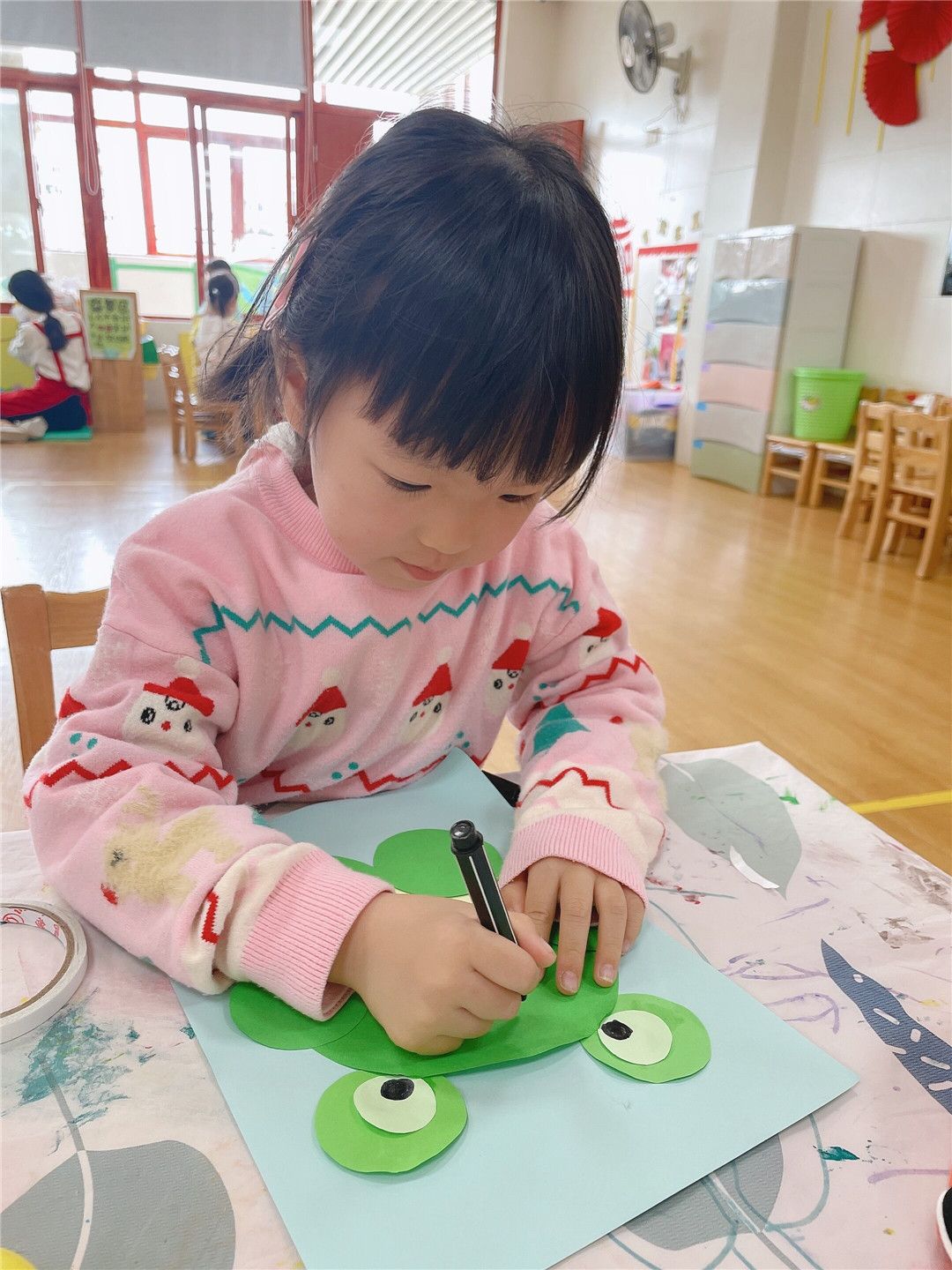 宝贝们用大大小小的圆形来拼贴制作小青蛙。绿绿的身体、白白的肚皮、鼓鼓的眼睛是由大小不同的三个圆叠加组成的,最后画上宽宽的嘴巴,一只只可爱的小青蛙就蹦蹦跳跳地出现啦!呱呱呱,呱呱呱,我们要捉害虫保庄稼。