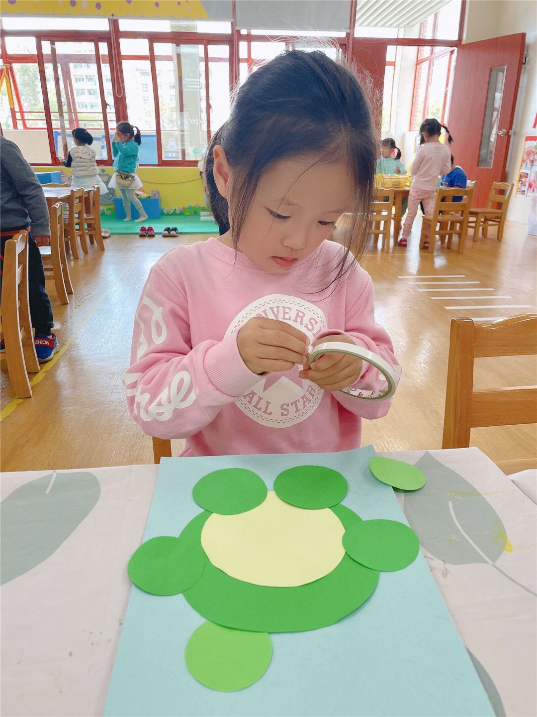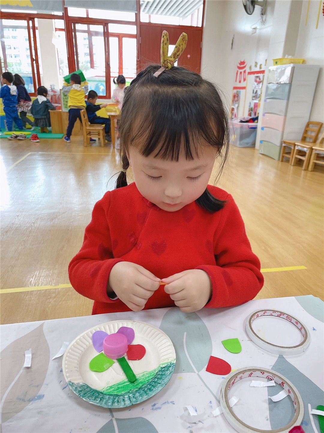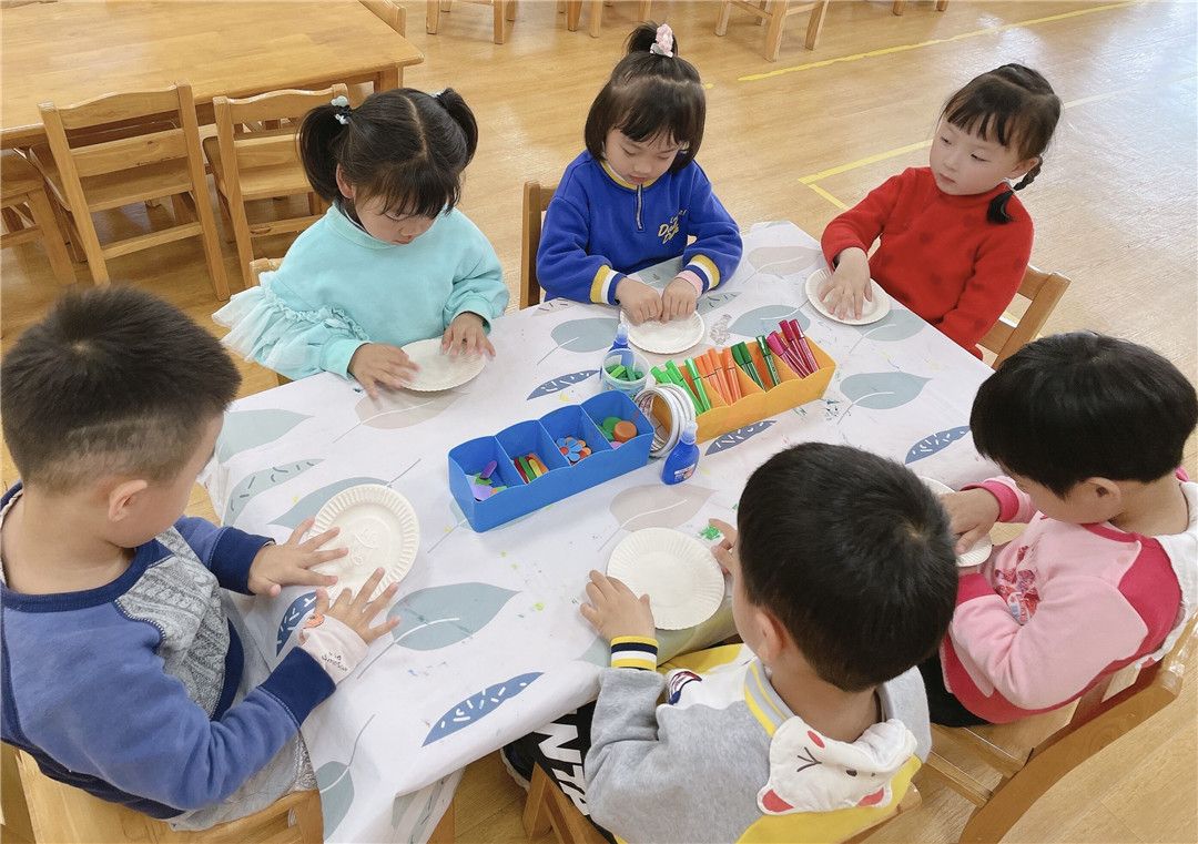 一张纸、一个纸盘、一个废旧的瓶盖……都能激起孩子的兴趣和智慧,进而迸发创作之花。瞧!一群群美丽的蝴蝶、一朵朵美丽的花、一只只可爱的青蛙……扮靓着班级的多个角落,叙说着一个个属于春天里的故事!