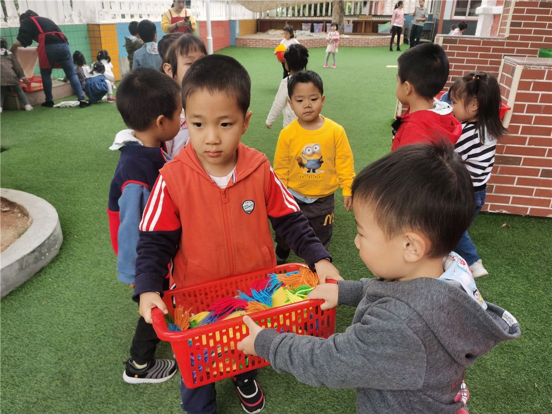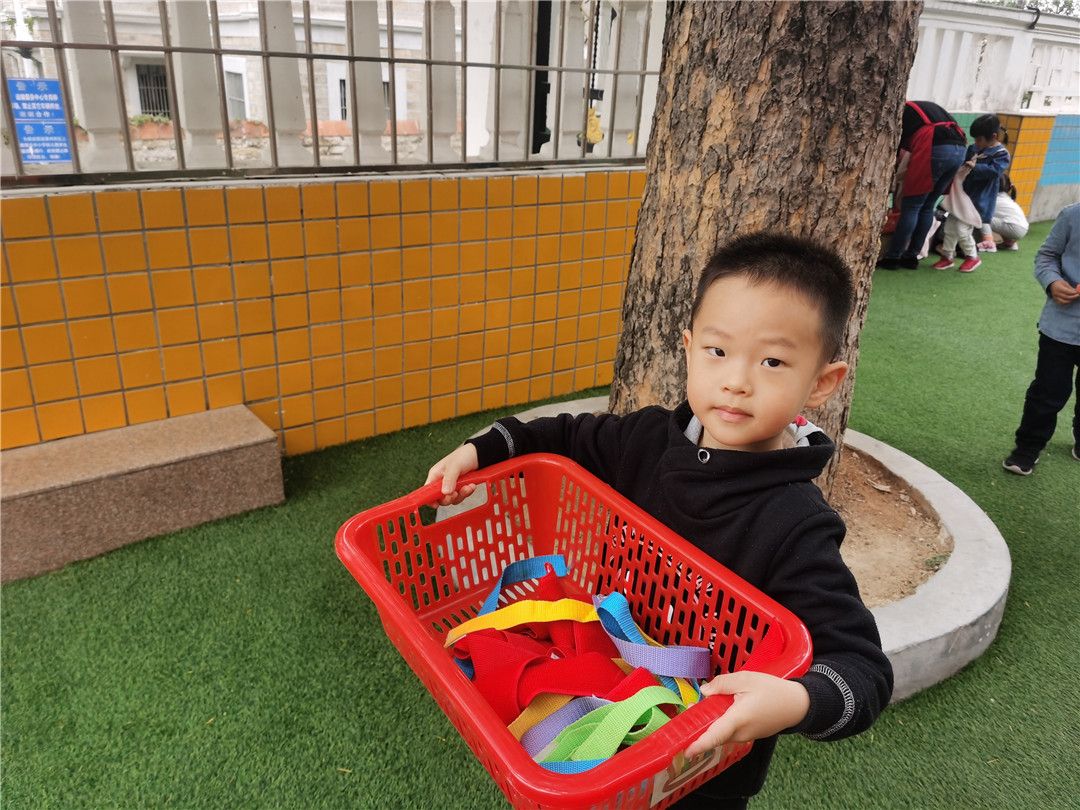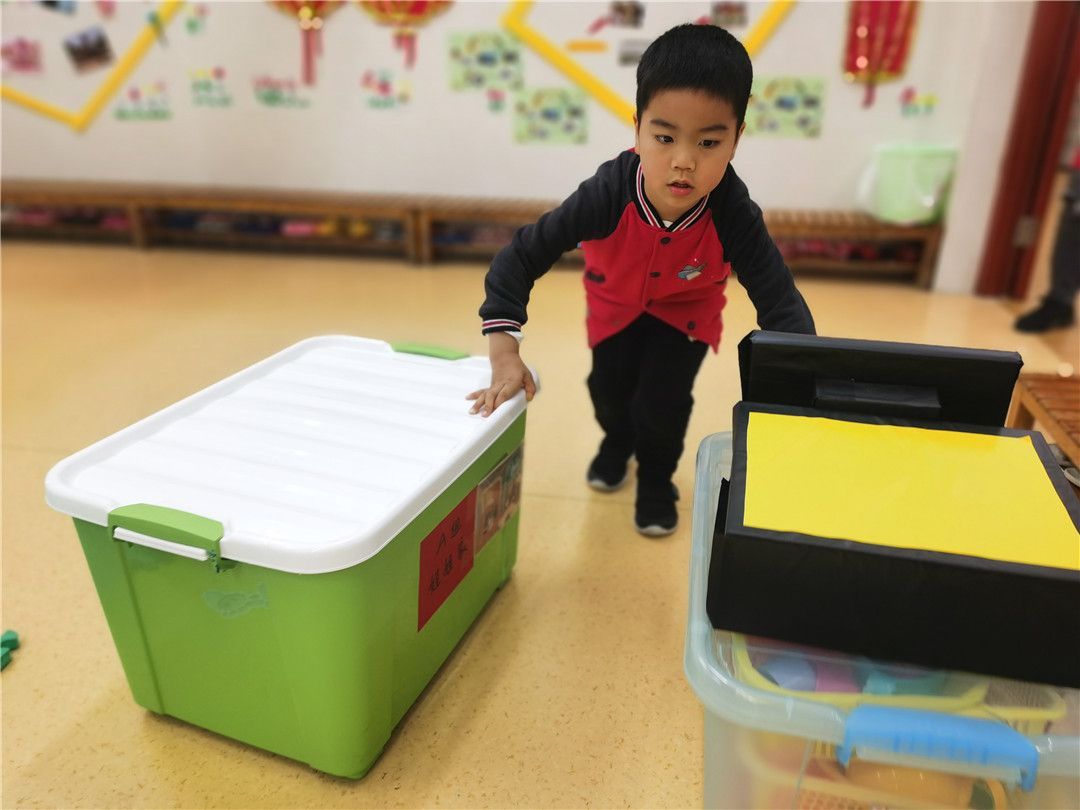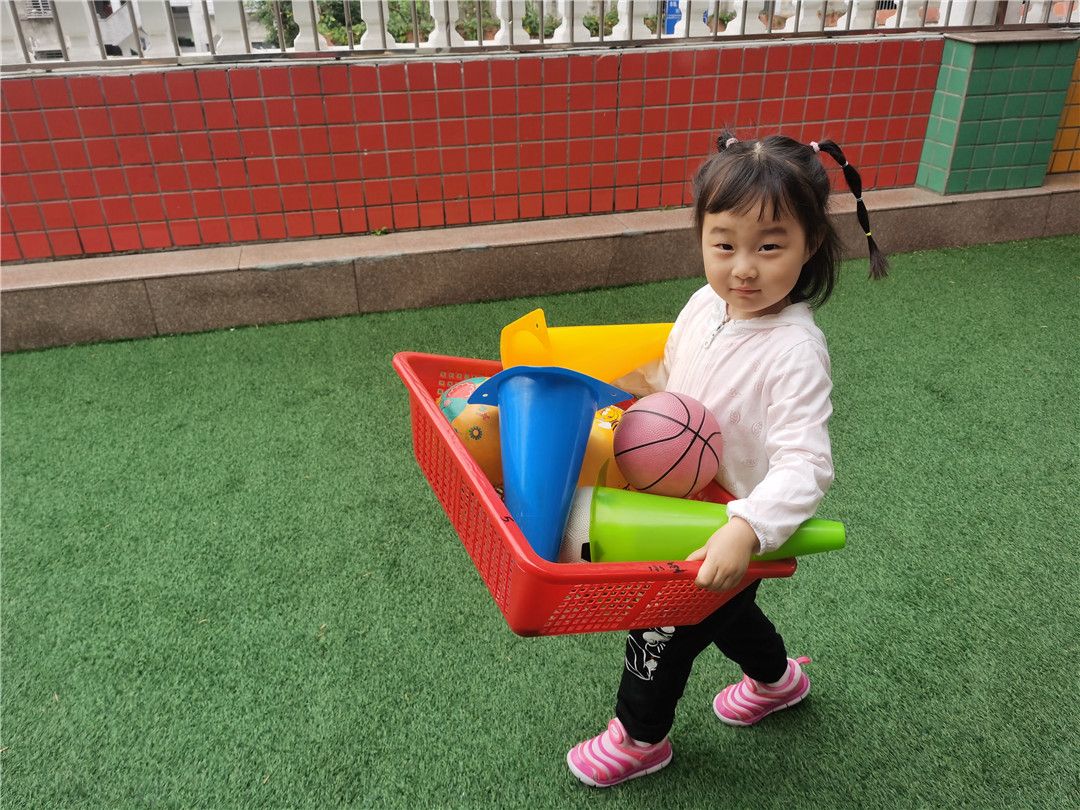 运动完了,我又变身“大力士”, 将游戏材料收进筐里,“一二三”搬到橱柜里收起来。老师老师,您别谢谢我,我愿意当您的小助手!
