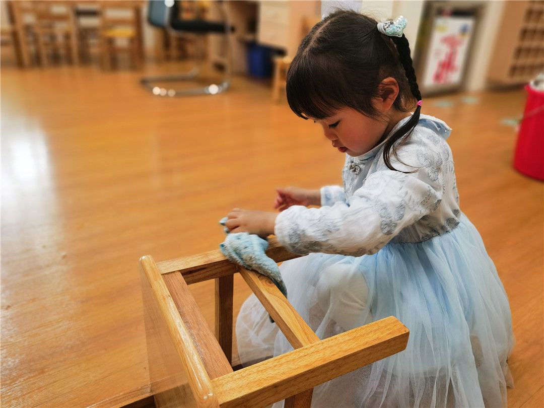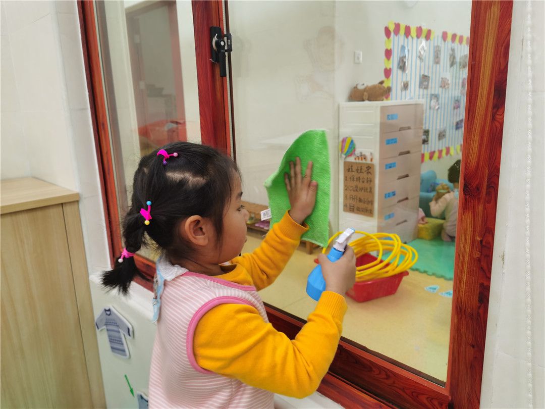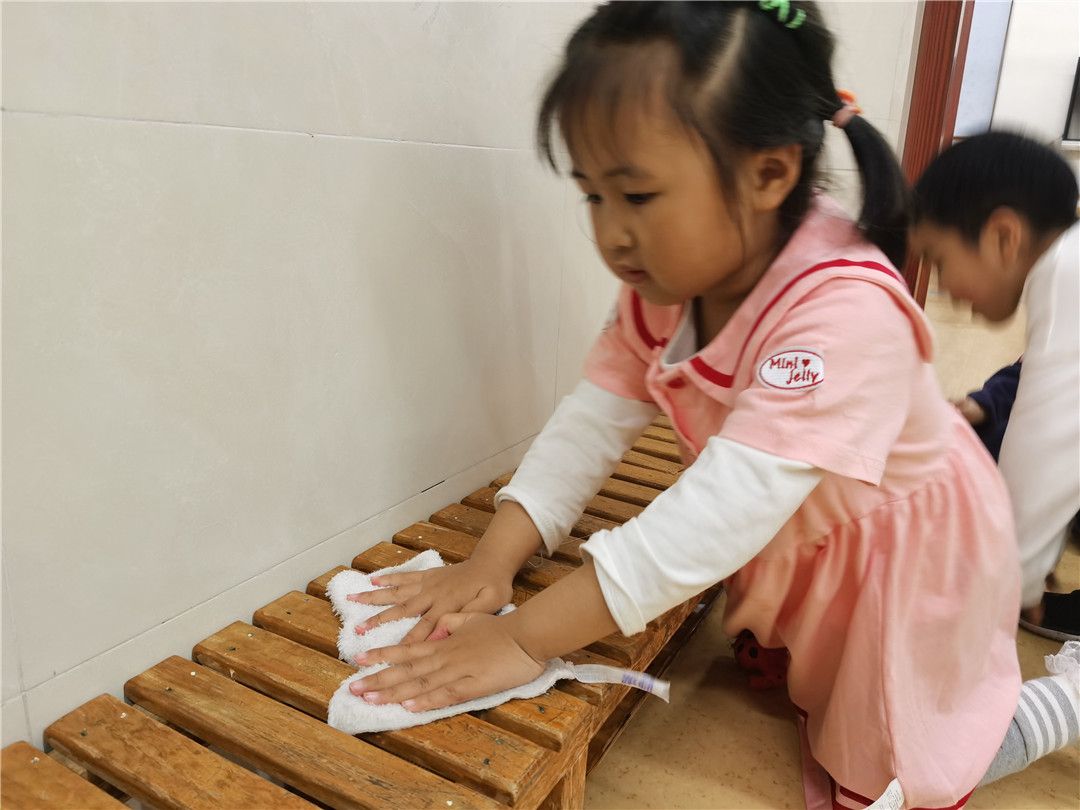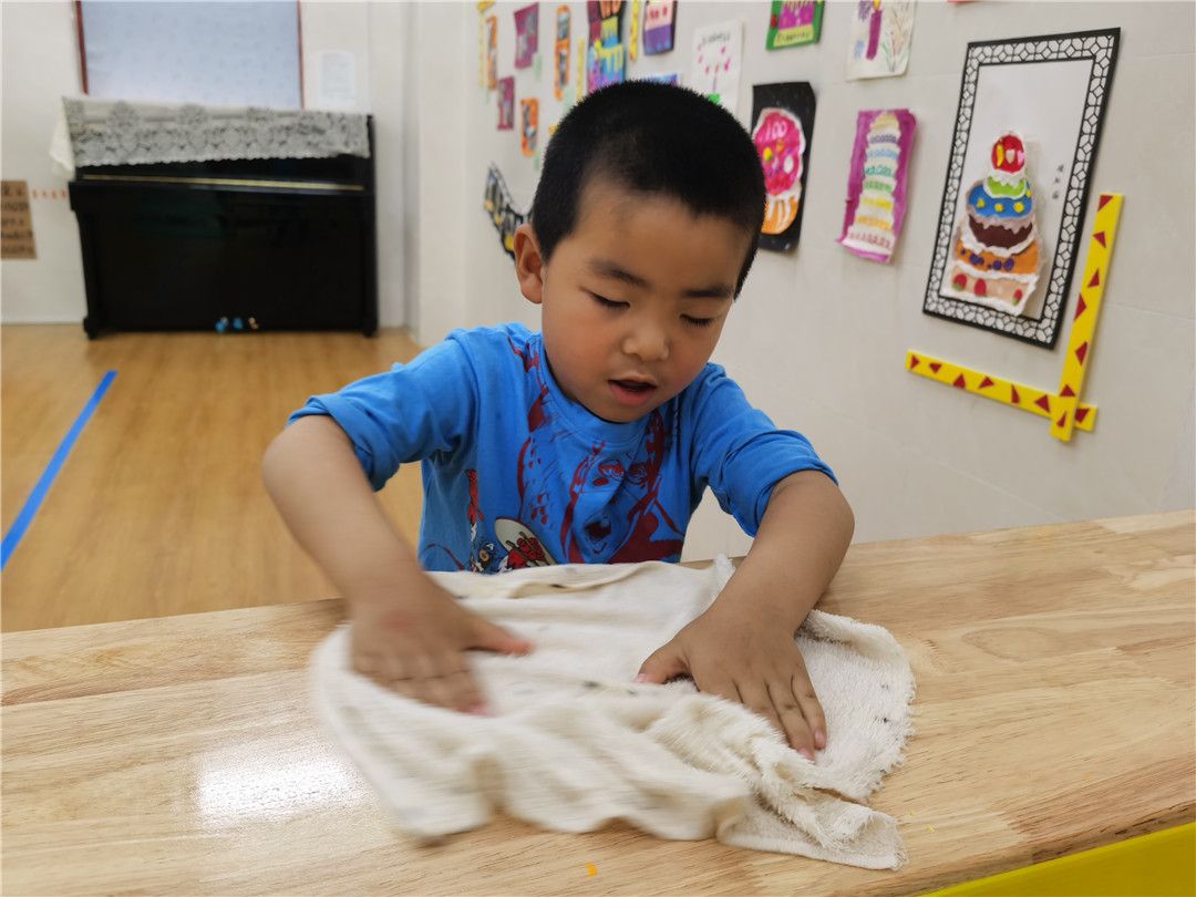 别看我们年纪小,会做的事儿可真不少,最开心的是当值日生。拿起小水壶,为观察区的小花浇浇水,花儿喝饱水好像开心地朝我点点头,我也笑了。生活区的豆子撒了,来,我拿扫帚扫一扫!撸起袖子拧毛巾,擦擦桌子,擦擦自己的小椅子,连小鞋凳、窗户和墙壁都不放过。哇喔,教室变干净了!
