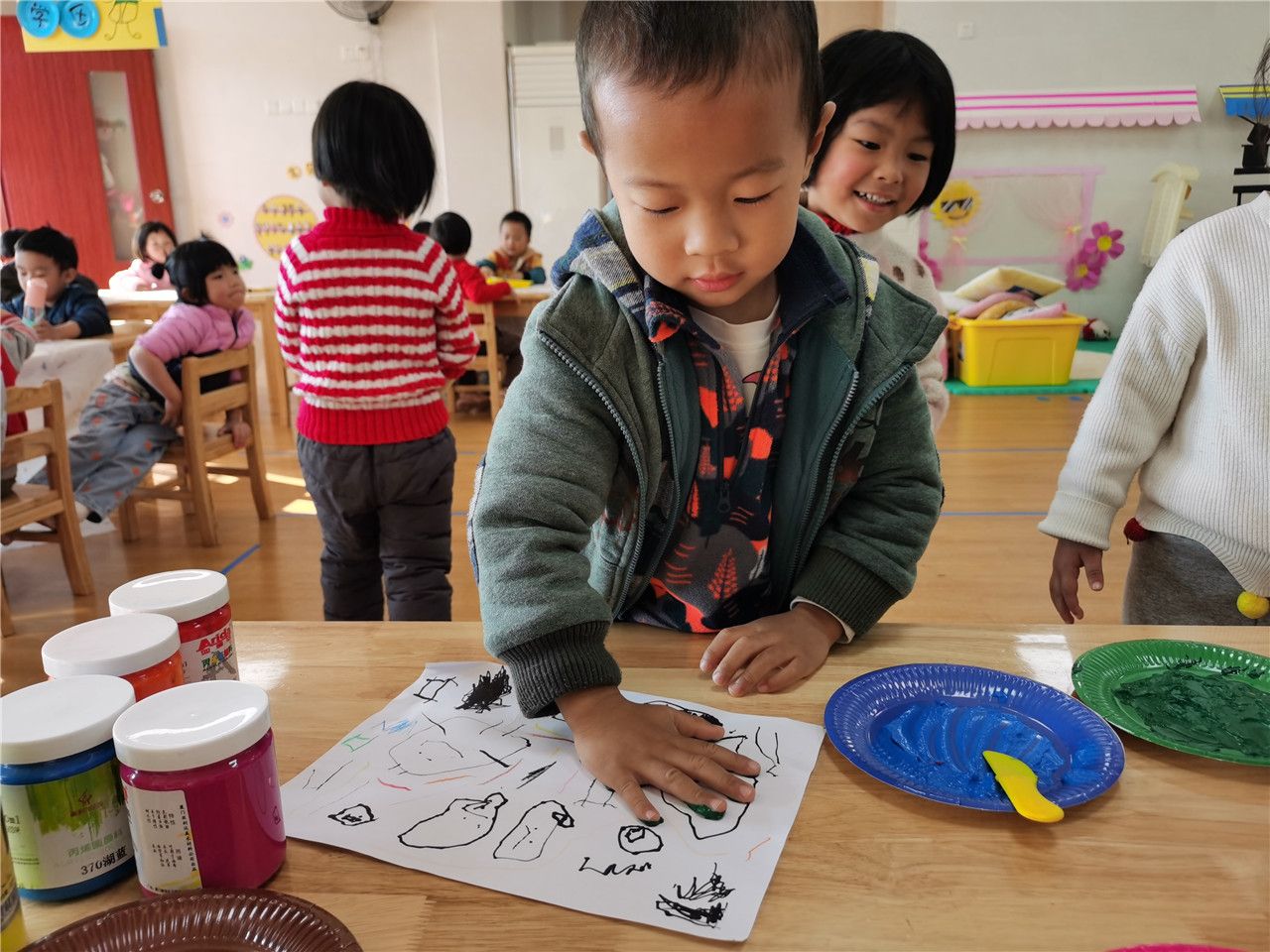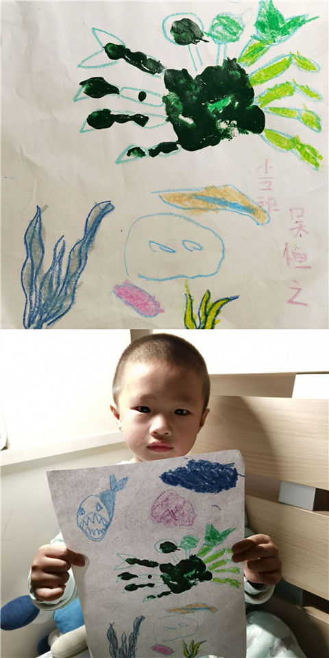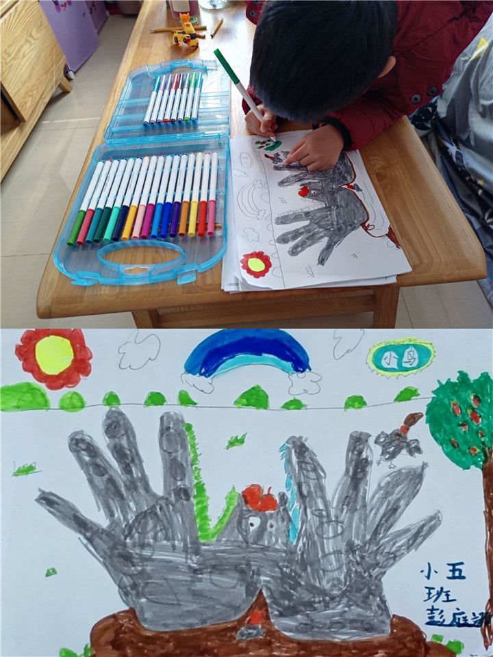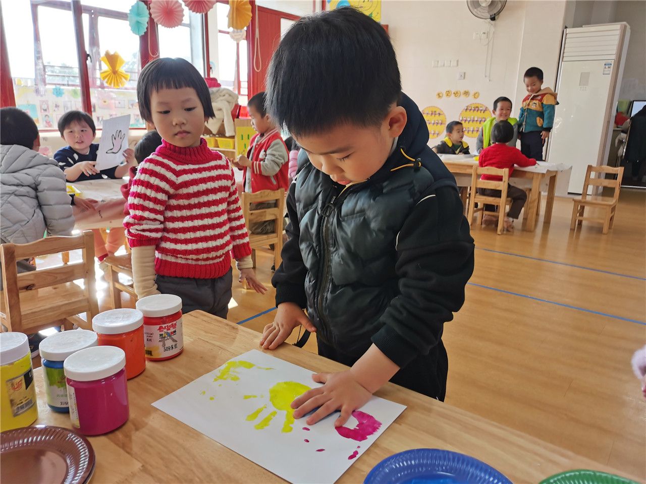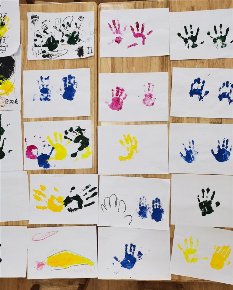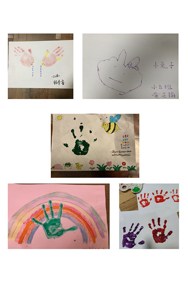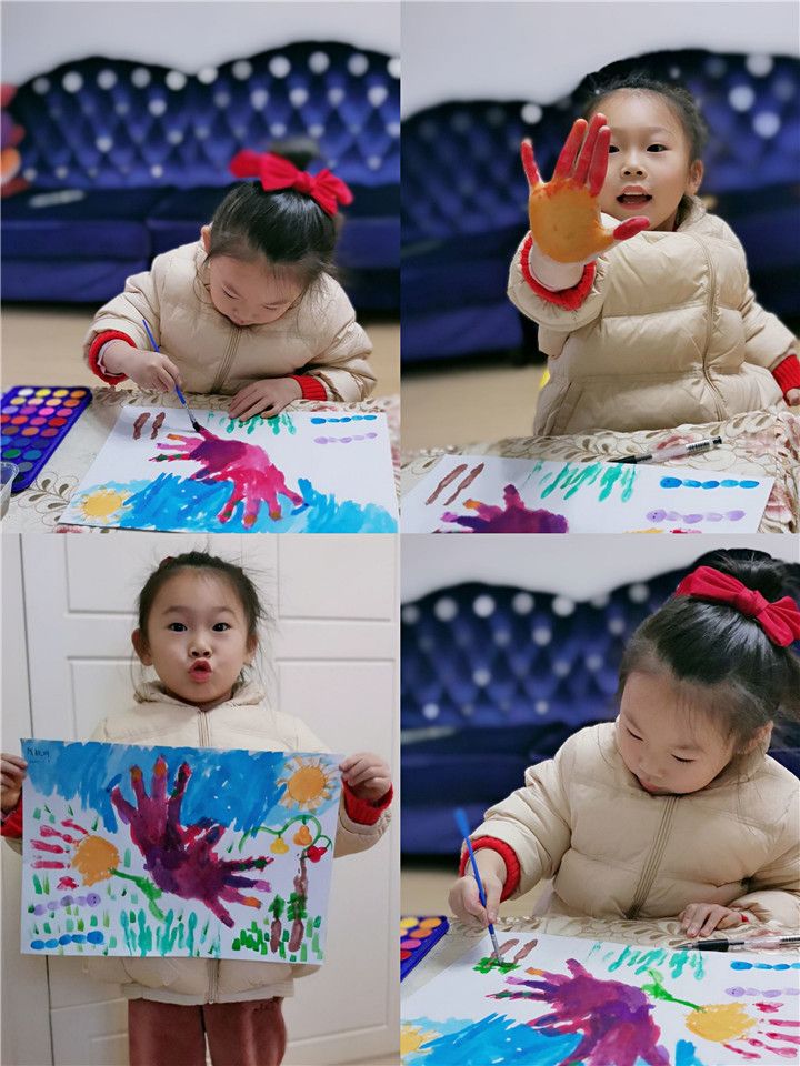 今天小五班的孩子们都异常兴奋,因为我们要用五颜六色的颜料和小小手来完成一副特殊的画。