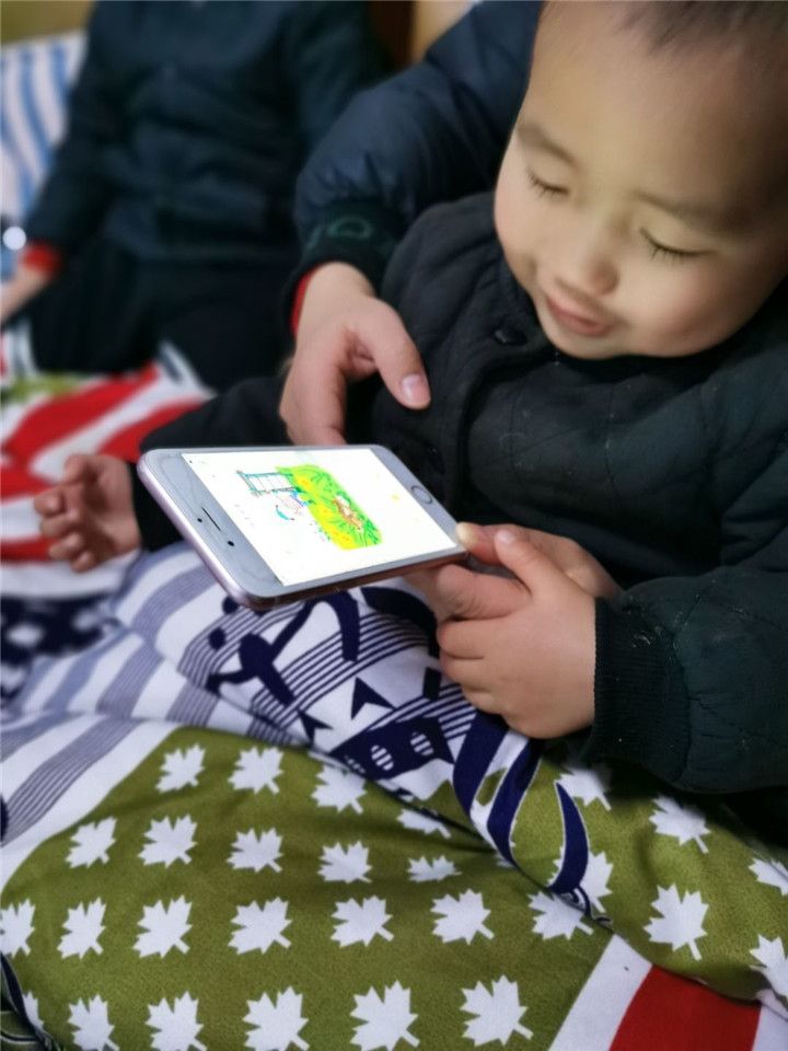 浩宇小朋友和家人一起学习使用智能手机,他说:“我有自己学习用的app!”