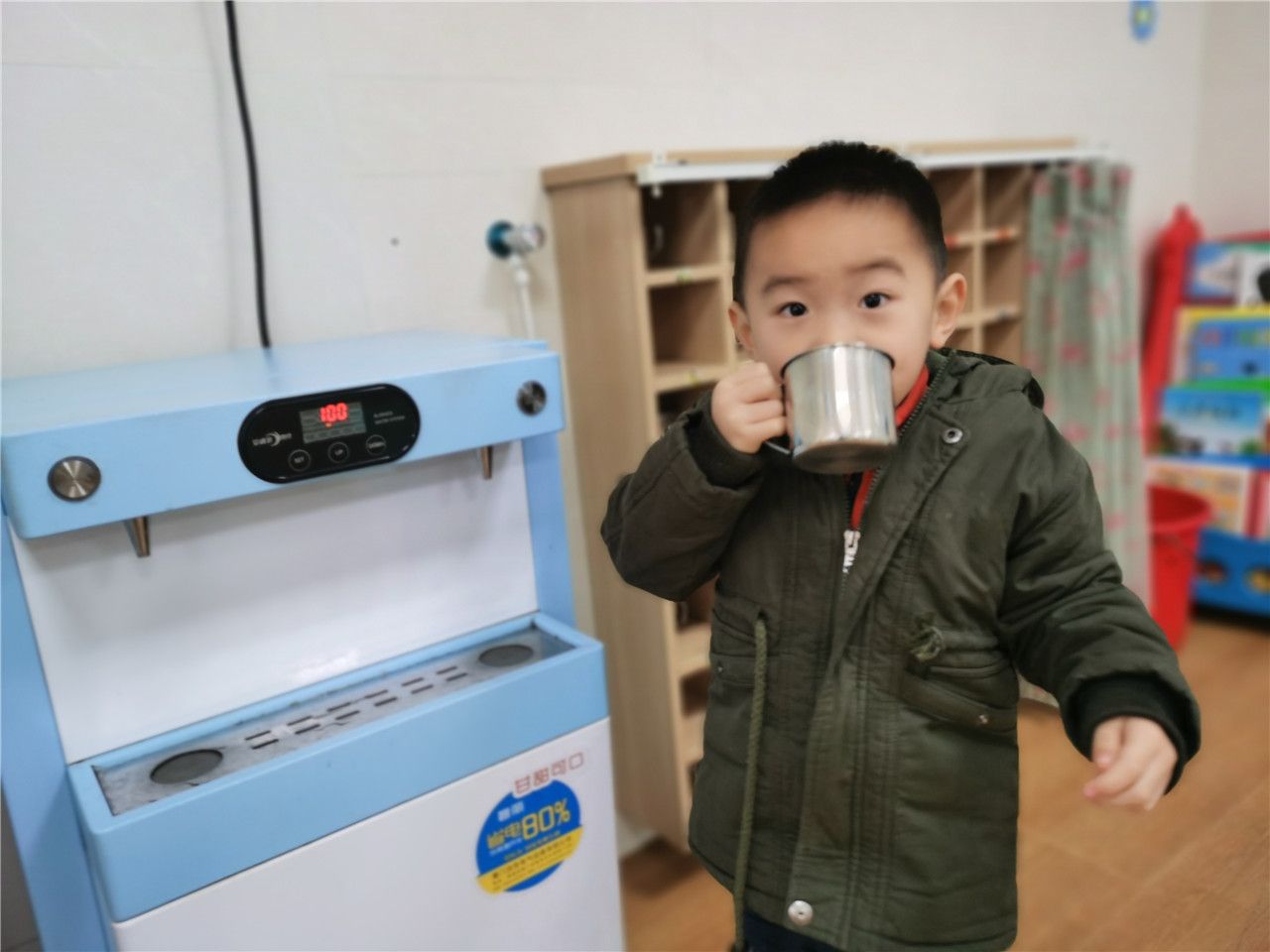 运动之后口渴了要用小手拿杯子喝喝水;