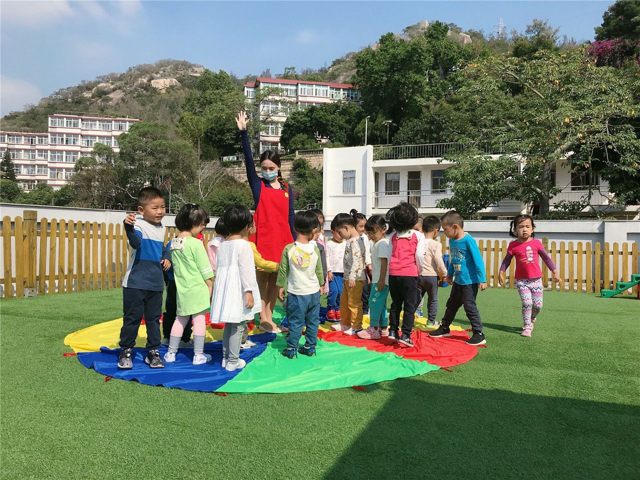运动可以让宝贝们的身体变得更强壮哦!一起来运动吧!伴随着热身音乐声的响起,天台的户外场地变成了宝贝们的大游乐场啦!快看呐!欢乐彩虹伞的游戏开始啦!“一二三,一二三,我说颜色你来踩,不能踩到其他颜色哦!”老师发出指令后,矫健的宝贝们立马就跳到指令规定颜色的彩虹上,真是太厉害啦!