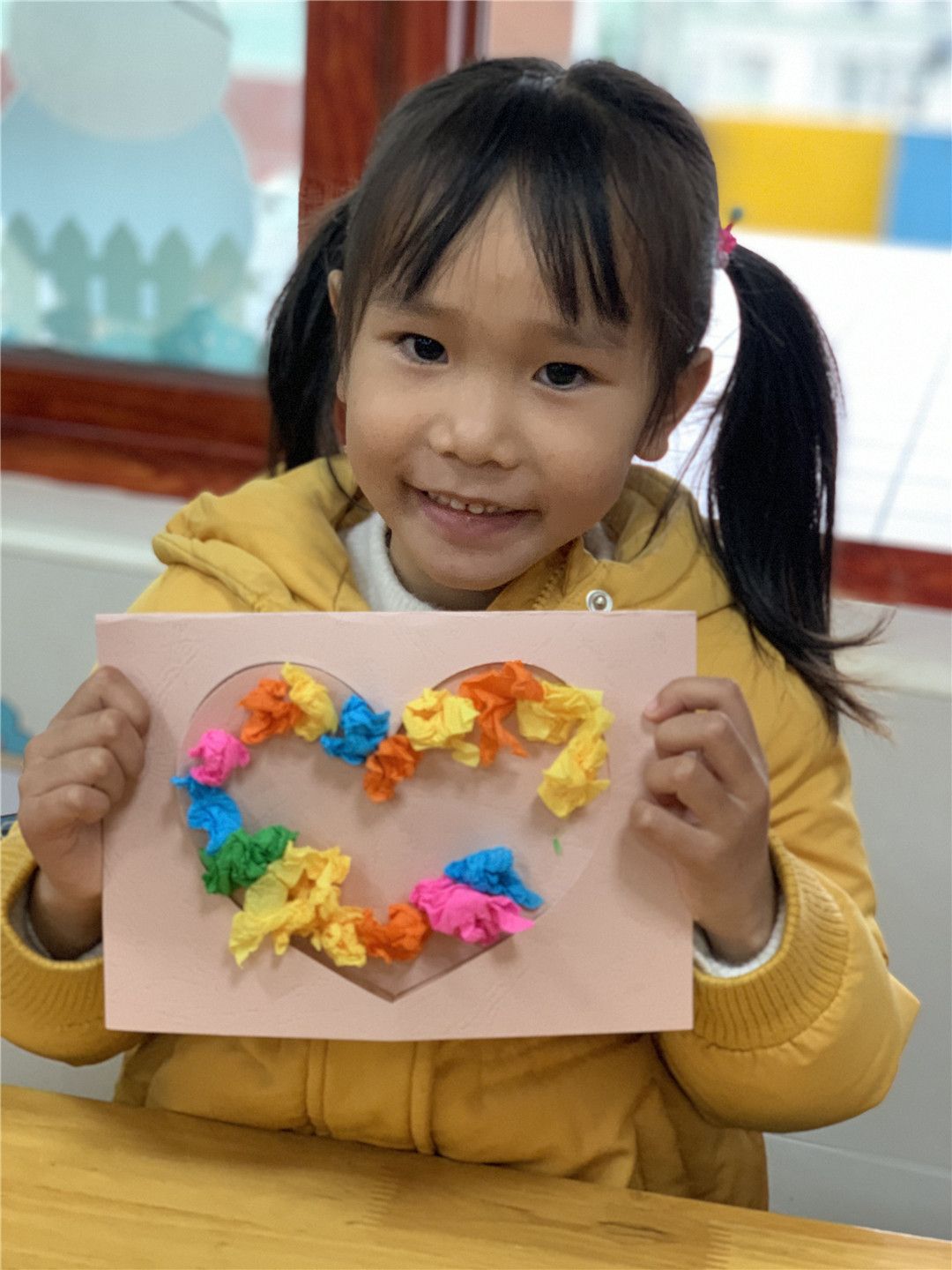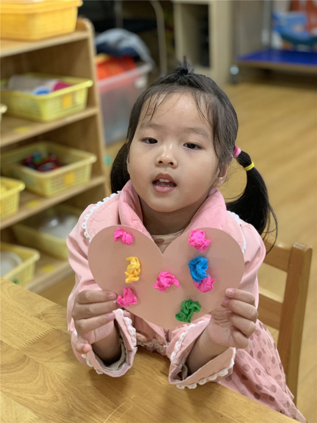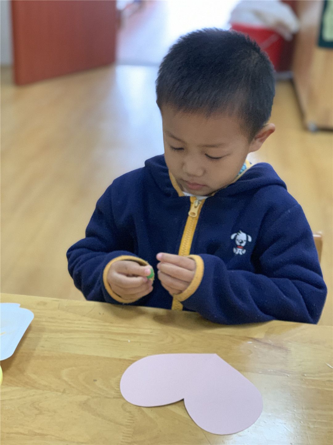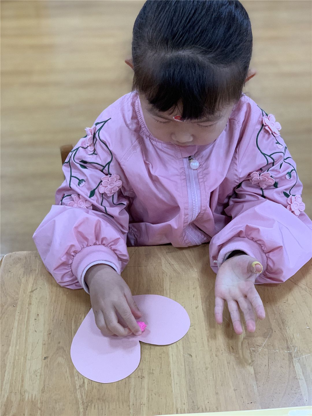 宝贝们在老师的指导下有条不紊地撕着手中的皱纹纸,接着细心地涂上胶水将“爱心卡”进行装饰。