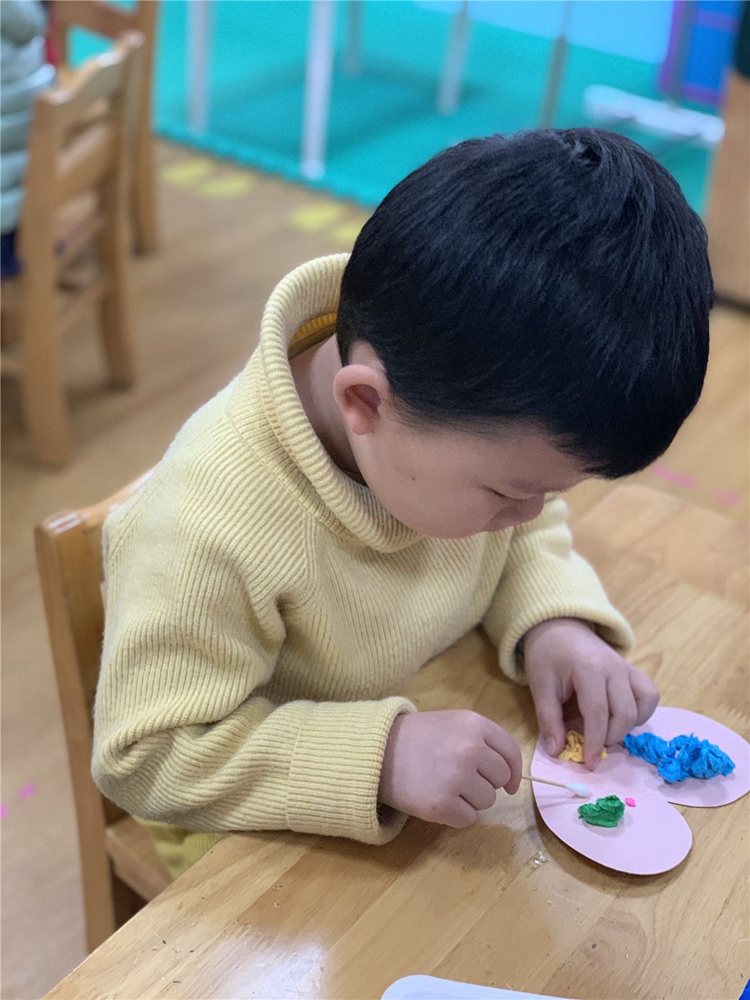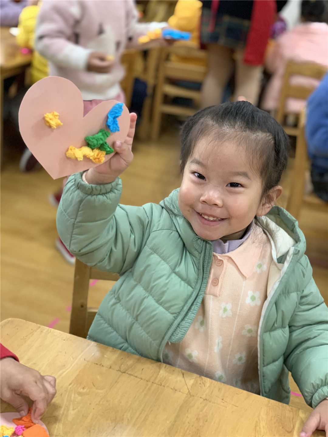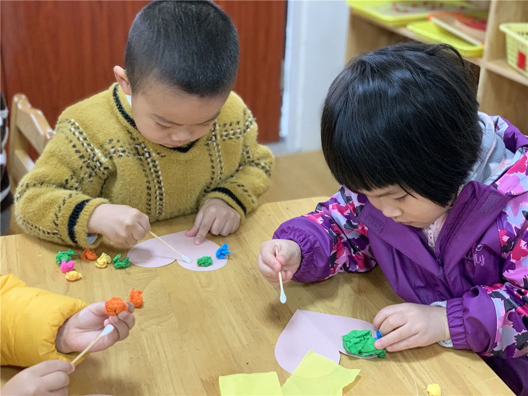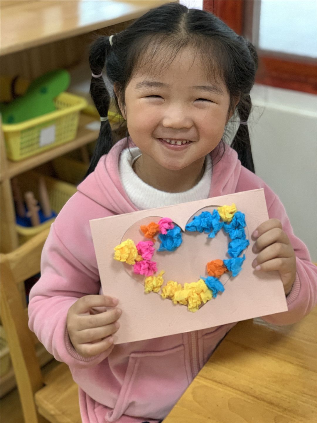 宝贝们在老师的指导下有条不紊地撕着手中的皱纹纸,接着细心地涂上胶水将“爱心卡”进行装饰。
