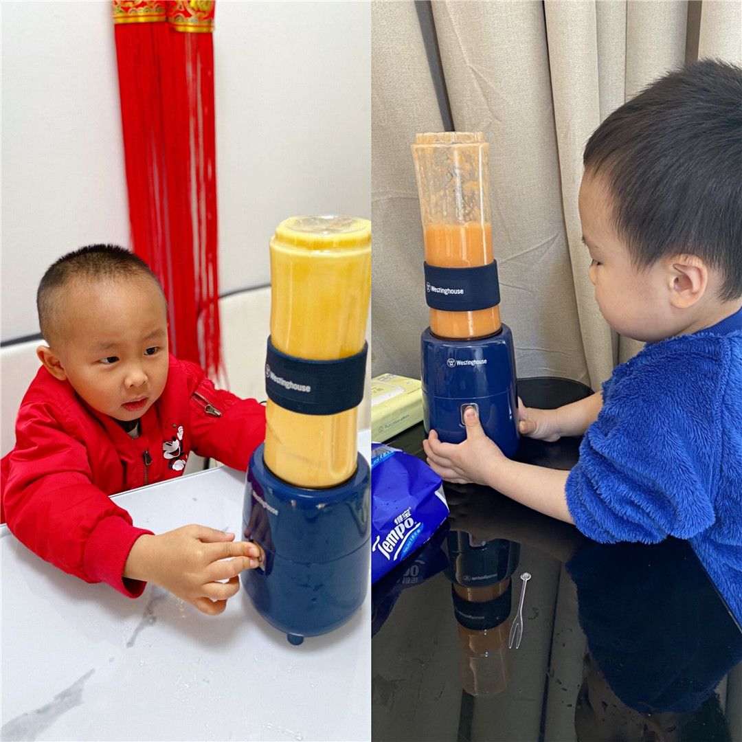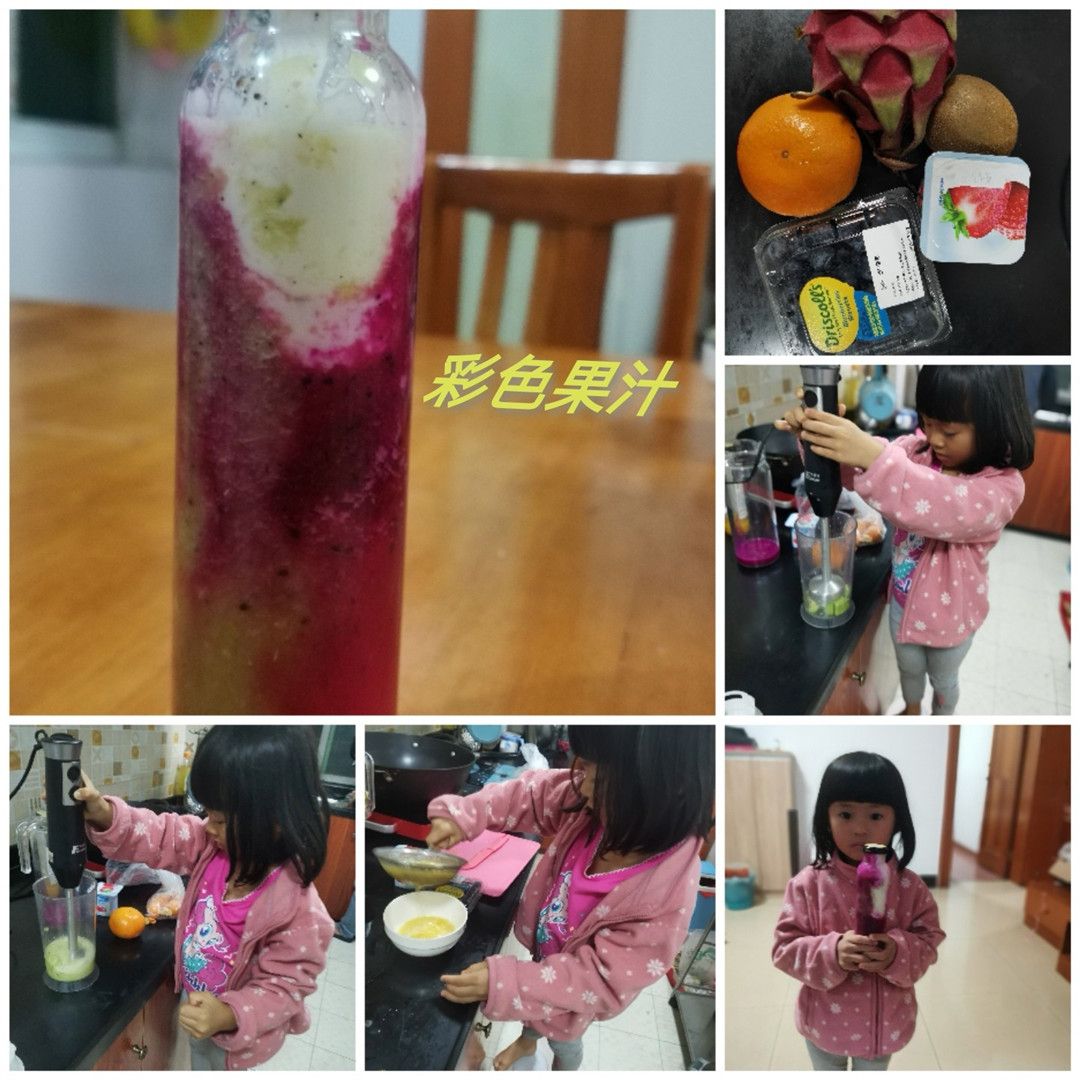 看,我们用水果榨出了五颜六色的果汁。红色的西红柿汁,紫色的火龙果汁,黄色的黄桃汁,水果汁又好看又好喝还有营养,记得每天喝一杯呦!