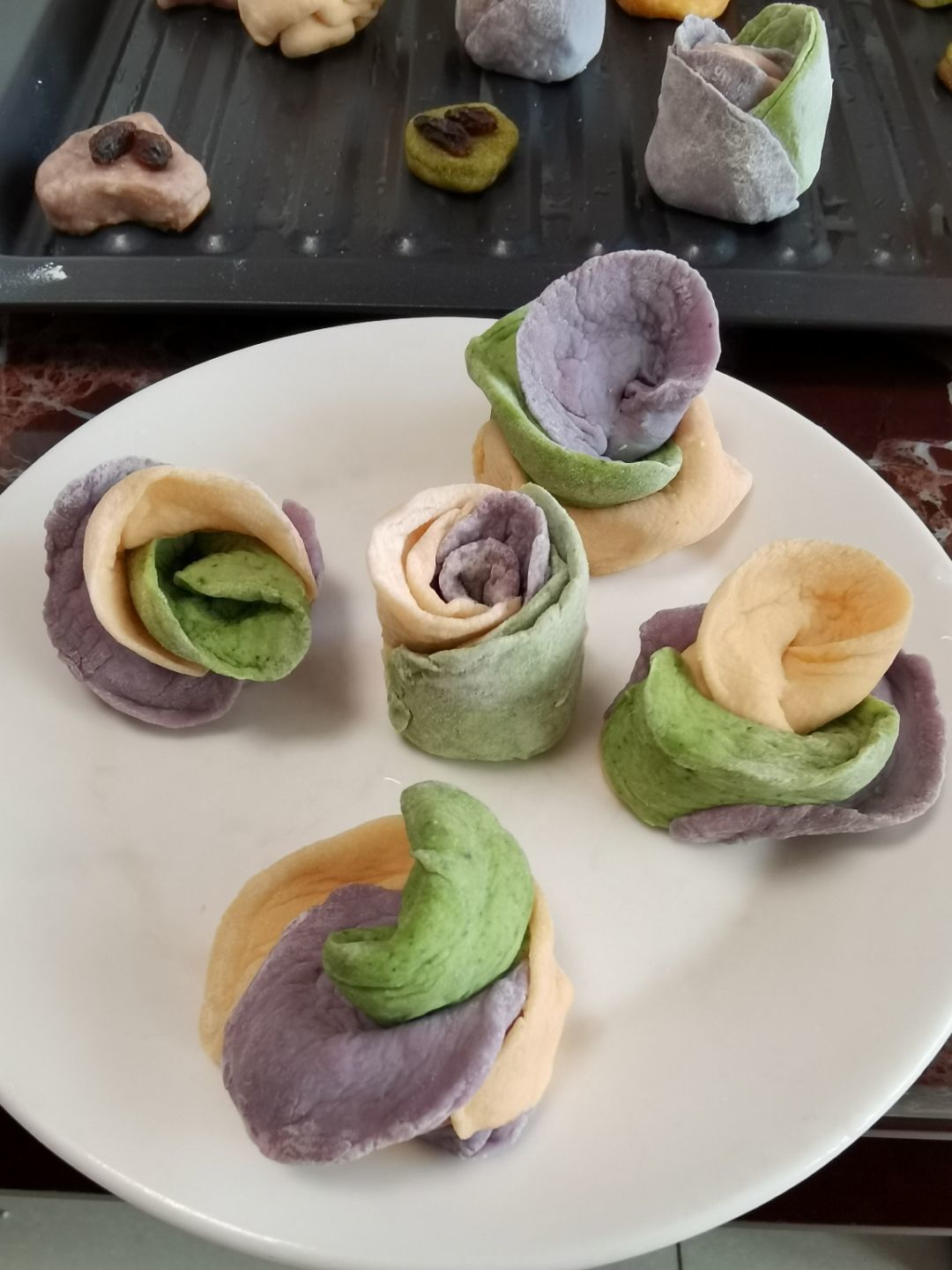 我和妈妈一起做的彩色玫瑰面包,好漂亮!