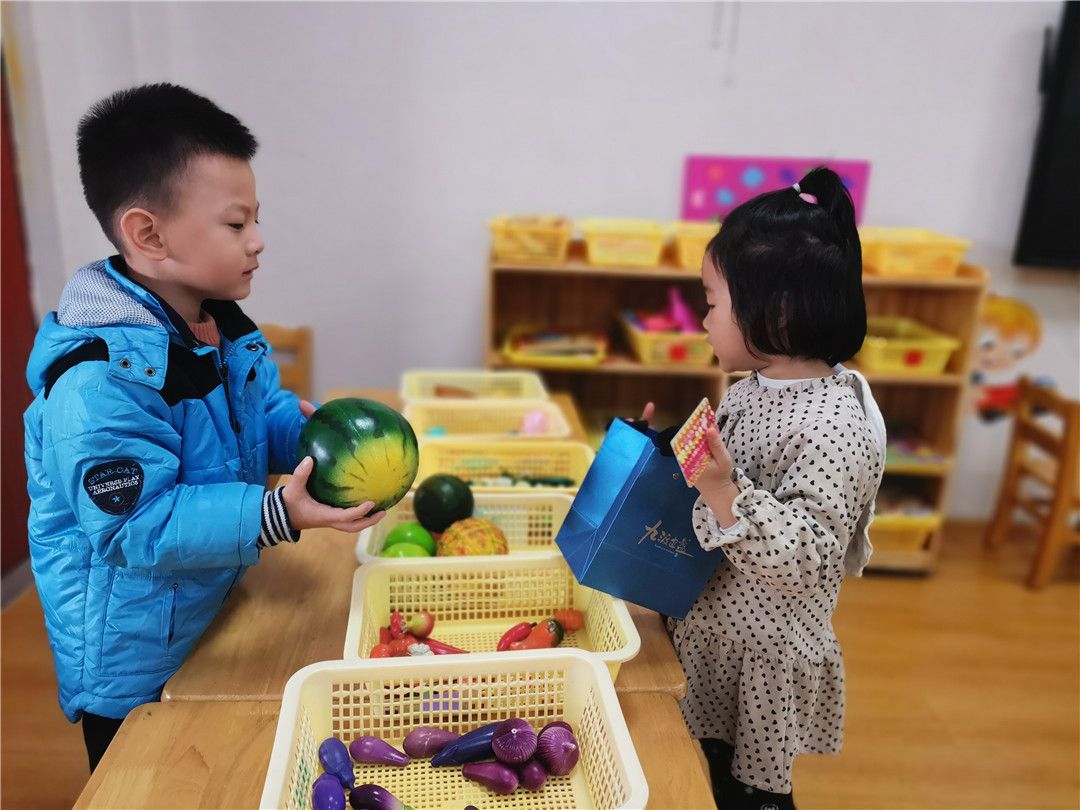 滴答!厦大超市到啦!请下车啦!厦大超市里真丰富呀!有好吃的糕点,新鲜的蔬菜,还有香甜可口的水果哦!瞧!服务员正在向我们介绍又甜又大的西瓜呢!萌娃们看着琳琅满目的食物,都挑花了眼呢!挑选好了,别忘了还要刷卡结账呢!一个接一个,排好队哦!