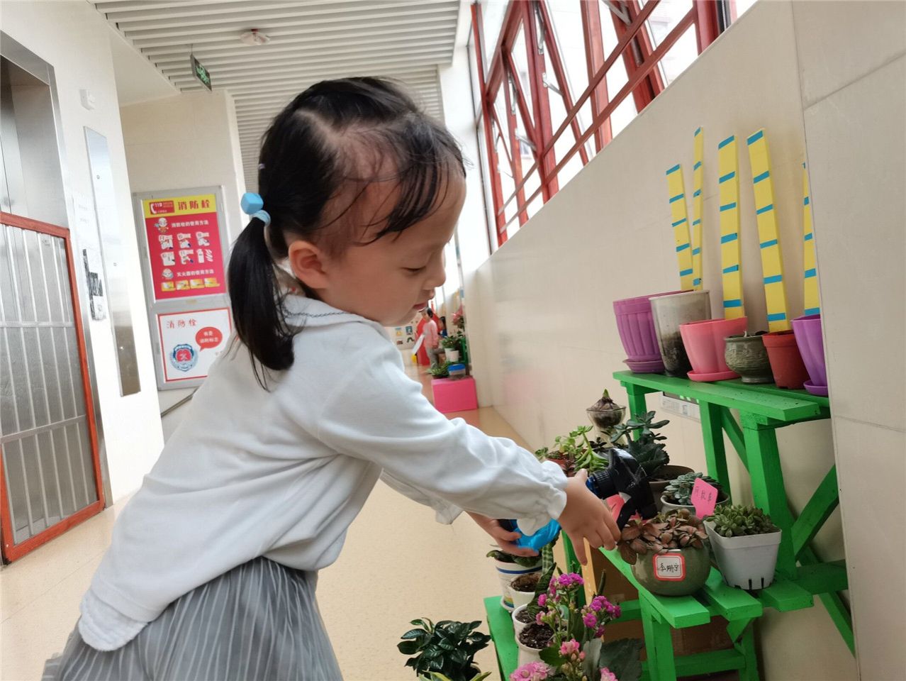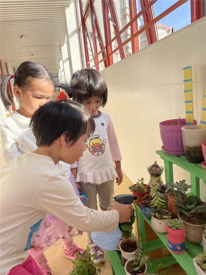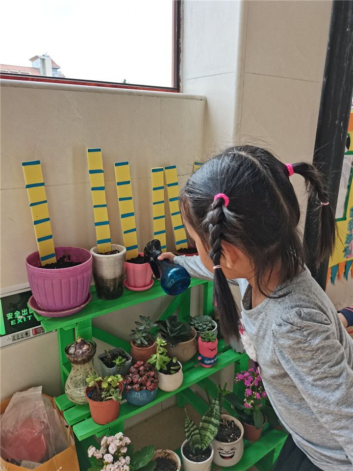 自然角可以近距离的观察植物的生长,是宝贝们丰富自然知识的途径之一。每天饭后都是宝贝们给小植物们浇浇水的时间哦!别看小四班得宝贝们小,照顾起植物来也是很认真的呢!