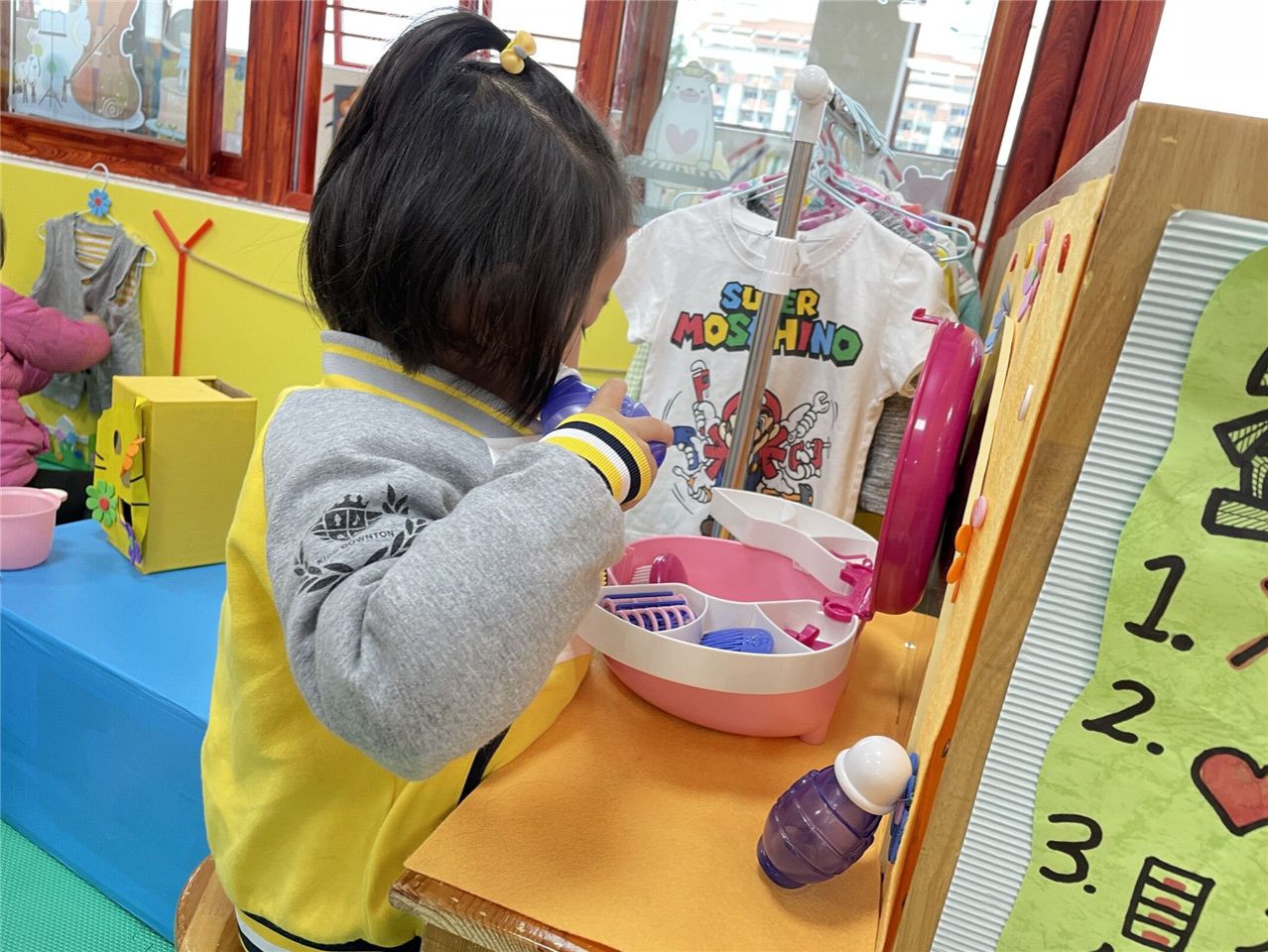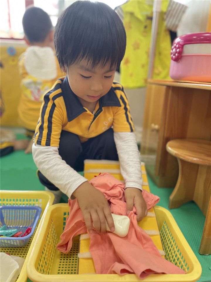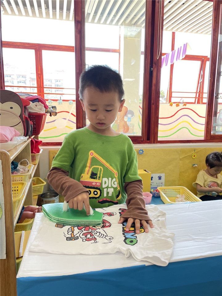 生活区是我们觉得最简单最日常的区域啦!但对孩子们来说可不简单呢。你看洗衣服,洗手帕,晾衣服,晾手帕。晾干了还要把衣服熨好折起来收到柜子里面呢!不仅如此还有等待喂食的小猫,等待换衣服的宝宝,宝贝们可忙坏了!