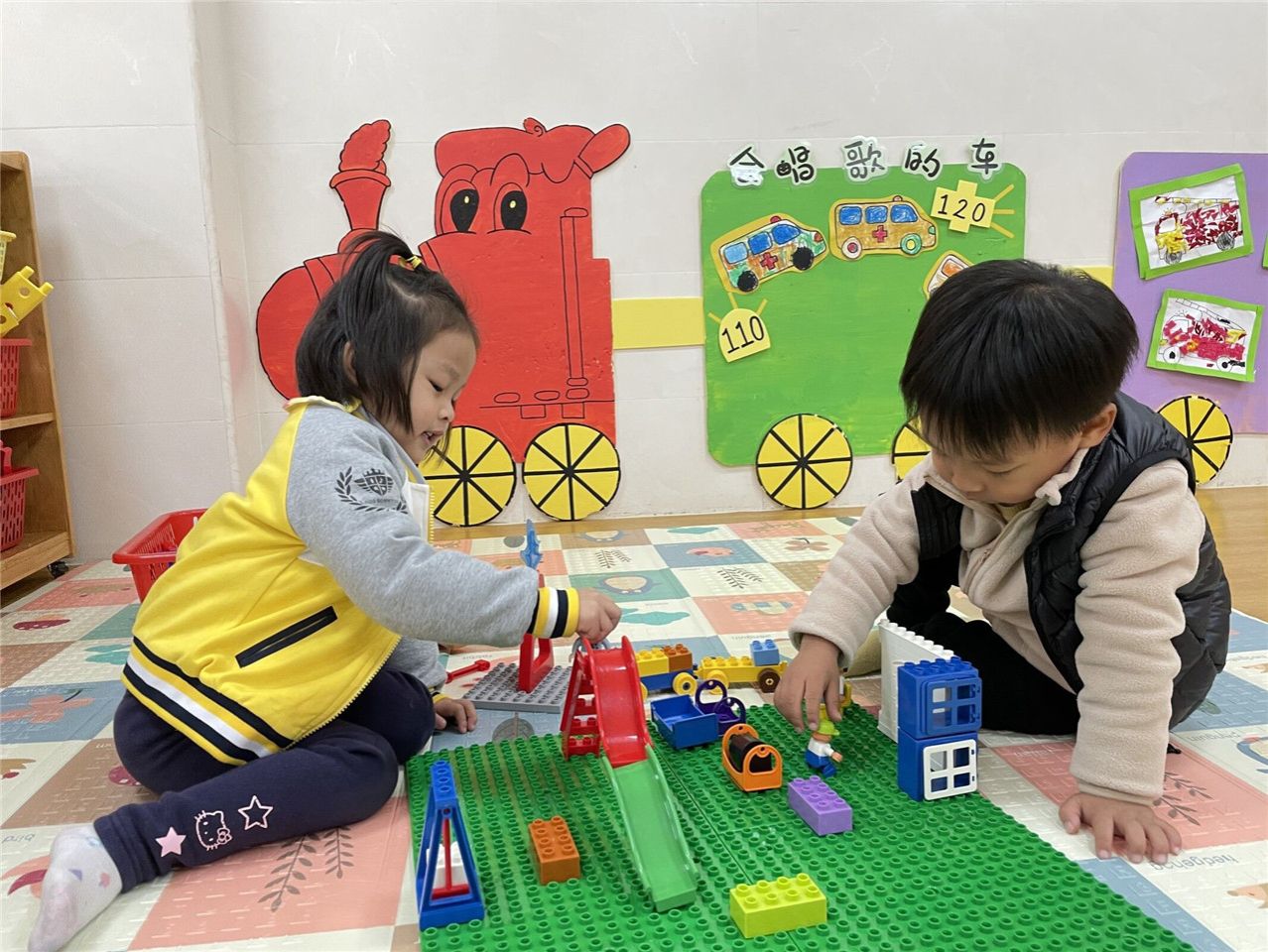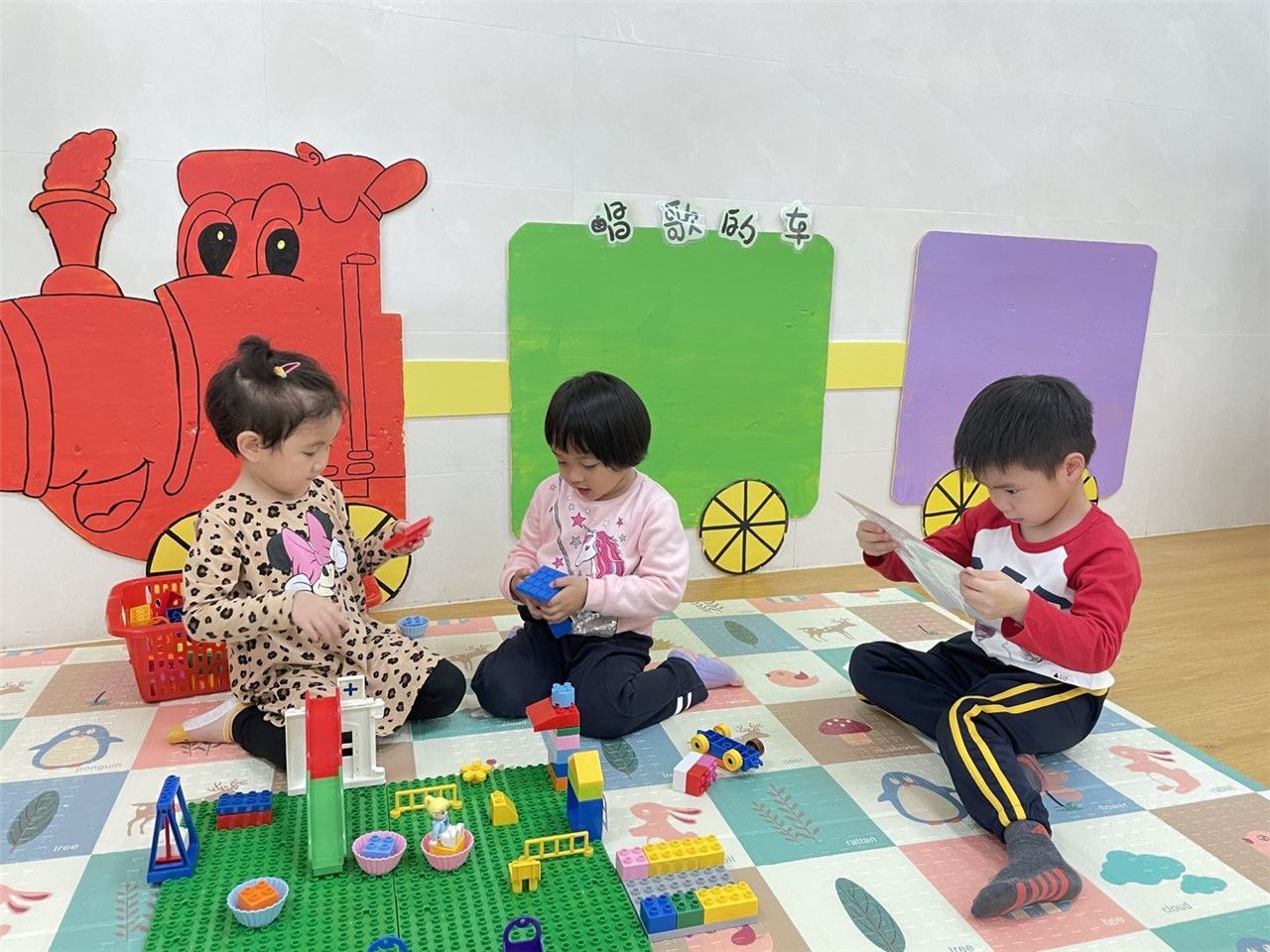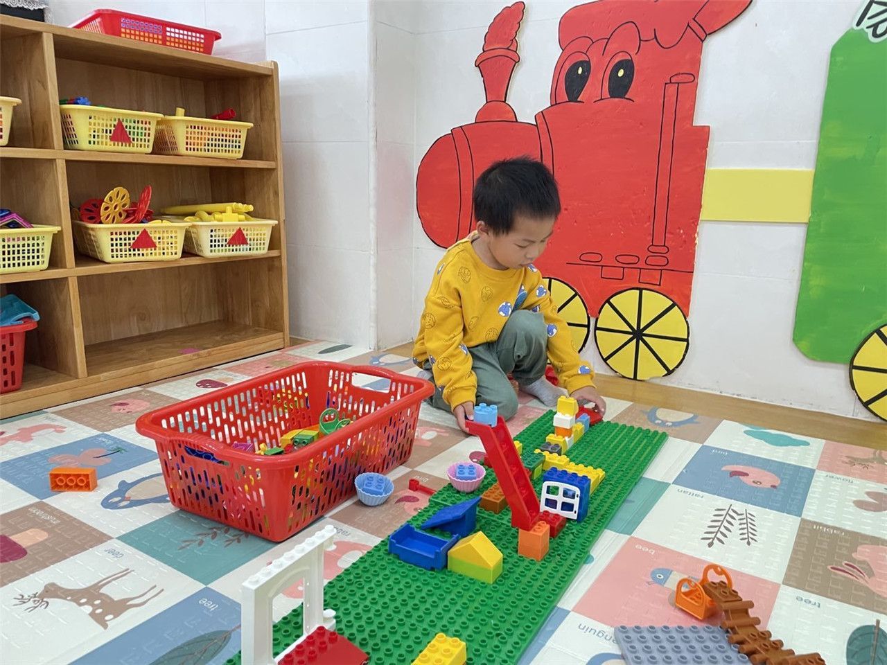 看!在建构区里宝贝们可以利用各种建筑材料进行游戏。可以根据自己的想象搭建各种各样喜欢的物品。一起分享积木,一起合作搭建可有意思了。看宝贝们在搭建积木时多开心呀。
