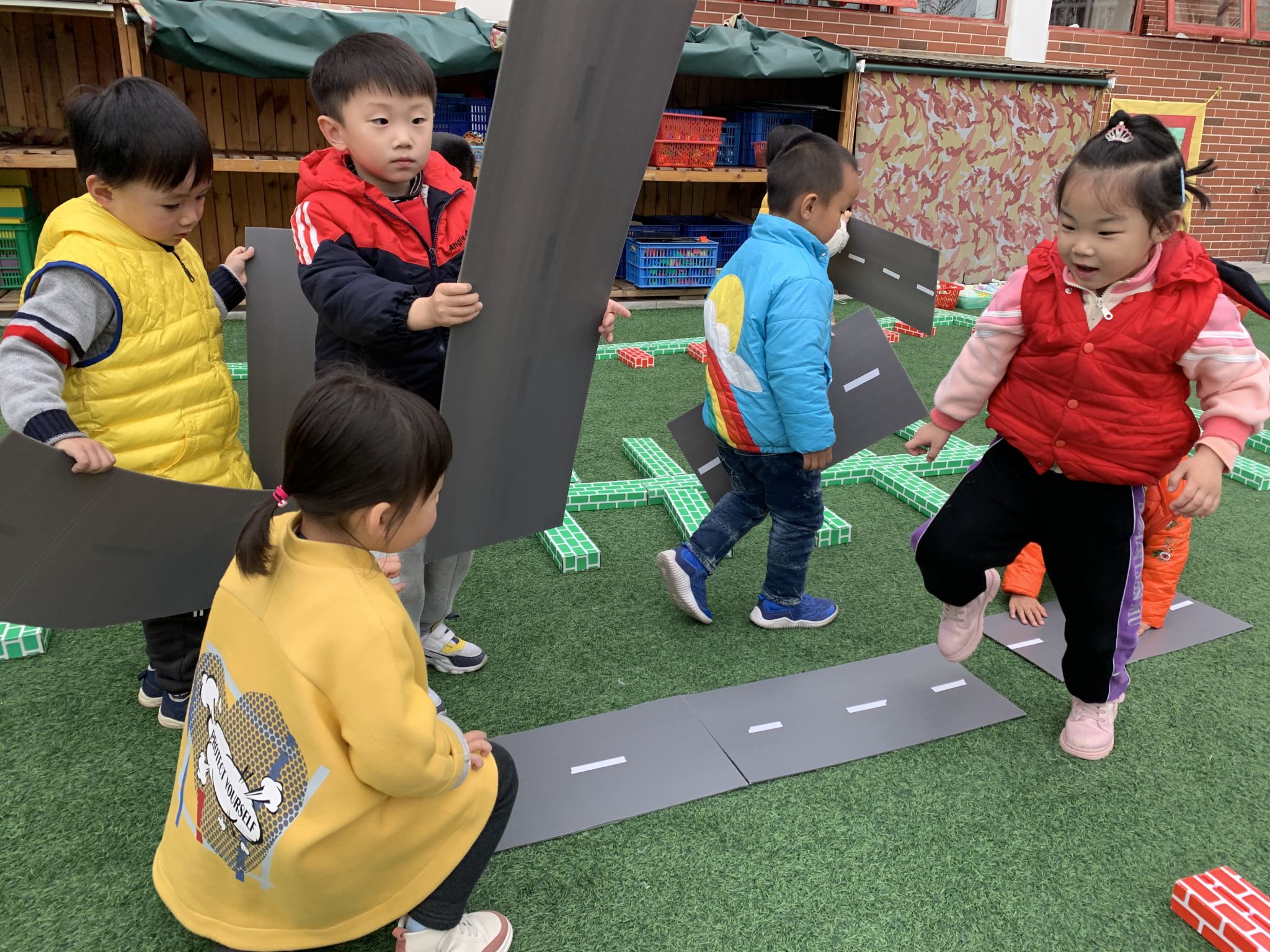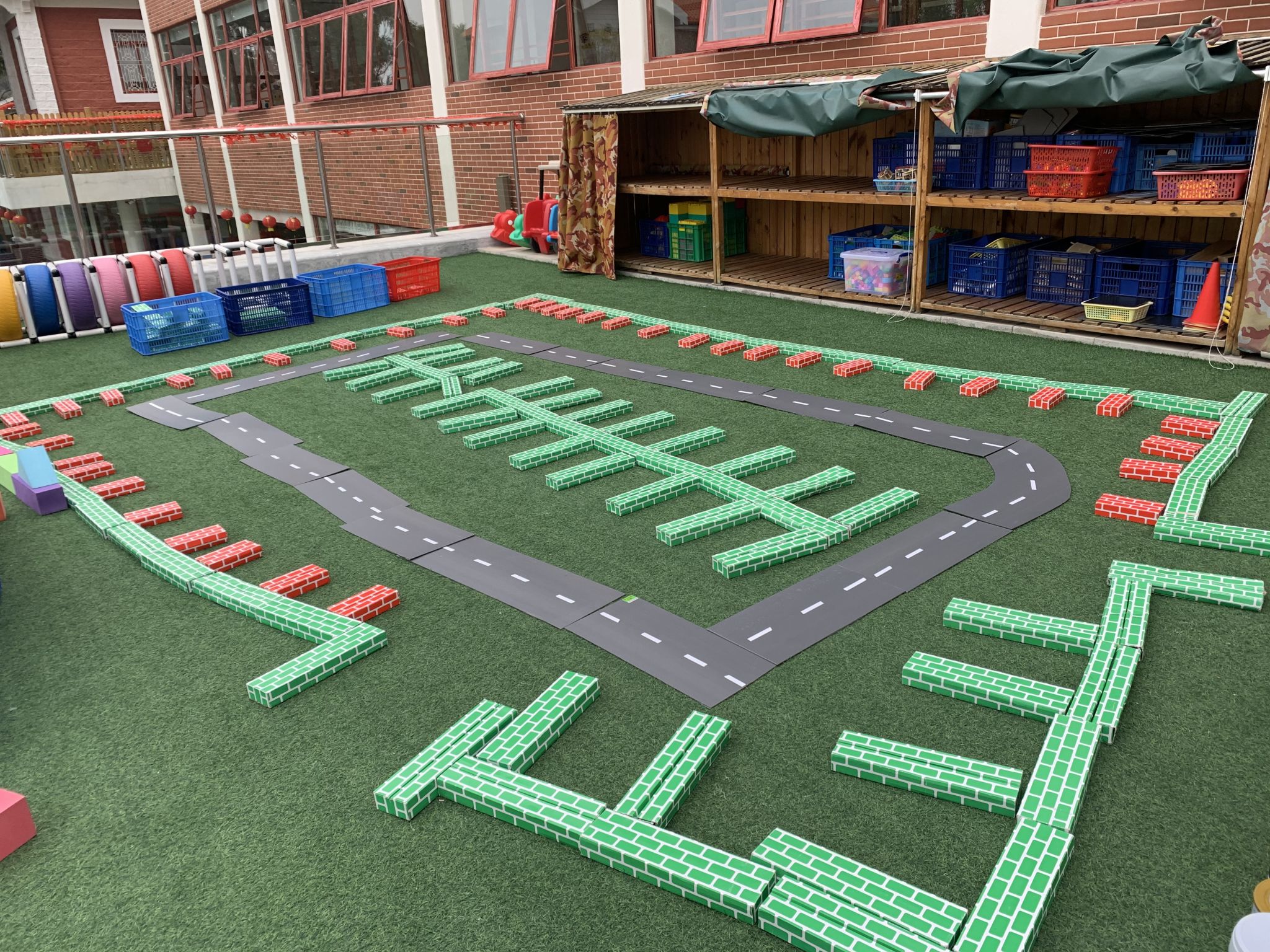 “这是我用纸砖头围的停车场的围墙,是绿色的,我们要建一个大停车场。”