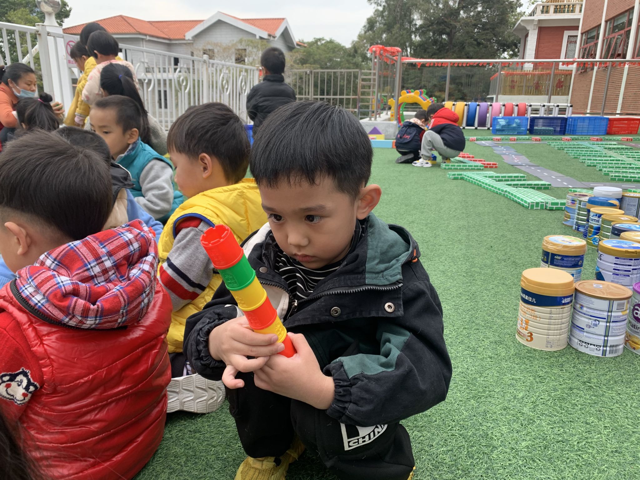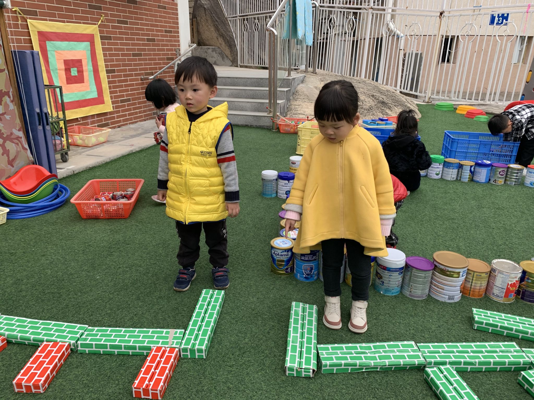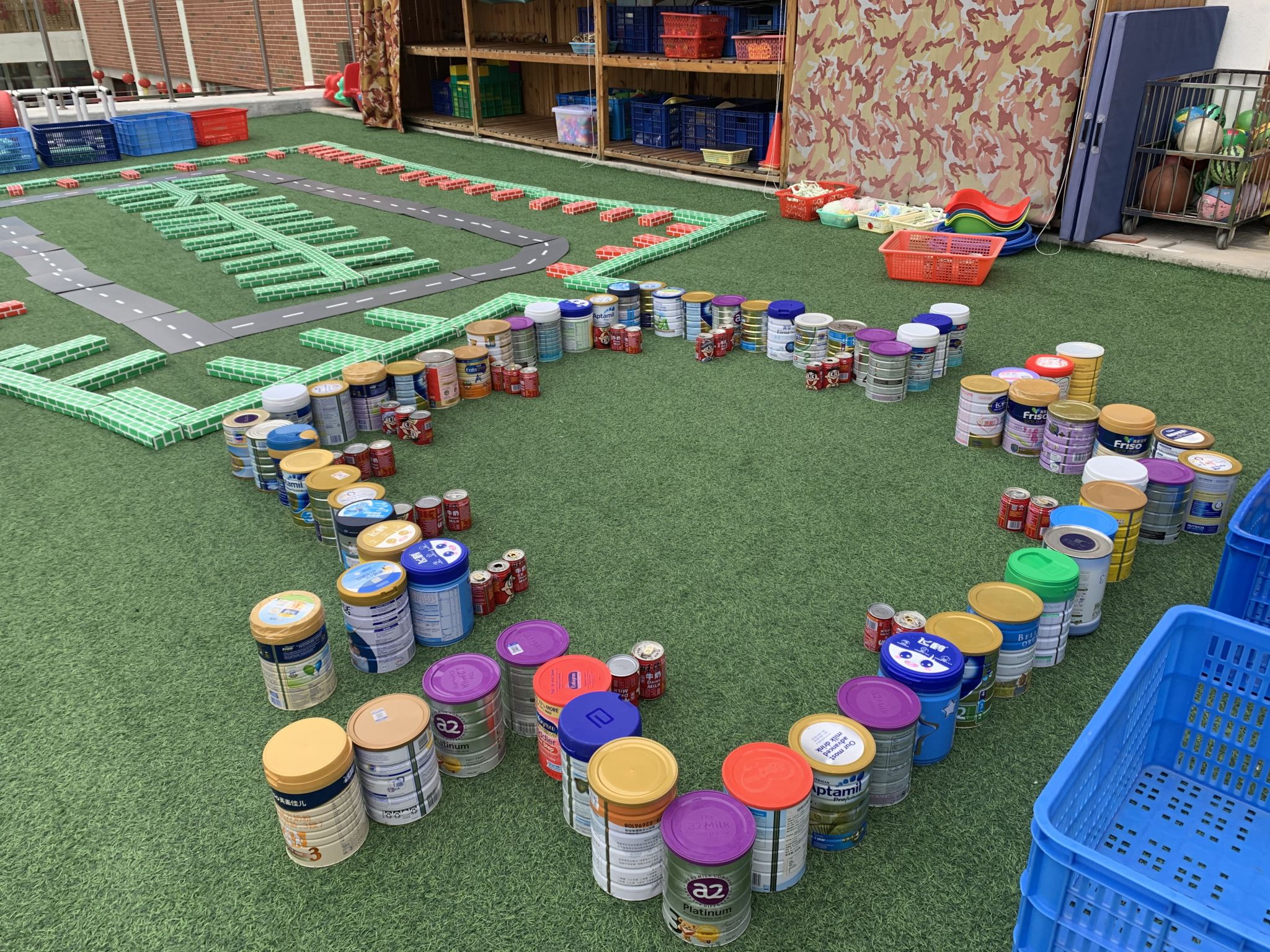 看,这些奶粉罐在小工程师的手上变成了建筑材料。我们用奶粉罐围了个小停车场,还用牛奶罐来建停车位噢,是不是很特别!