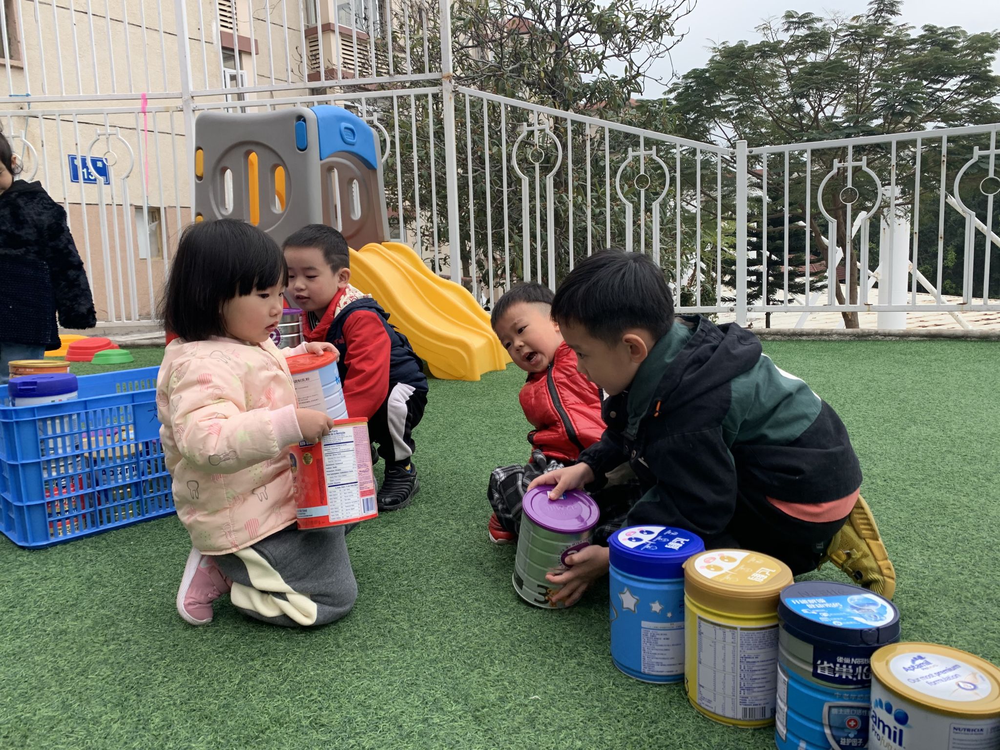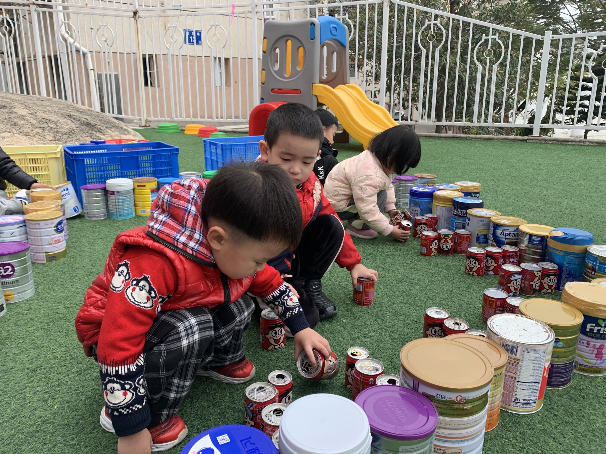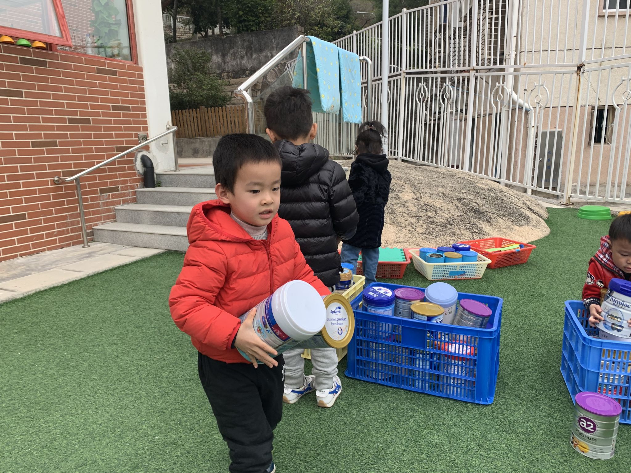 看,这些奶粉罐在小工程师的手上变成了建筑材料。我们用奶粉罐围了个小停车场,还用牛奶罐来建停车位噢,是不是很特别!