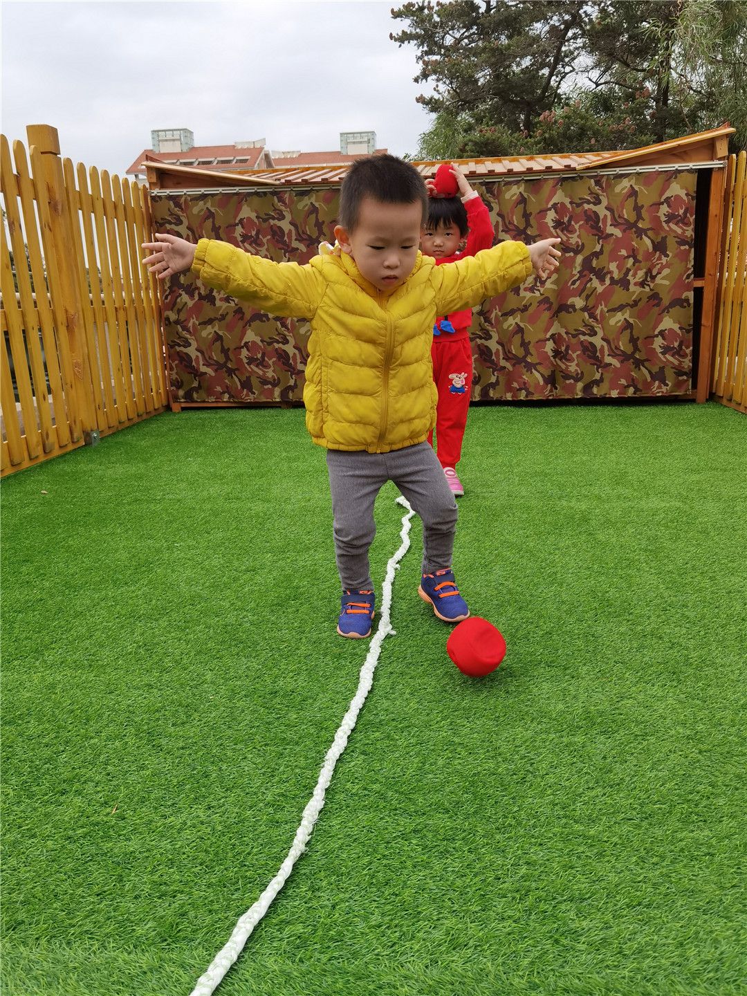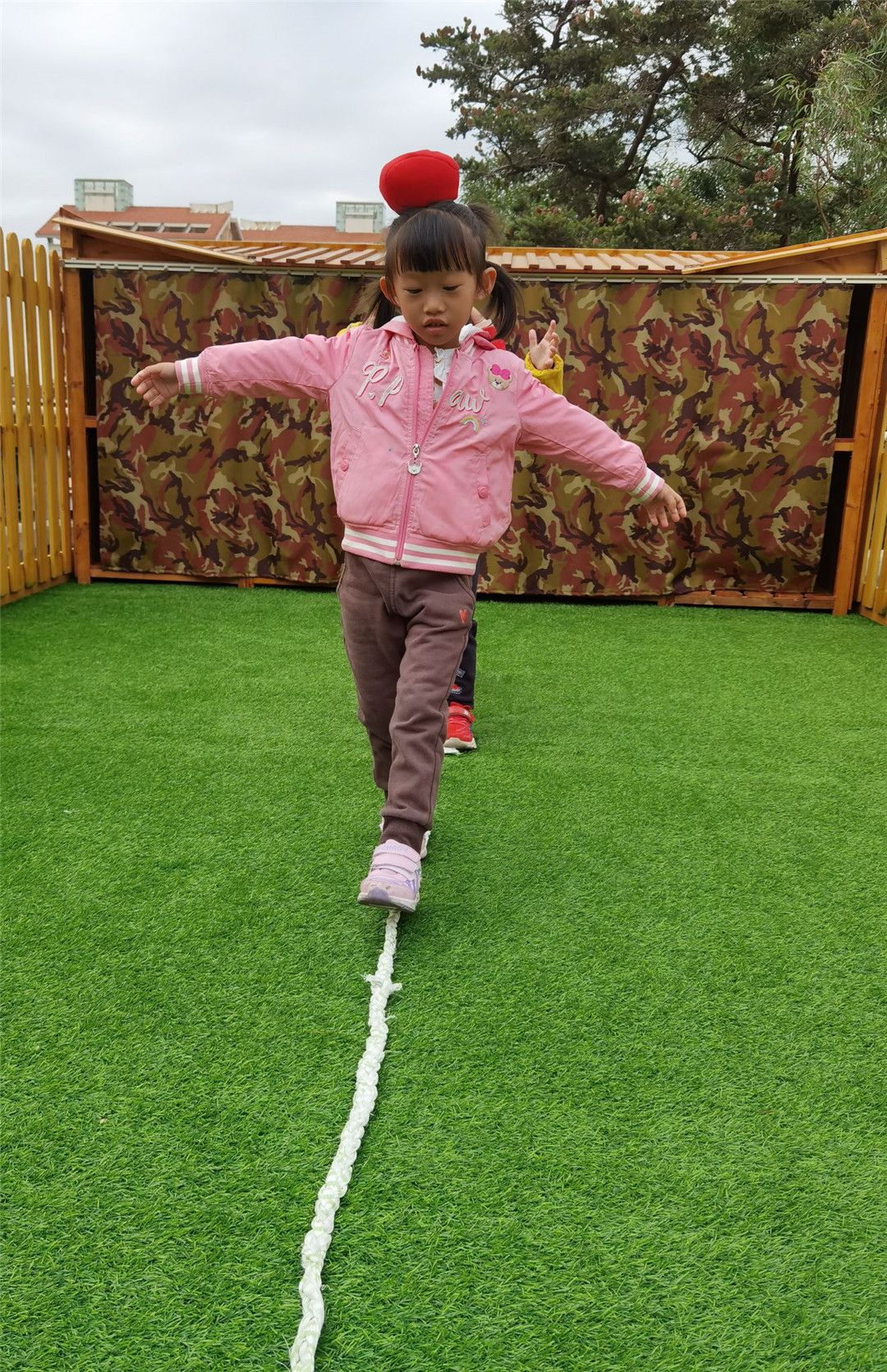 沙包放在头顶慢慢走在直线上,对了,把手张开保持平衡比较不容易掉哦。