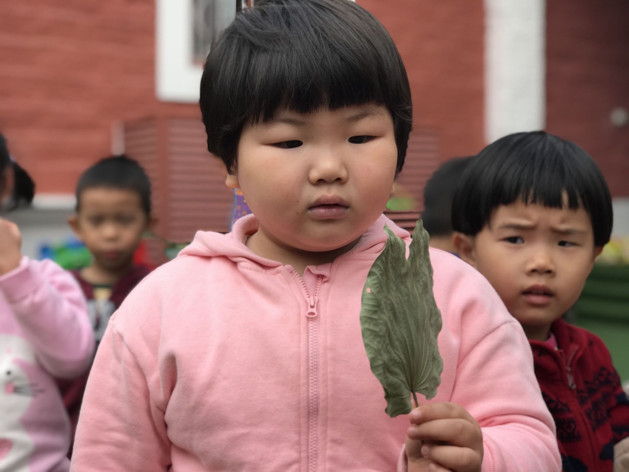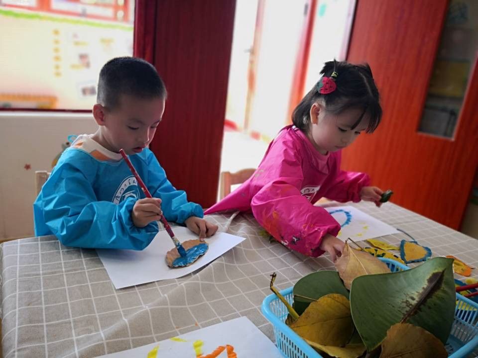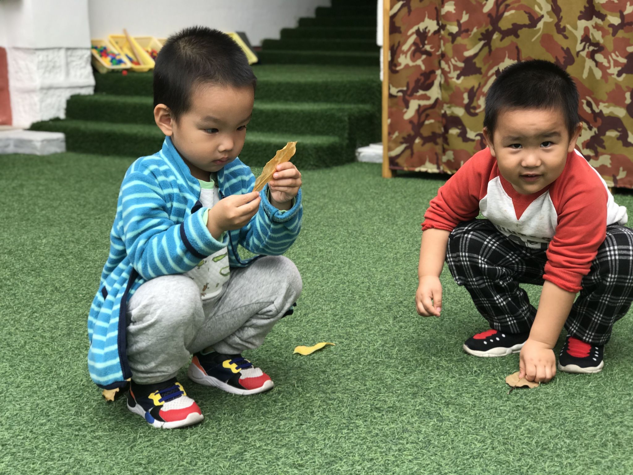 佑佑:你看我的这片落叶都已经卷起来了,和彤彤的不一样,彤彤的还是打开的。
