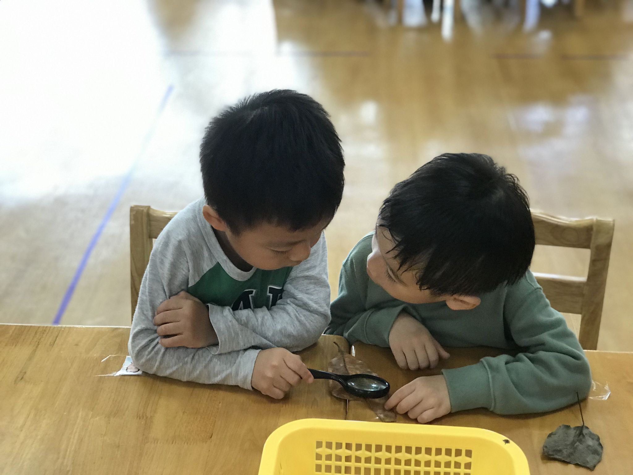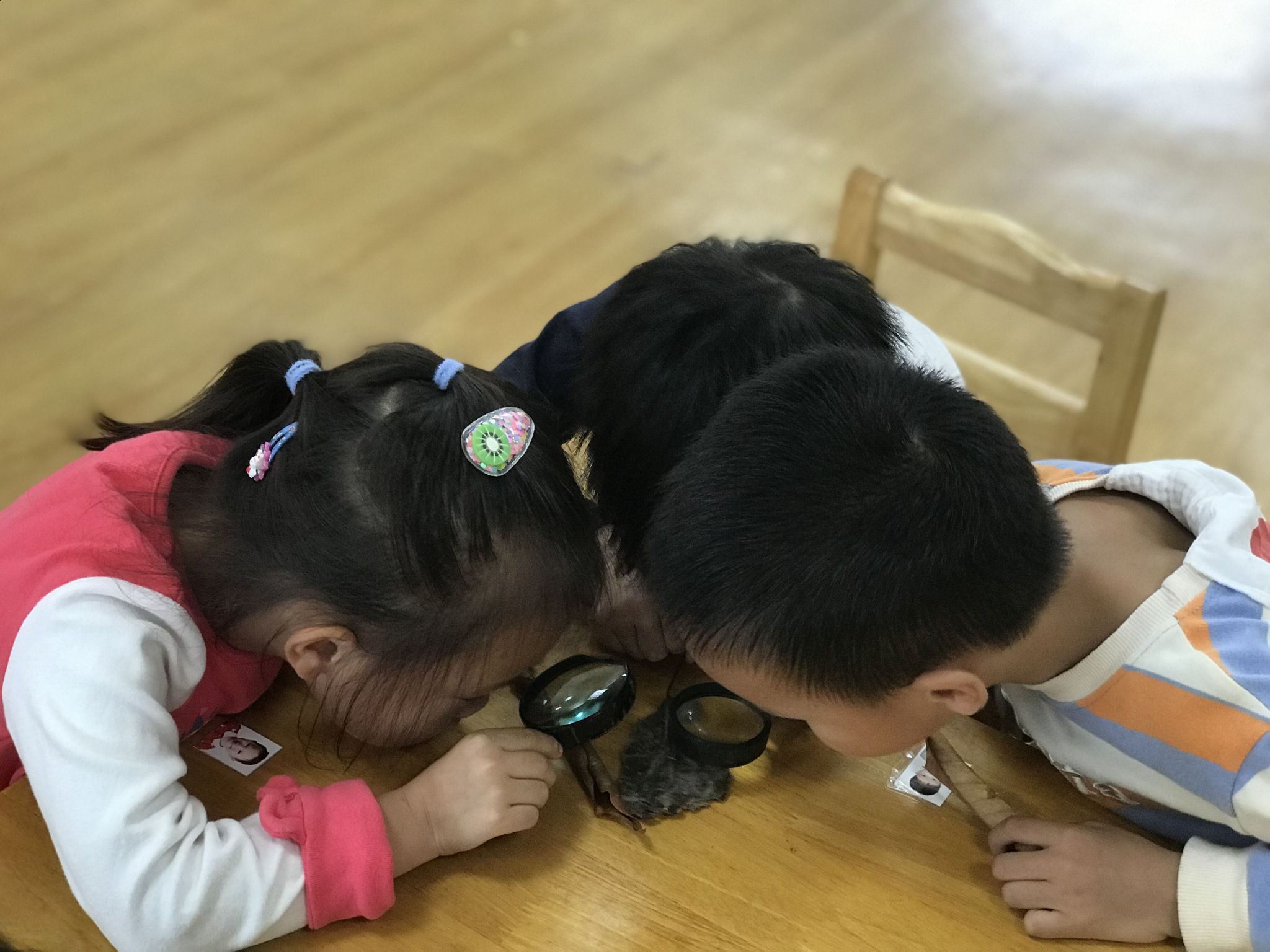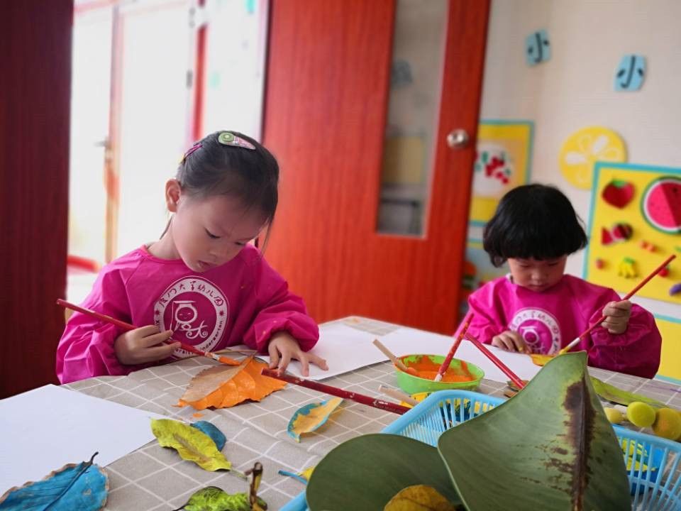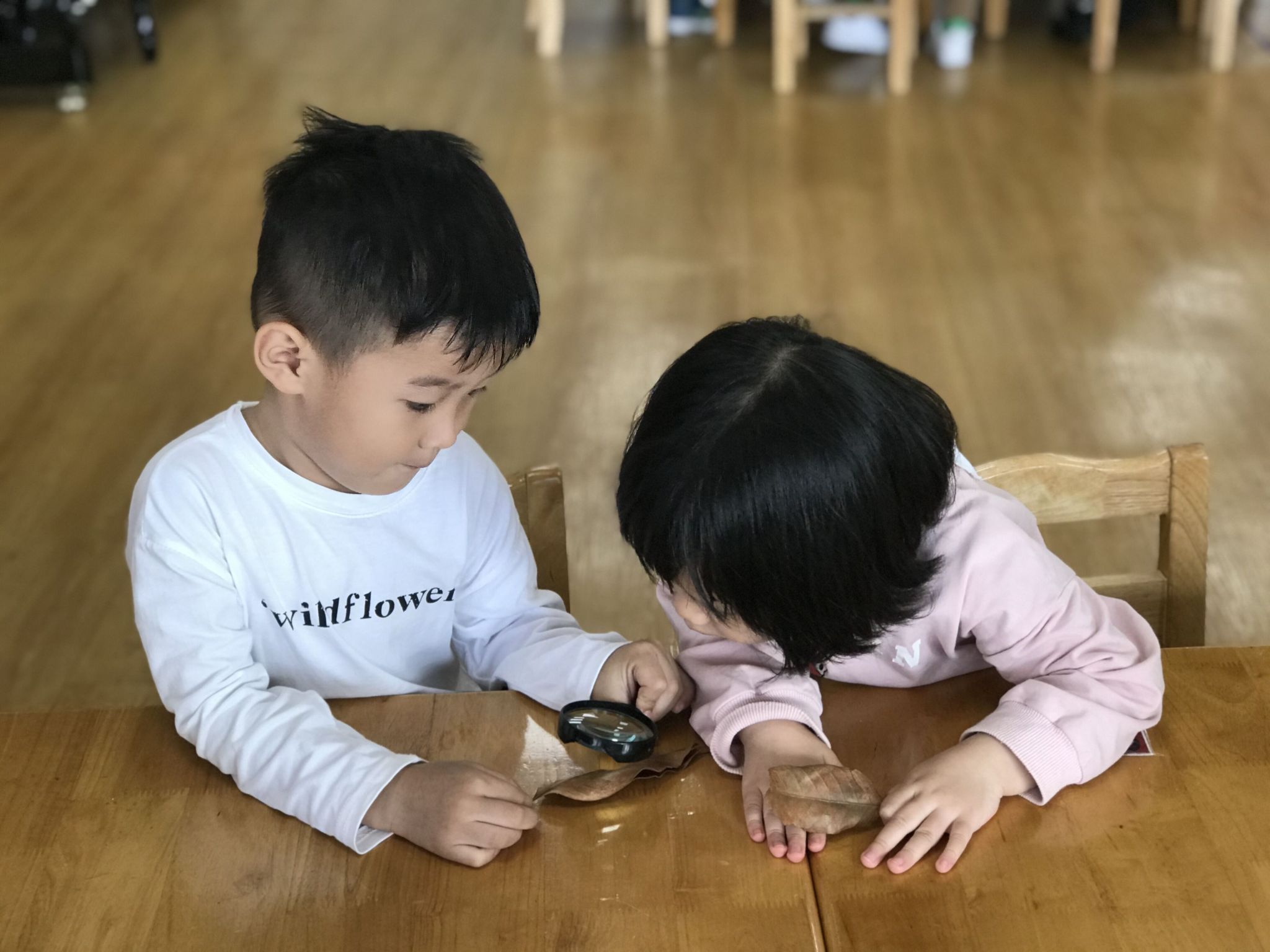 佑佑:你看我的这片落叶都已经卷起来了,和彤彤的不一样,彤彤的还是打开的。