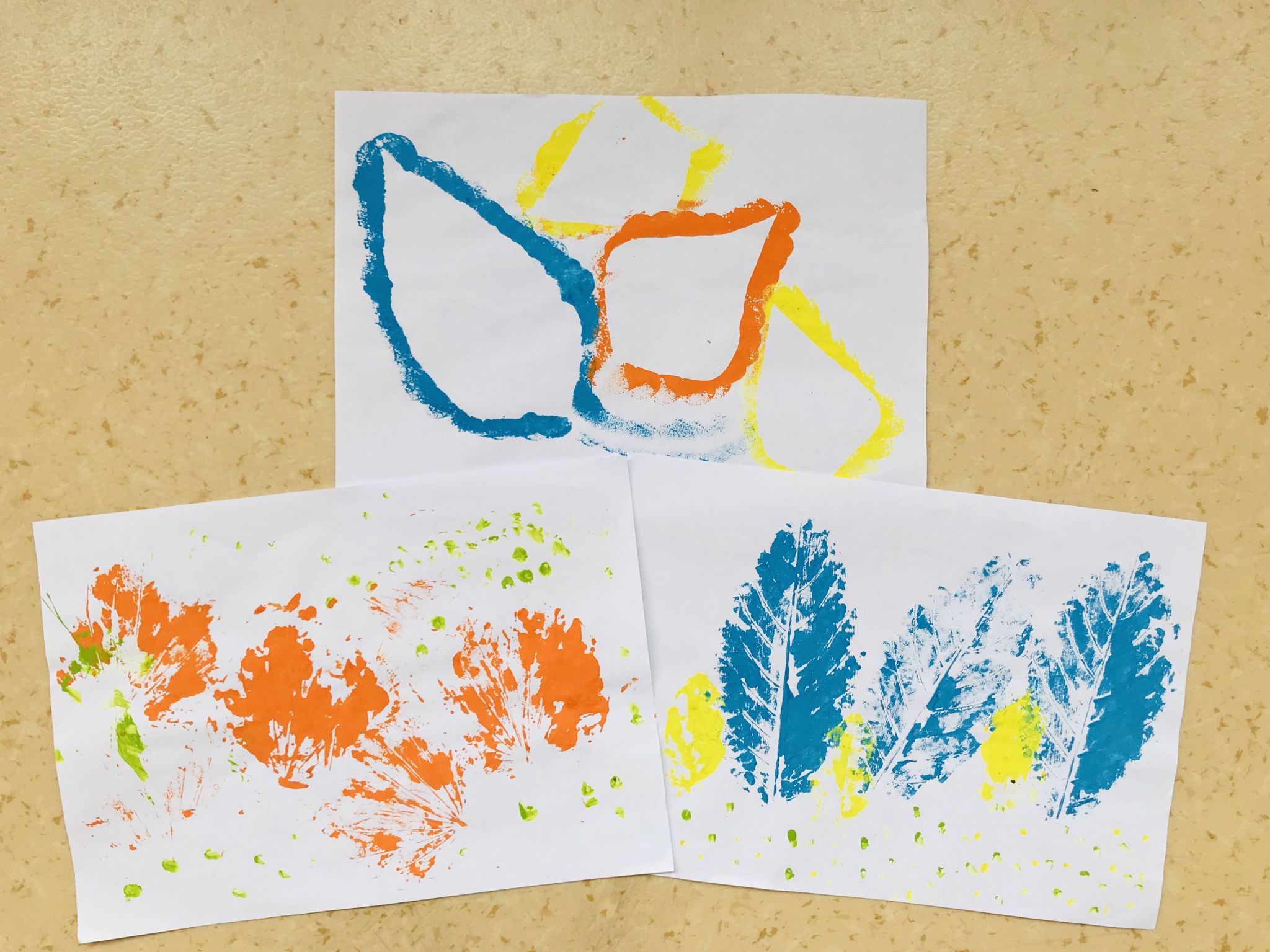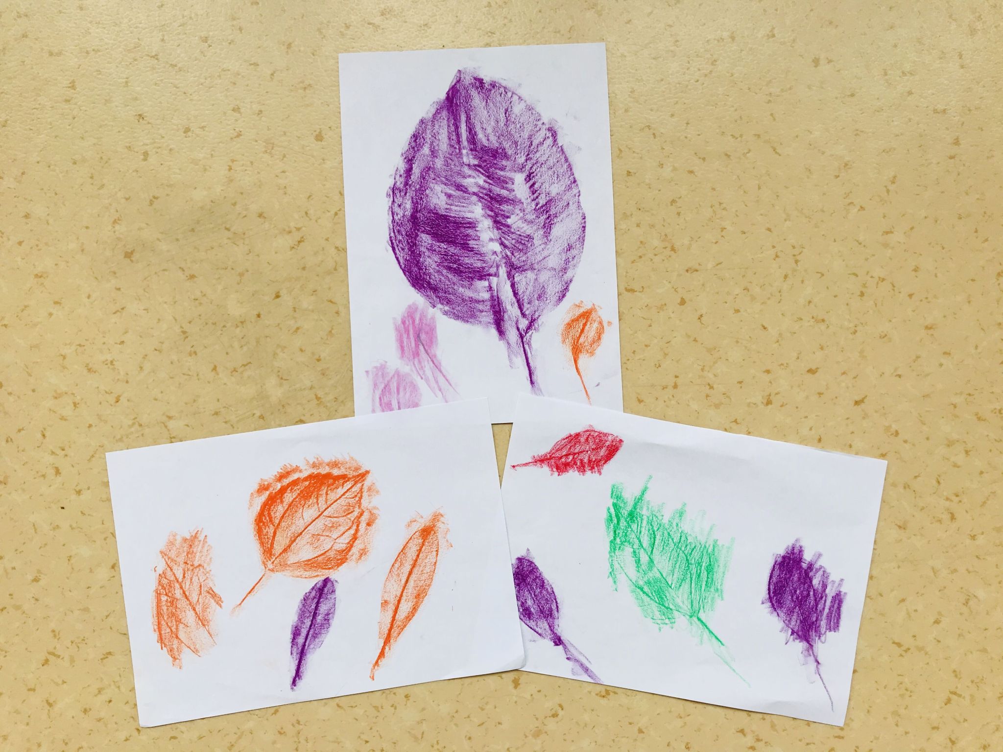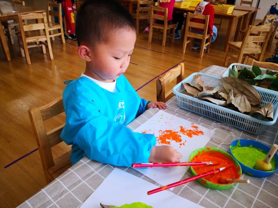 心心:我给落叶涂上我最喜欢的蓝色,蓝色的树叶画送给风爷爷。