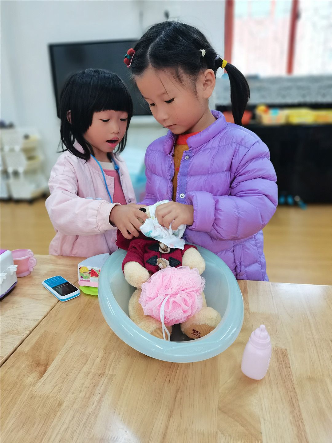 “宝宝该洗洗操啦,出去玩得脏兮兮的,真是的。”