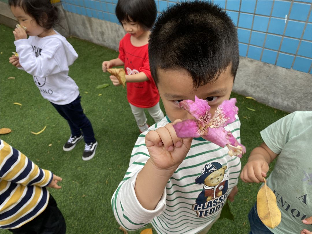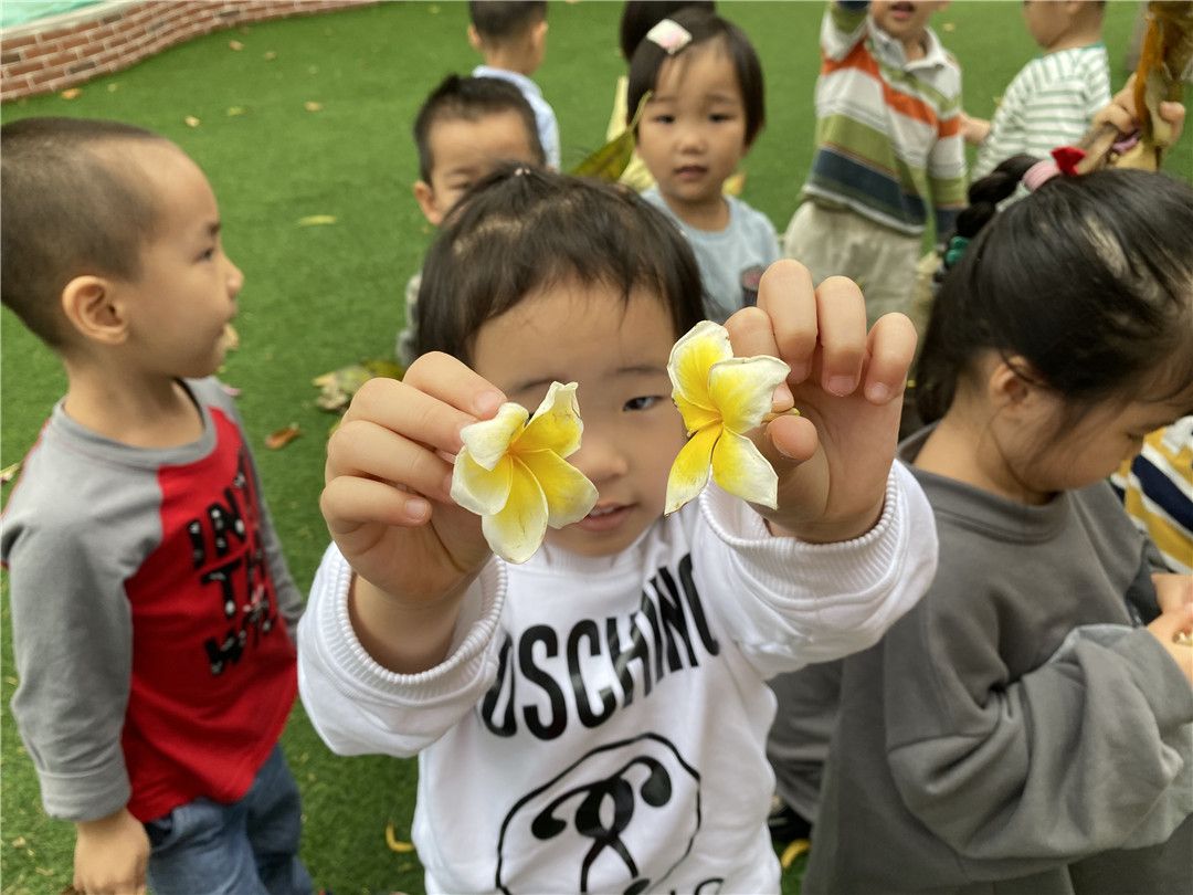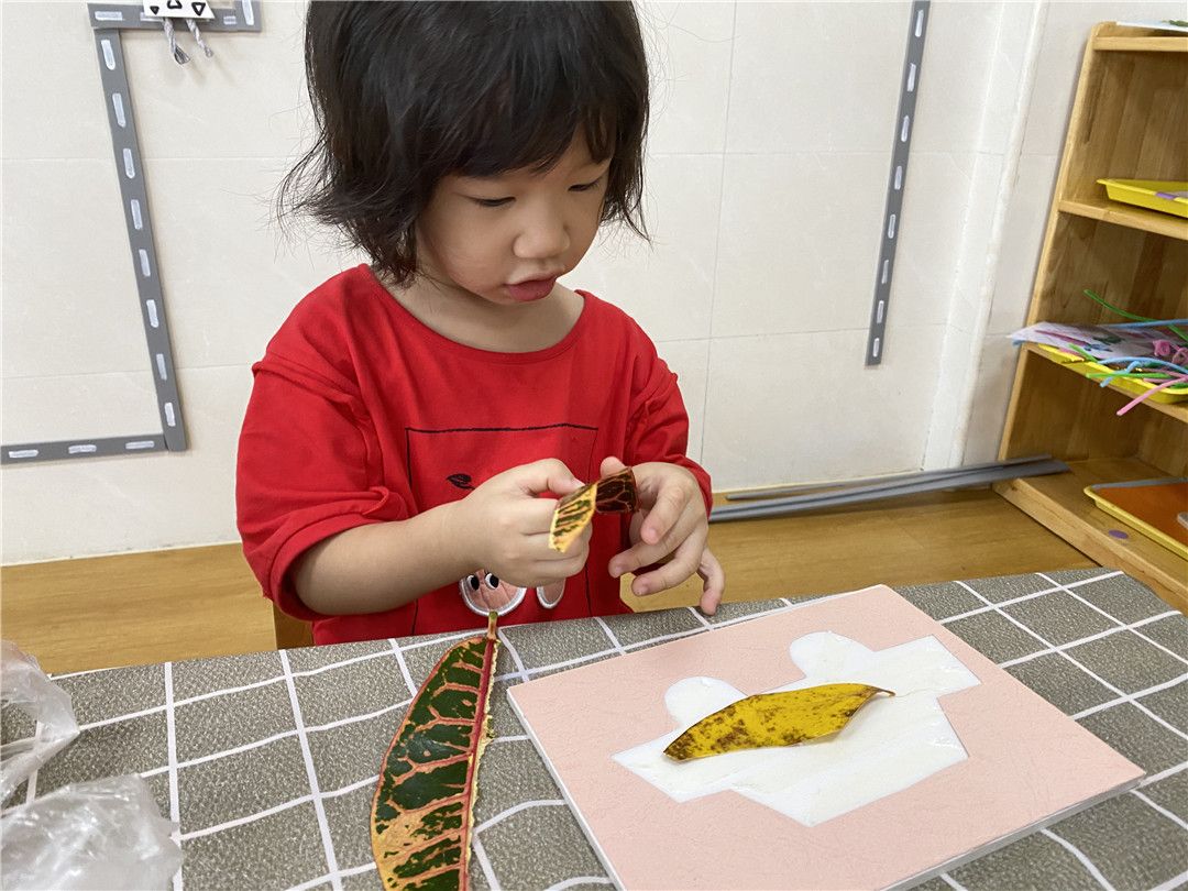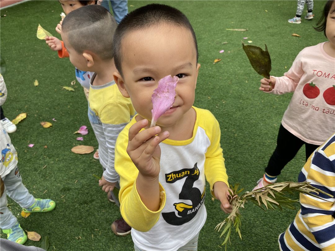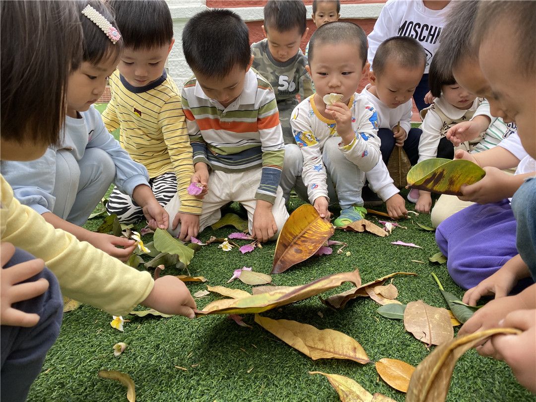 我们美丽的幼儿园也有好多不同的树叶和小花朵呢,我们一起挑选自己喜欢的树叶,你瞧~多美呀!