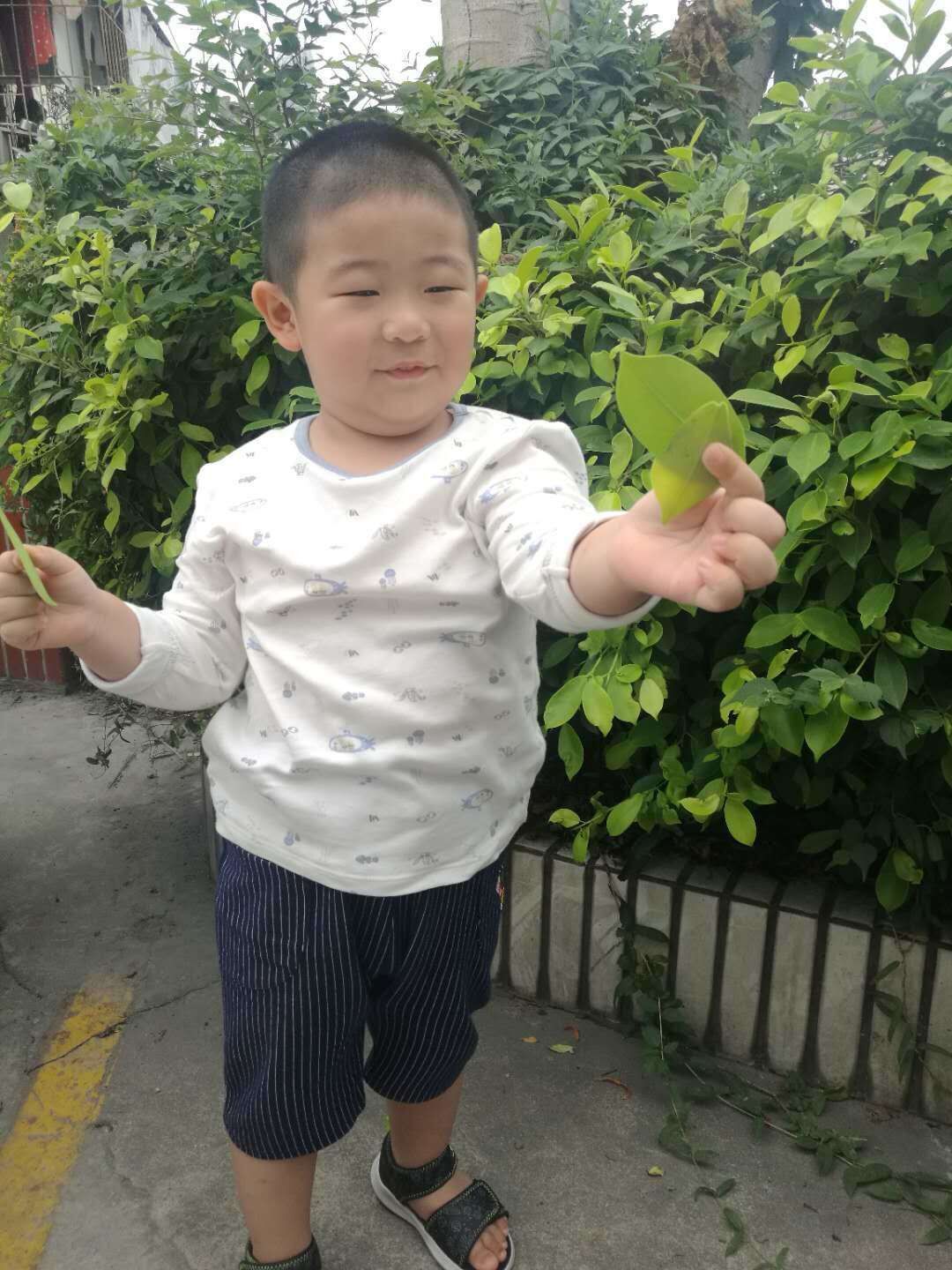 我捡的这片叶子好特别啊,你看像不像一个酸酸的绿柠檬呀!