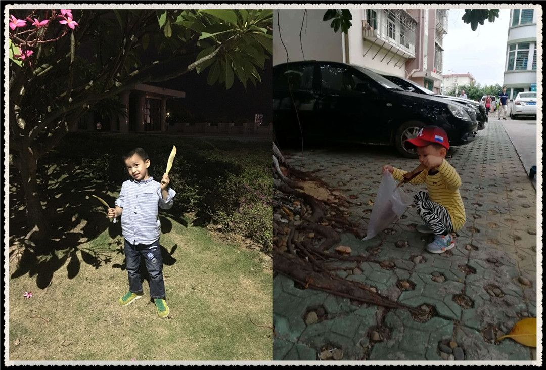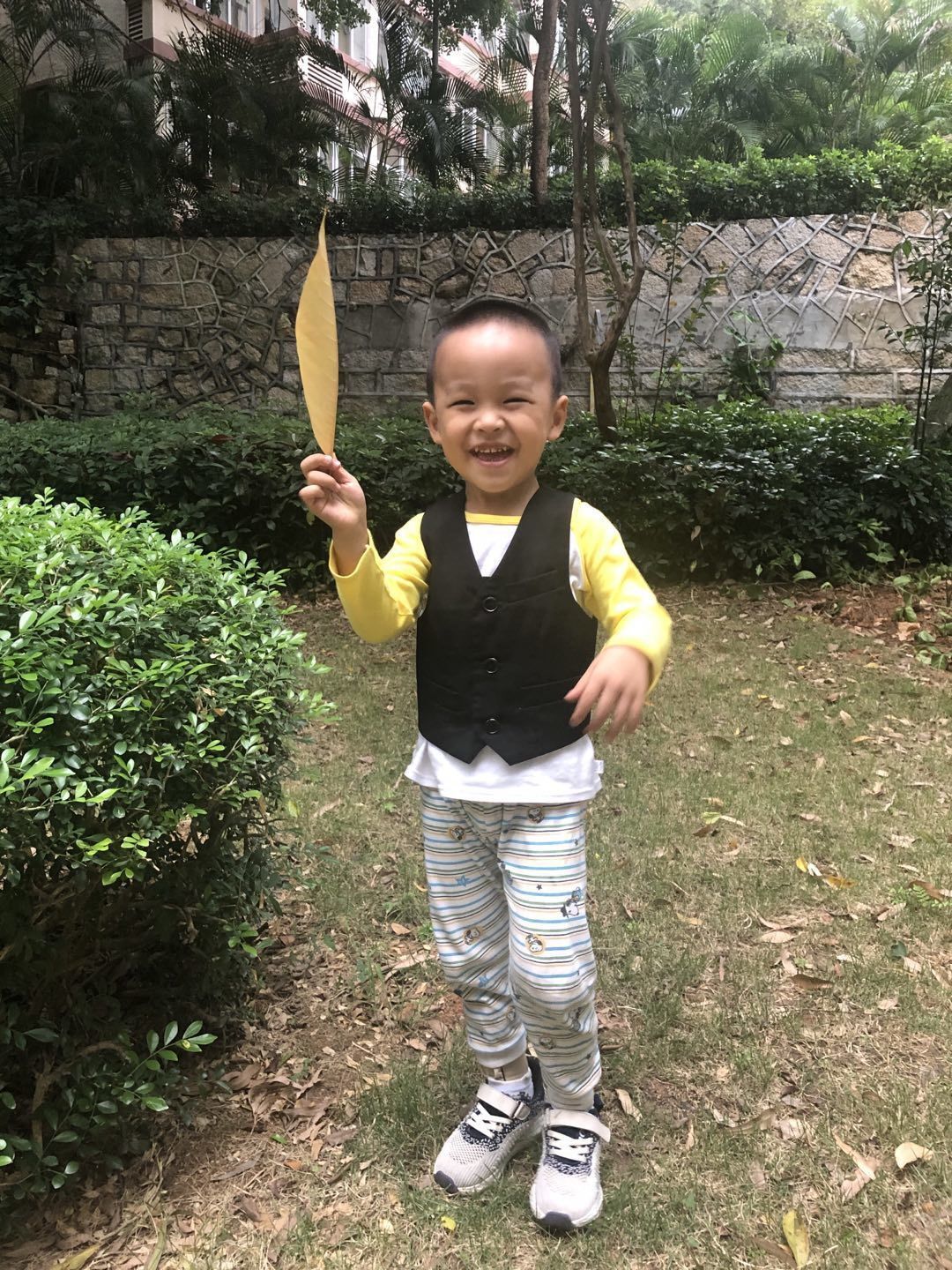 快看!我捡到一片好大好大的树叶,这片叶子可比我的脸还大呢!