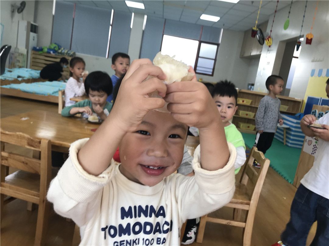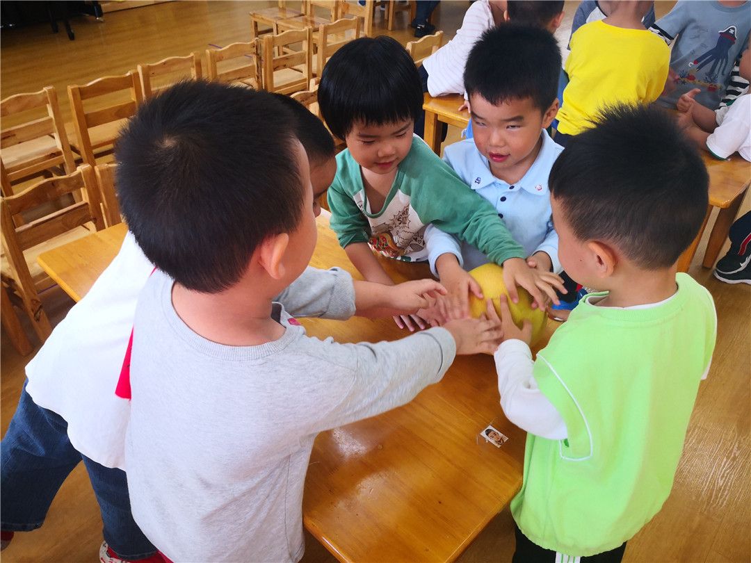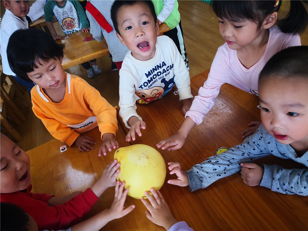柚子还有一层厚厚的皮,老师,快来快来,帮我们把柚子剥开,让我们一起尝一尝吧!