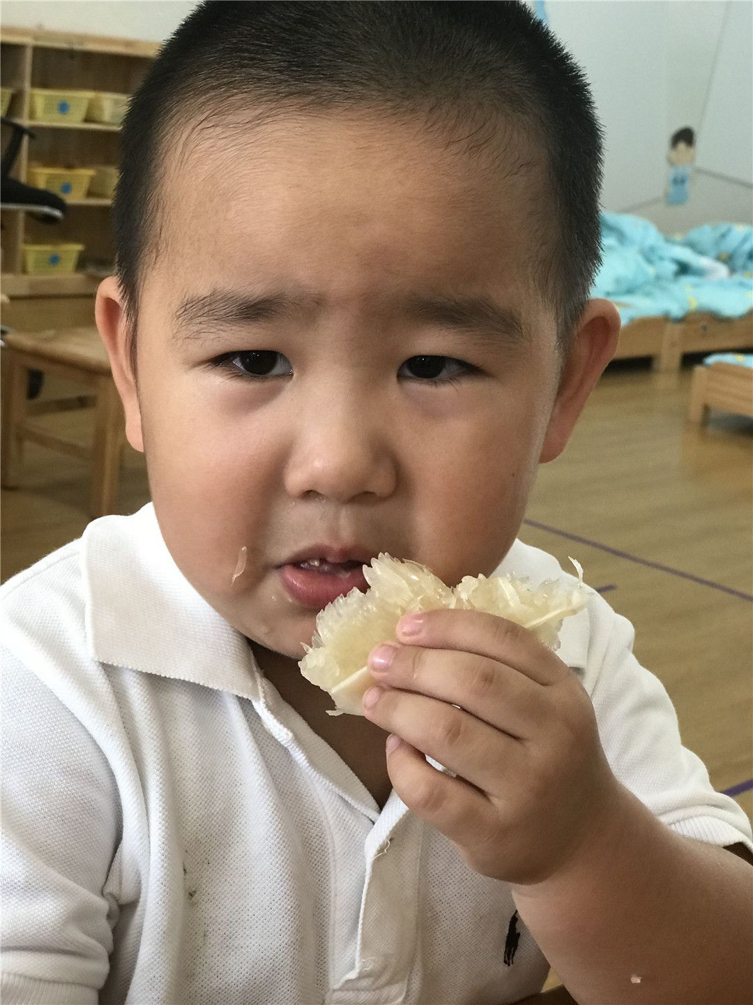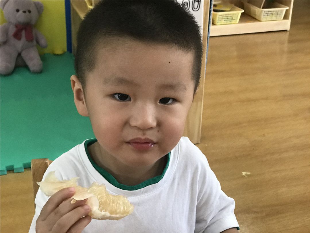 霖霖小小地咬了一口试试:哇!我吃到的柚子甜甜的真好吃~