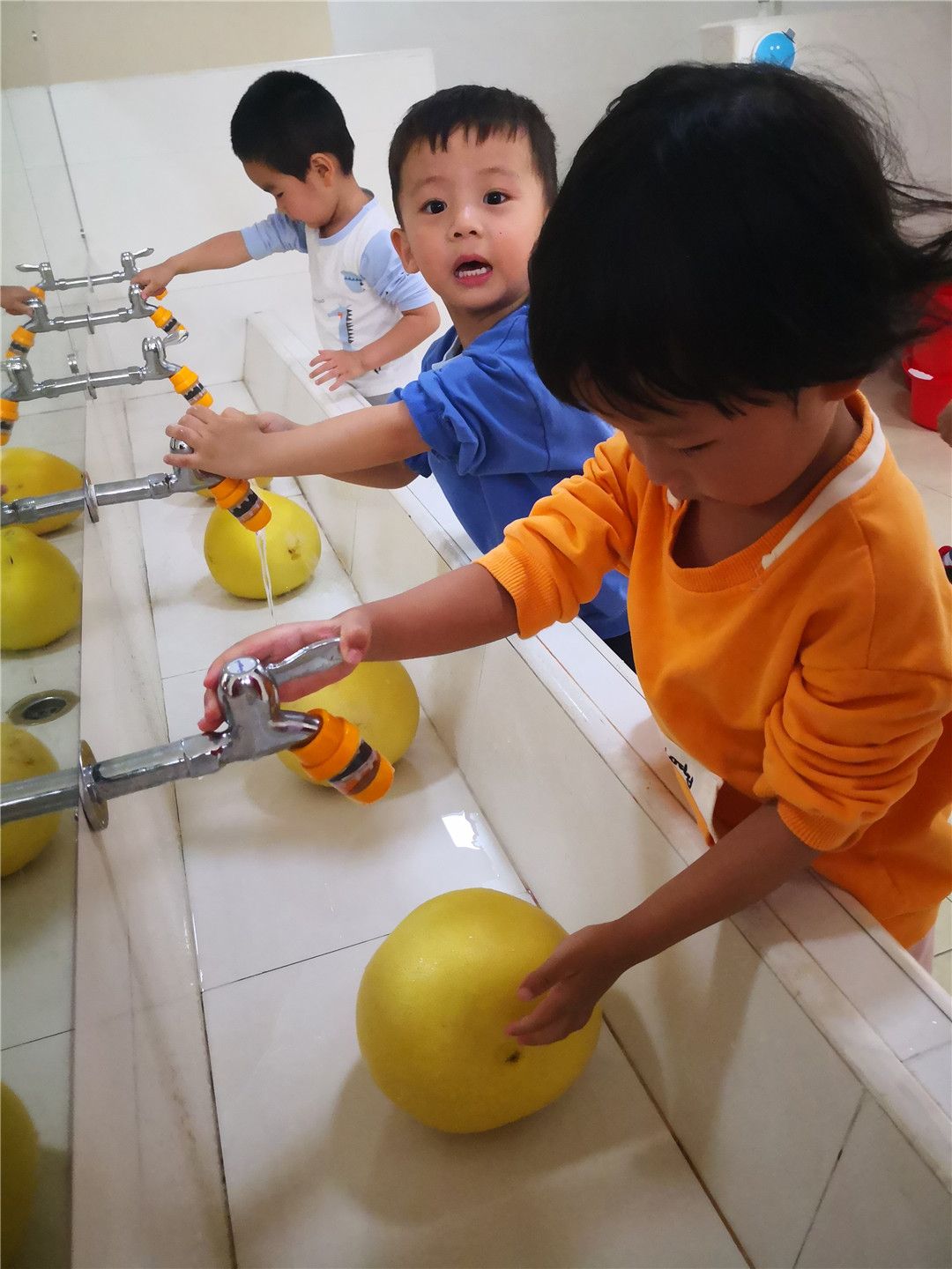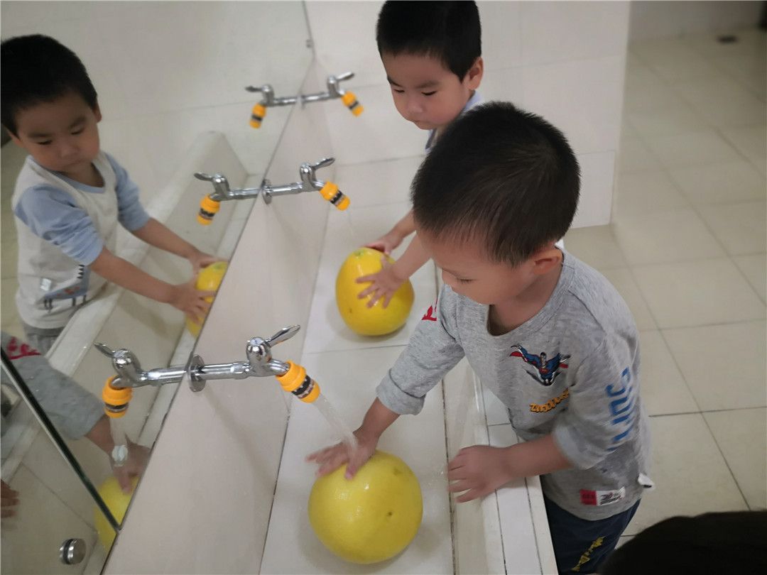 我们迫不及待地想要吃柚子啦!柚子让我来洗洗你!瞧我们洗得多认真~