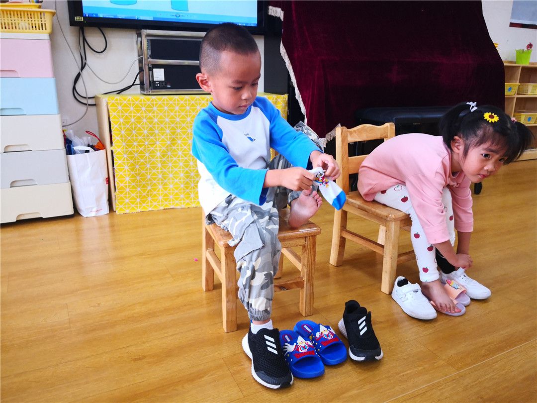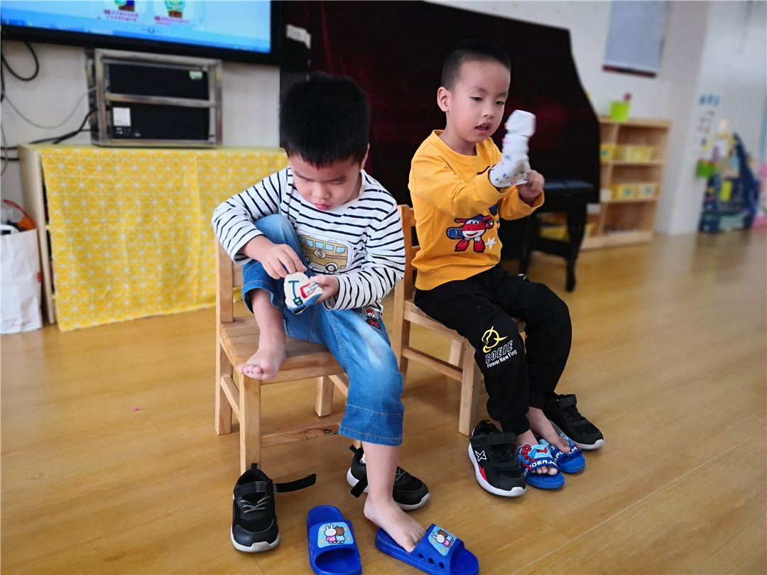 同时进行的还有穿鞋袜比赛。看!这边的小家伙们就超级的淡定,一个个都是信心满满的。有的小家伙边比赛还边对着镜头笑,轩轩说:“老师你看,我的小老鼠已经钻进洞里了,哈哈!”宏宏也不甘示弱地说:“我才是穿得最快的。”旁边的彤彤小声地说:“可是你的袜子穿反了啊。”“老师老师,我穿好了。”“哈哈,老师你看,他的鞋子穿反了。”