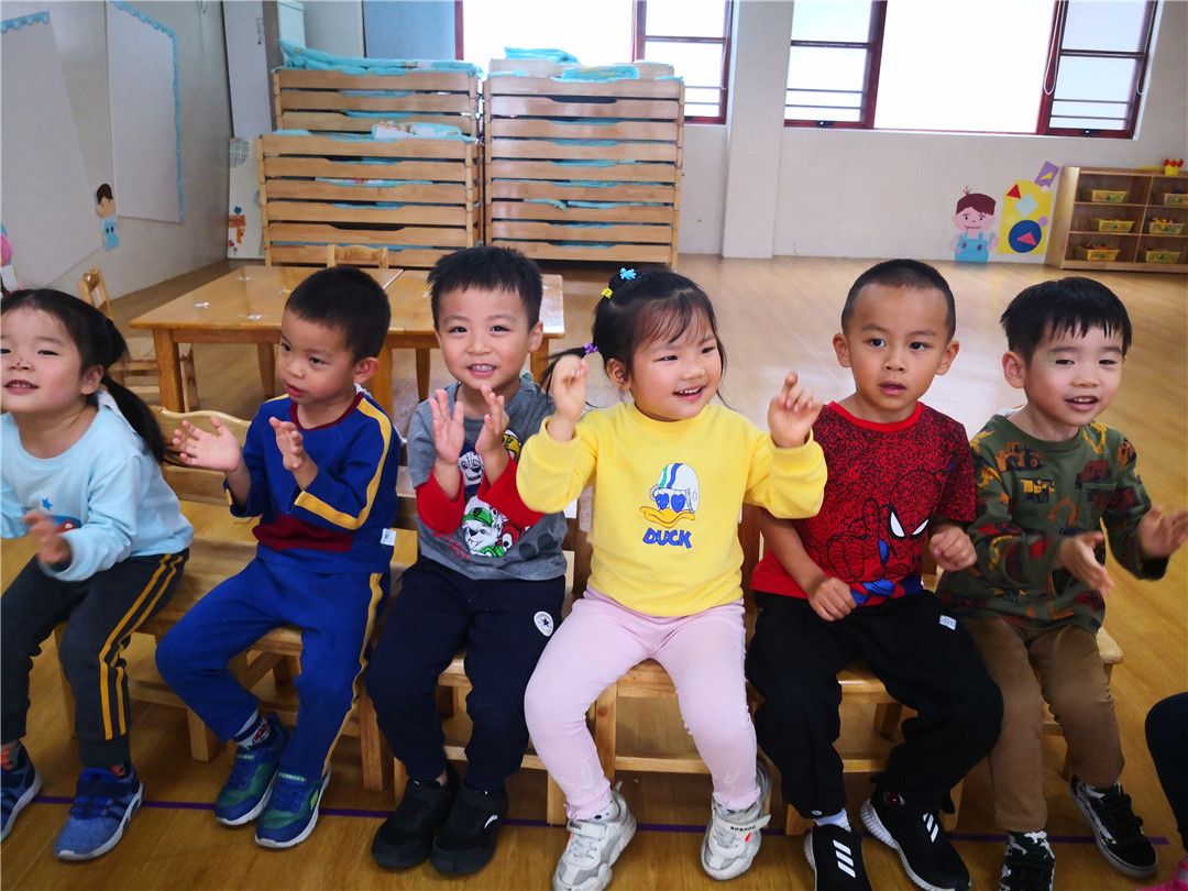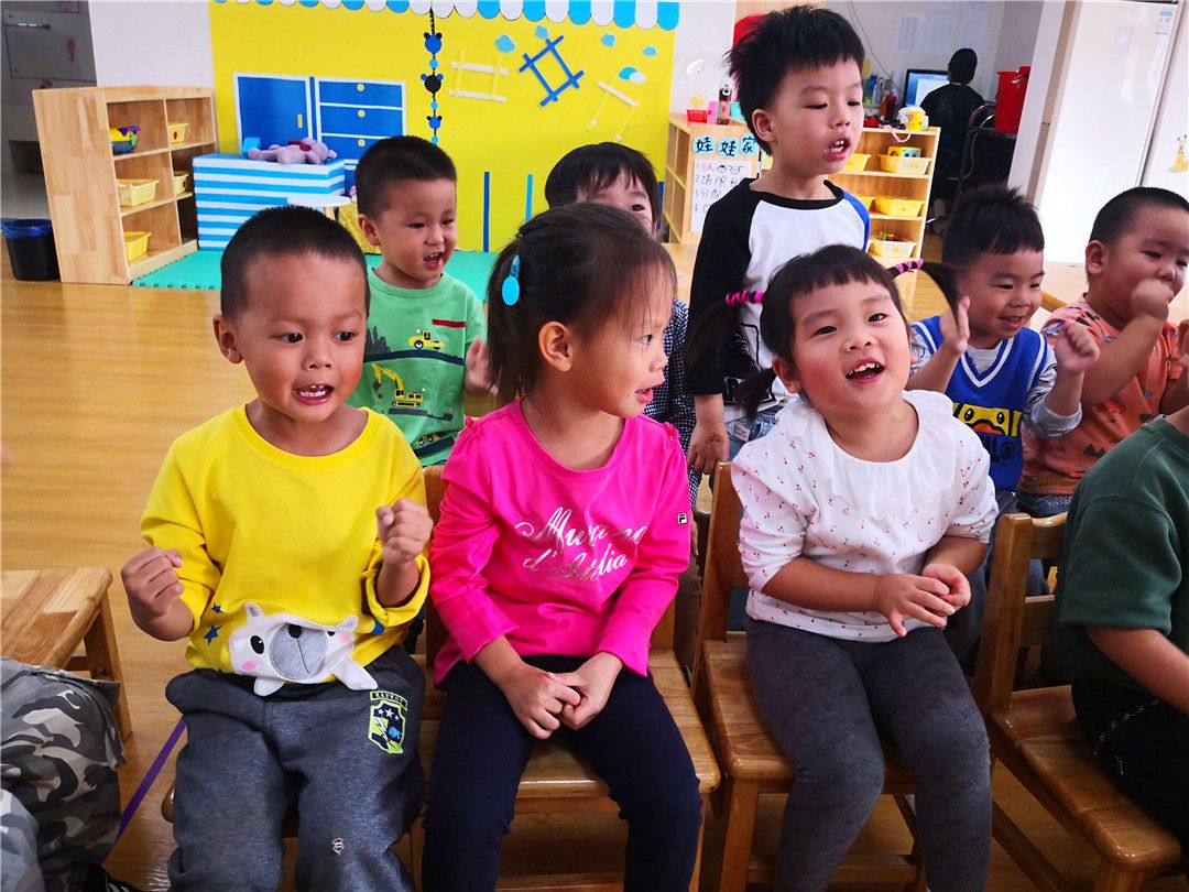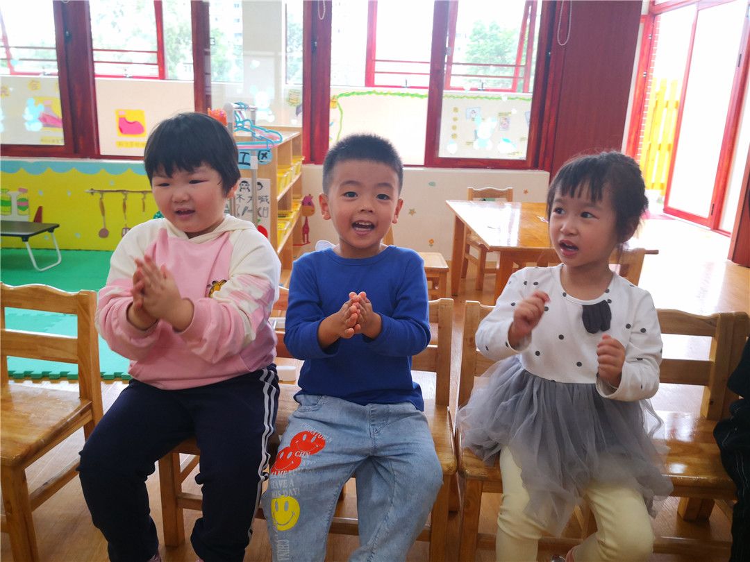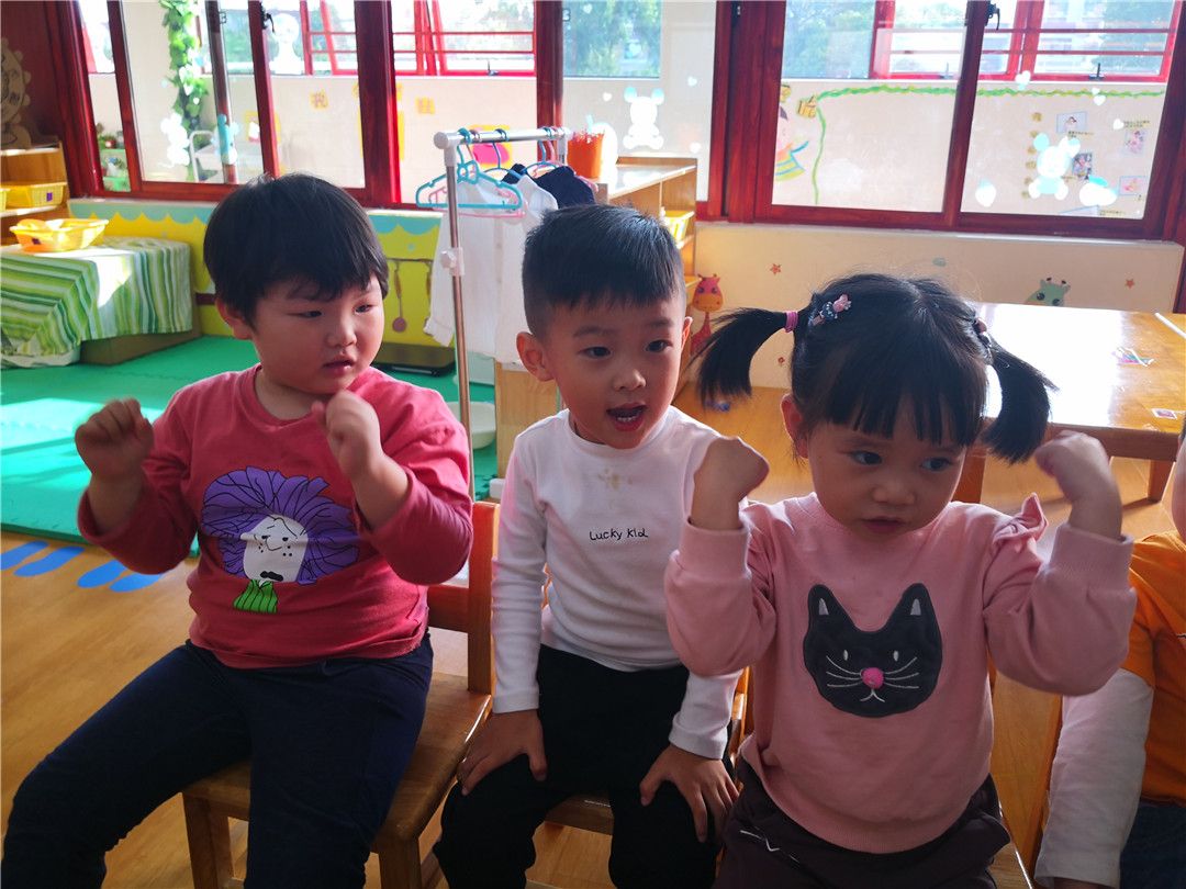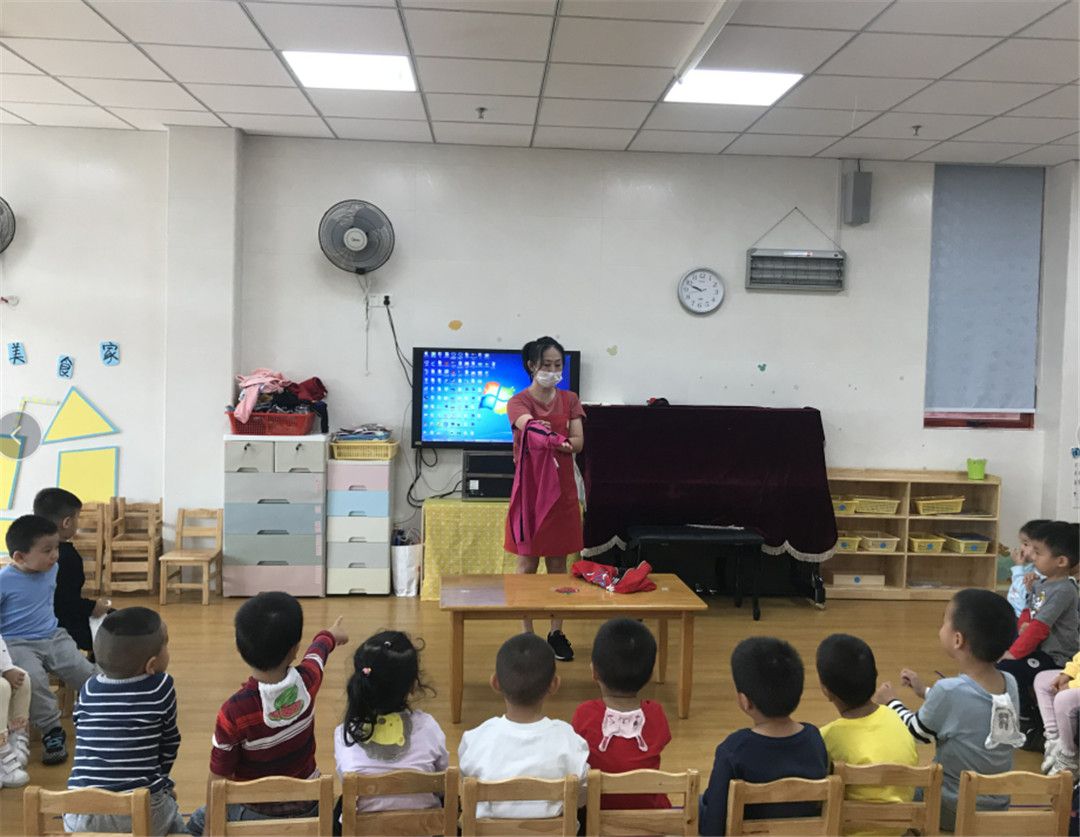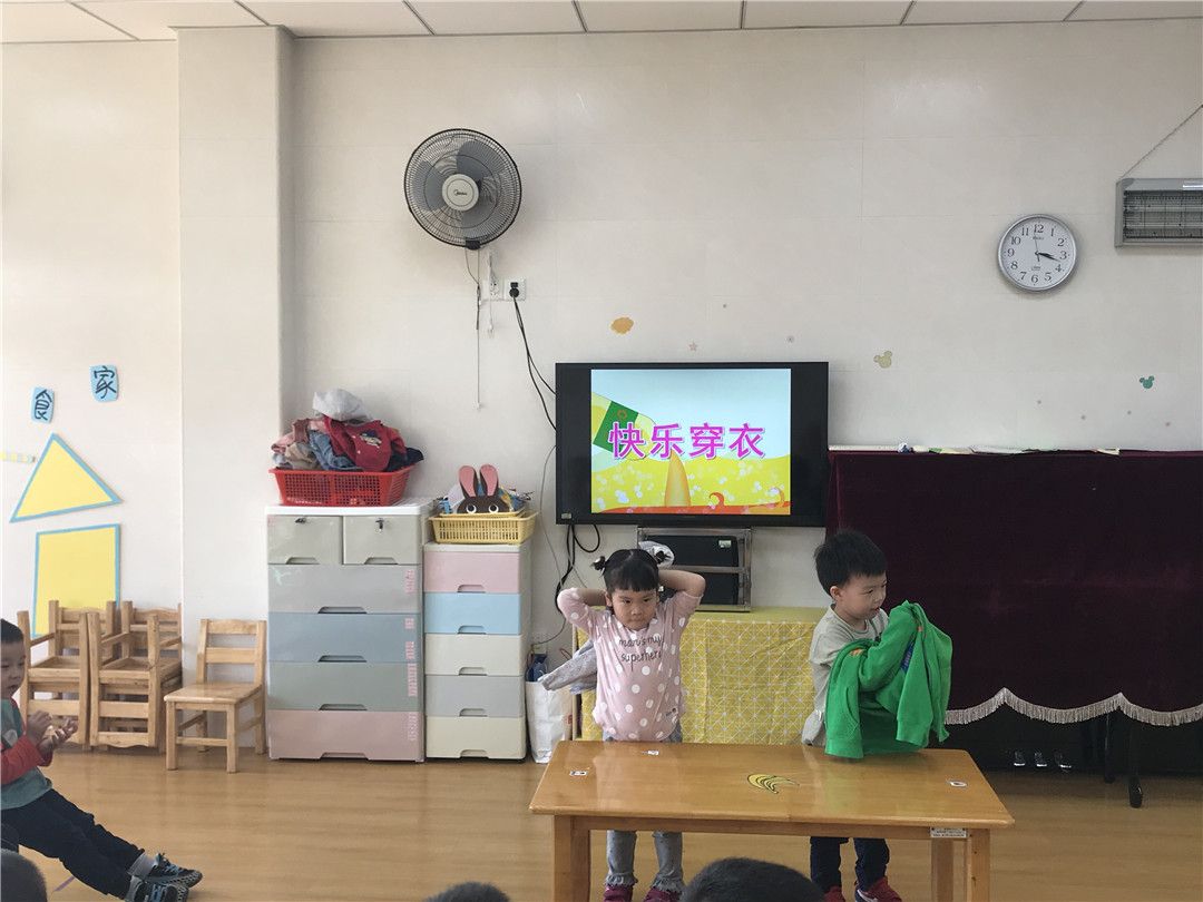 “抓领子,盖房子;小老鼠,钻洞洞;左钻钻,右钻钻……”甯甯在边念着新学的儿歌边努力地穿衣服呢。坐在底下的小观众小山大声地喊着他的好朋友:“甯甯,加油!甯甯,加油!”听到了小山的喊声,其他的小观众也开始为自己的好朋友加油鼓劲。晞晞看着自己的好朋友阳阳一直穿不上,着急地冲上了台,嘴里还一直喊着:“钻洞洞,钻洞洞,快点快点。”