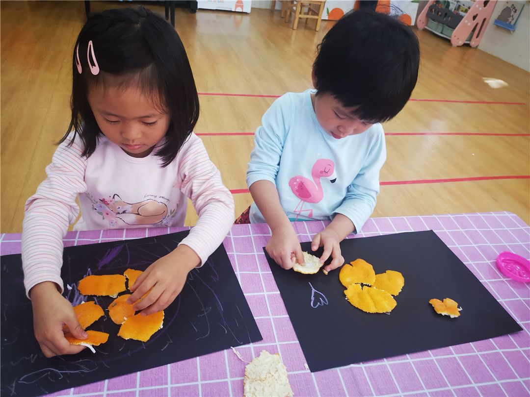 水果宝宝涂色、水果大拼盘、橘子皮贴画、水果黏贴画,一幅幅作品在我们的手下“出炉”,我们的小手真能干!