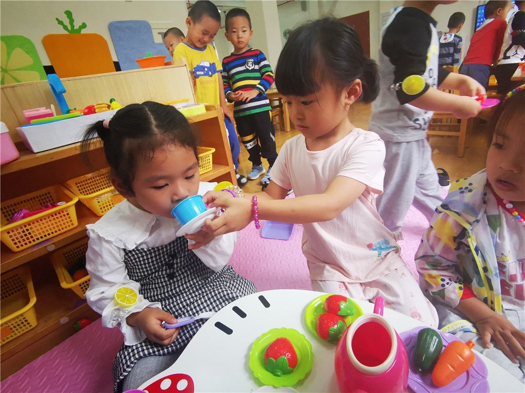 今天的娃娃家可热闹了,小厨师们准备了一大桌好吃的。“妈妈”画了一个美美的妆,“爸爸”认真地在洗手池清洗碗筷,午饭宝宝吃了好吃的蔬菜……