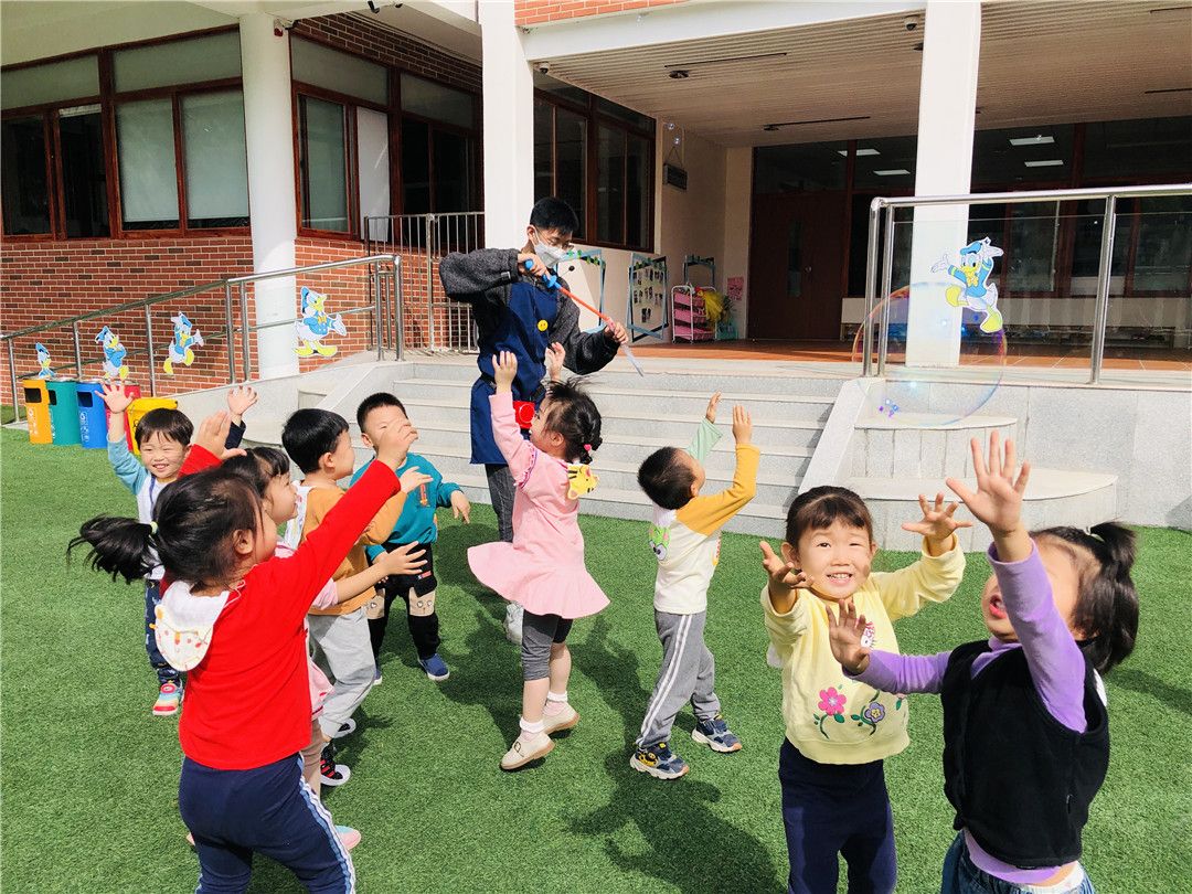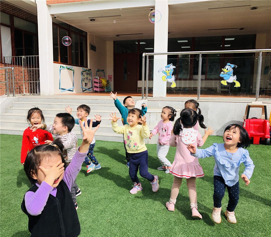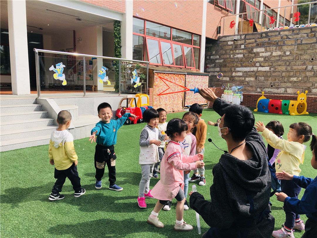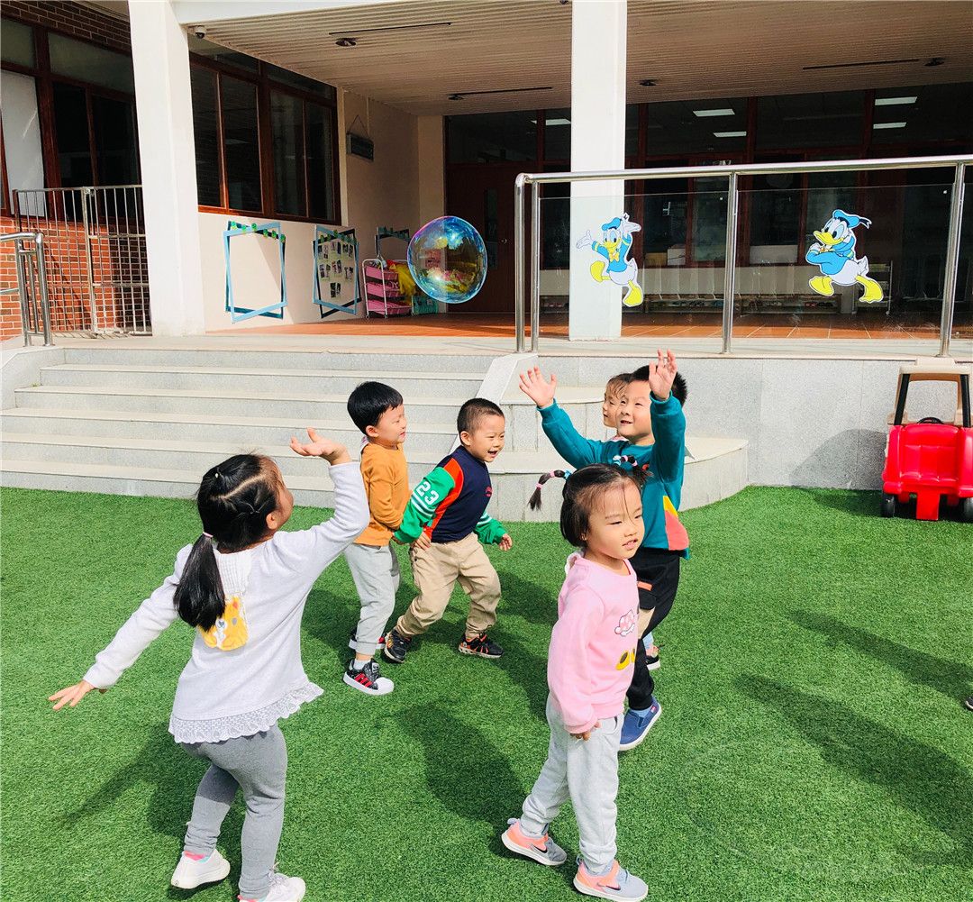 阳光轻洒在草坪上,小十班的小朋友出来户外啦!瞧,星星哥哥给我们带来了好玩的泡泡机!当大大小小、五颜六色的泡泡在空中飞舞、飘扬时,引来了孩子们一声声欢呼,他们争相去追逐嬉戏。玩泡泡是件多快乐的事情啊,一起来看看我们的小宝贝们和泡泡的一次欢乐约会吧。