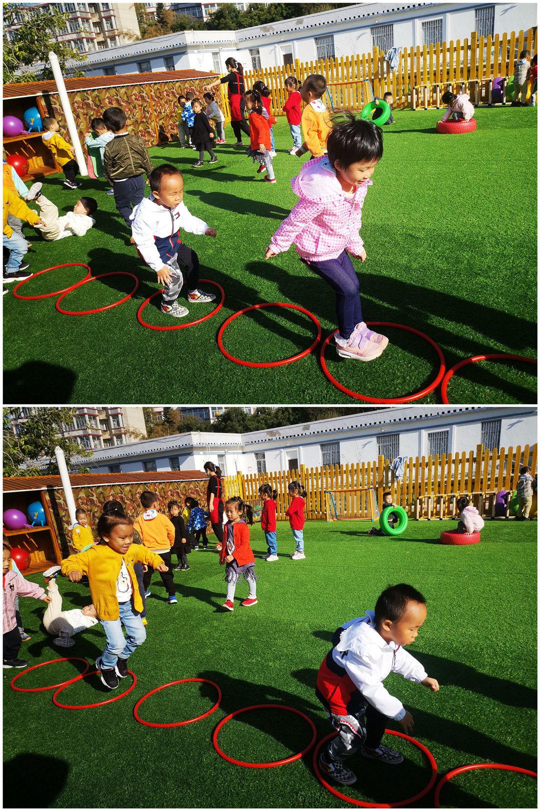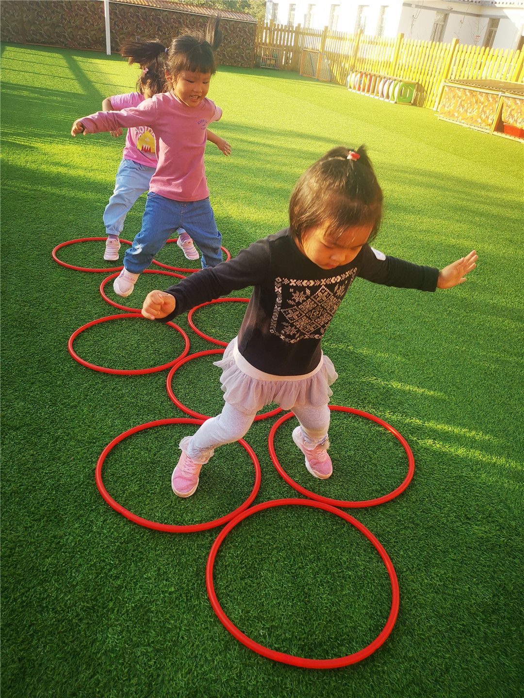 瞧,我们的跳圈摆好啦!并脚跳、开脚前跳、交替跳,都难不倒我们!