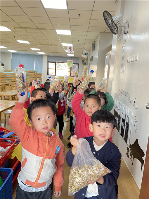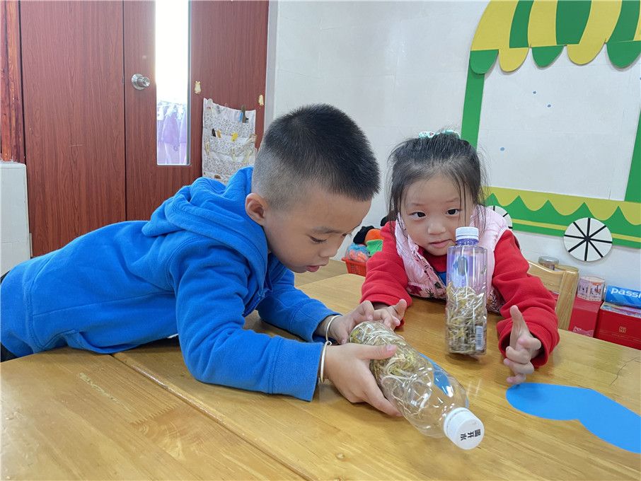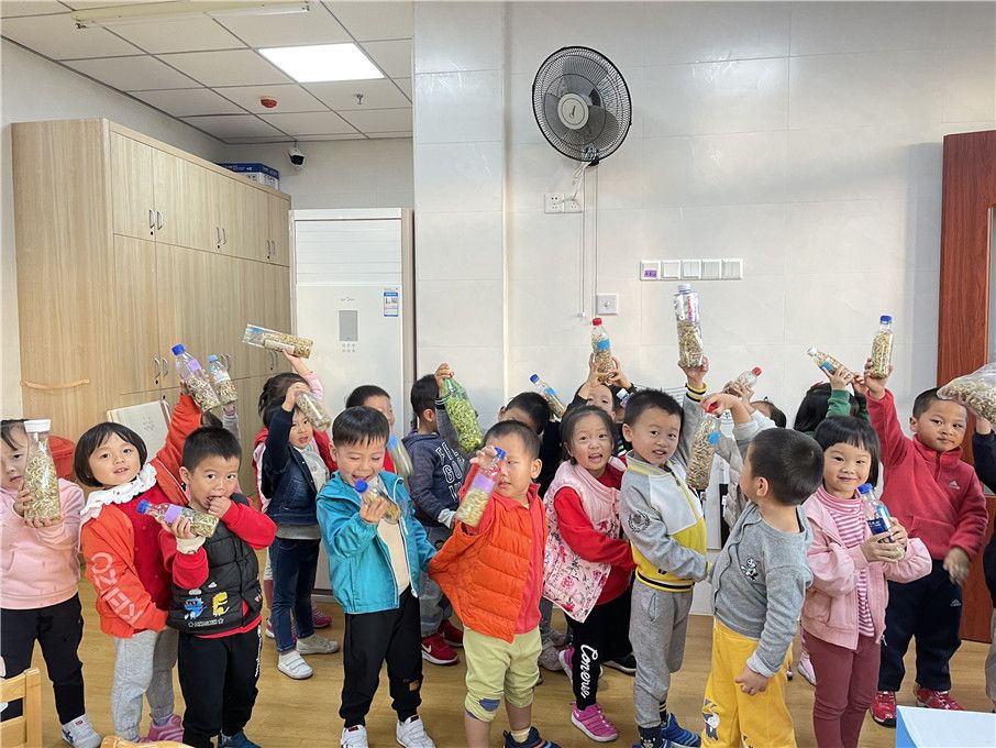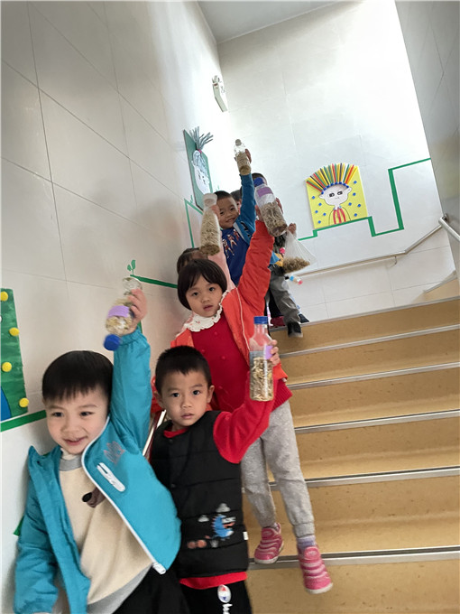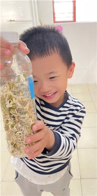经过宝贝们连续几天的悉心照顾,小小豆芽纷纷长出嫩嫩的叶子!也越长越长。水瓶里的豆芽越来越满啦!瞧他们笑得合不拢嘴的样子。