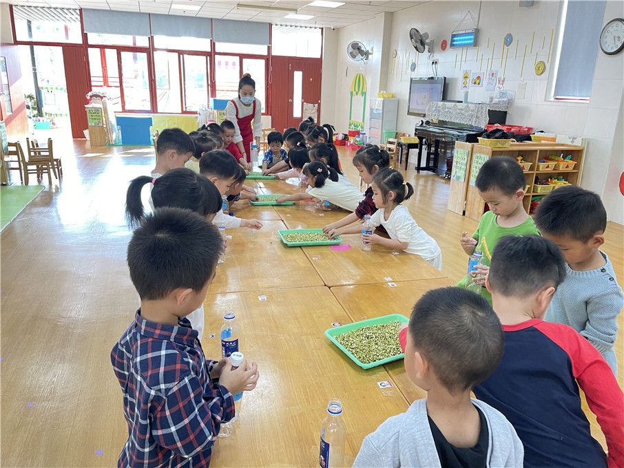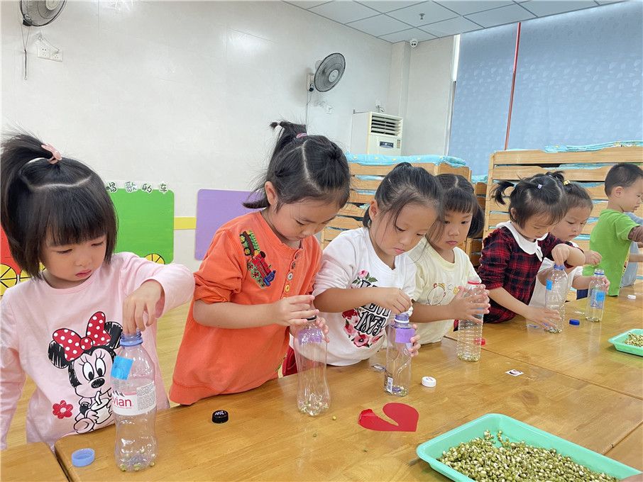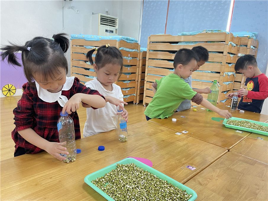 小小绿豆们没有辜负小朋友的期盼,纷纷破壳啦! 都露出新生的芽。接下来,和老师一起把绿豆装到瓶子里面吧!记得一手扶住瓶子,另一只手要轻轻拿哦!