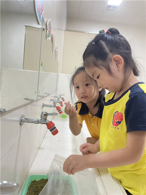 活动开始啦!我们常说生活是最好的课堂,体验是最好的教育,所以这次都由宝贝们亲力亲为。你们看,他们撸起袖子在为即将到来的“泡豆芽”活动做准备呢!洗一洗,挑一挑把浮在上面的绿豆挑出来。瞧!他们挑的多认真呀!