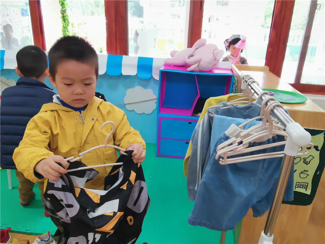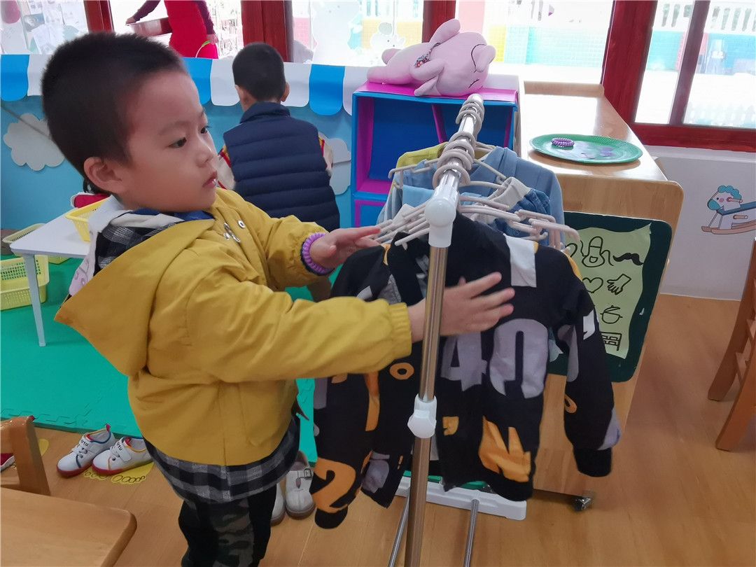 磊磊正在帮忙整理衣架上的衣服哦!