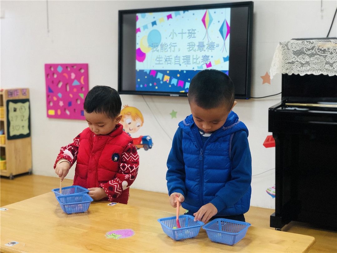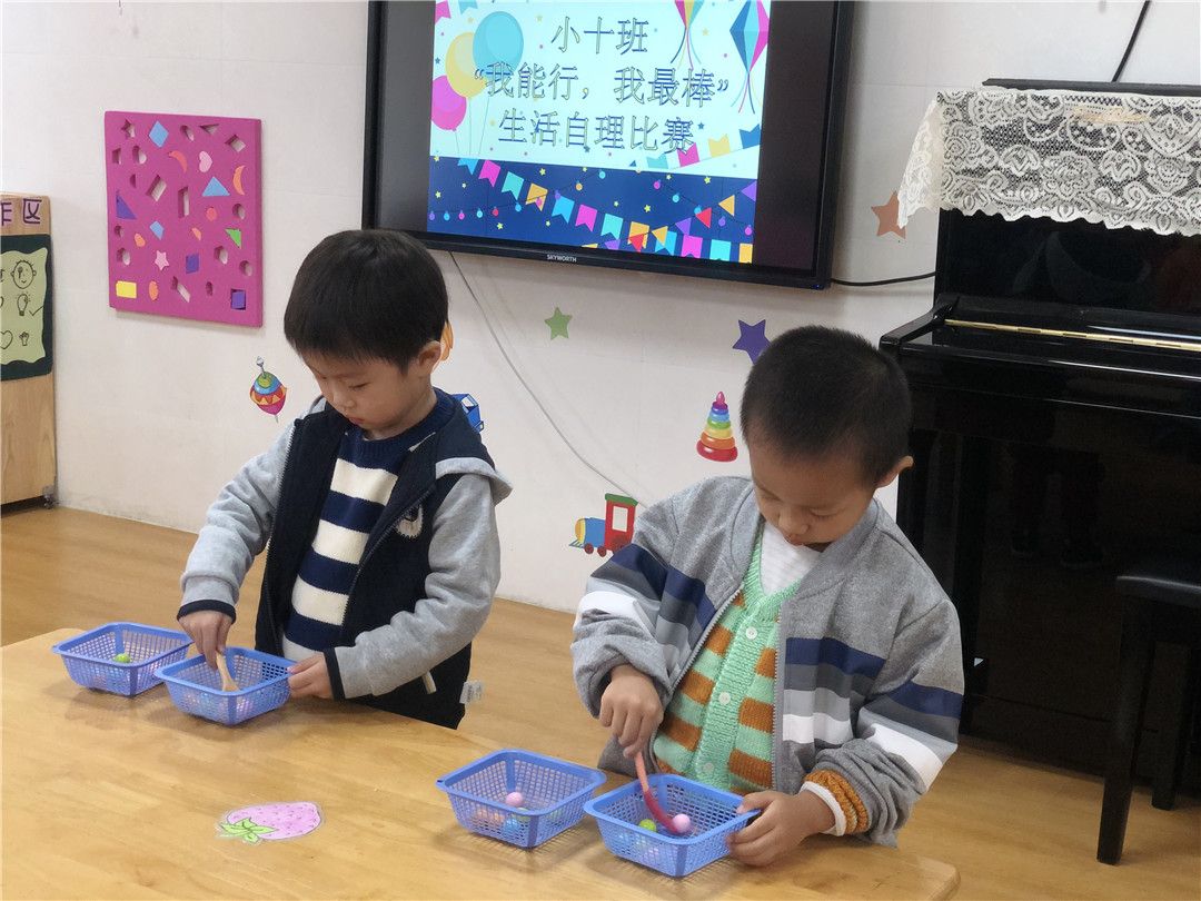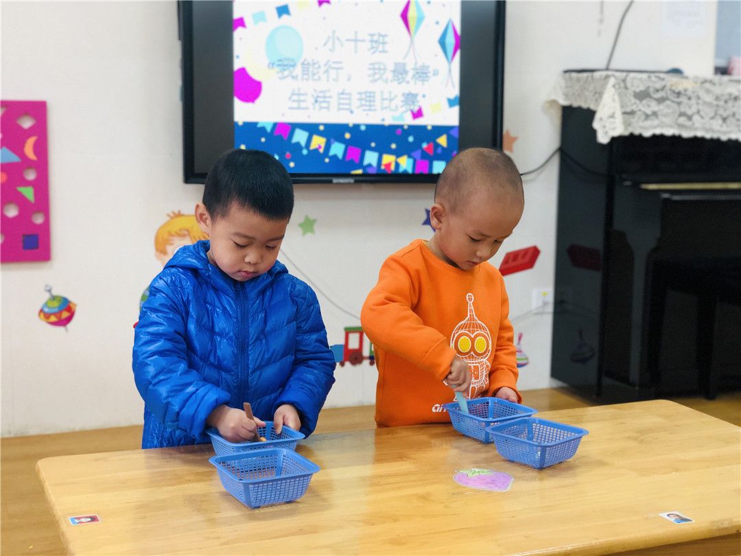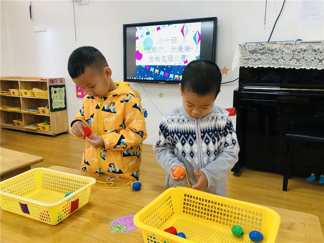 想知道我们的练习结果吗?赶快来观看我们的“我能行!我最棒!”生活自理能力比赛哦!比赛项目有舀豆子、串珠子、穿外套、折外套、穿脱鞋袜哦!这些可都是我们平时有练习的,可难不倒我们哦!