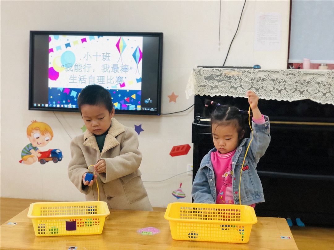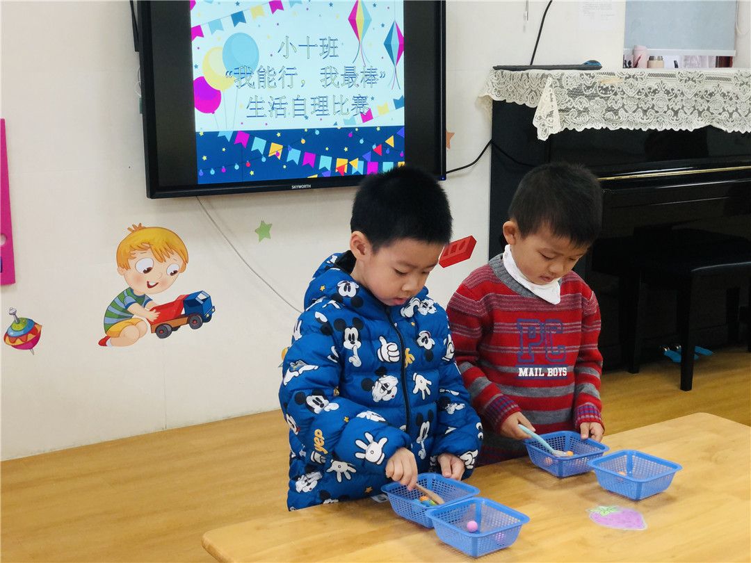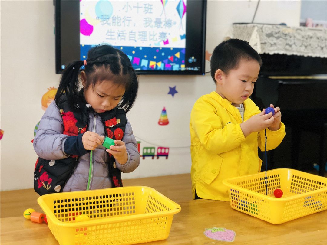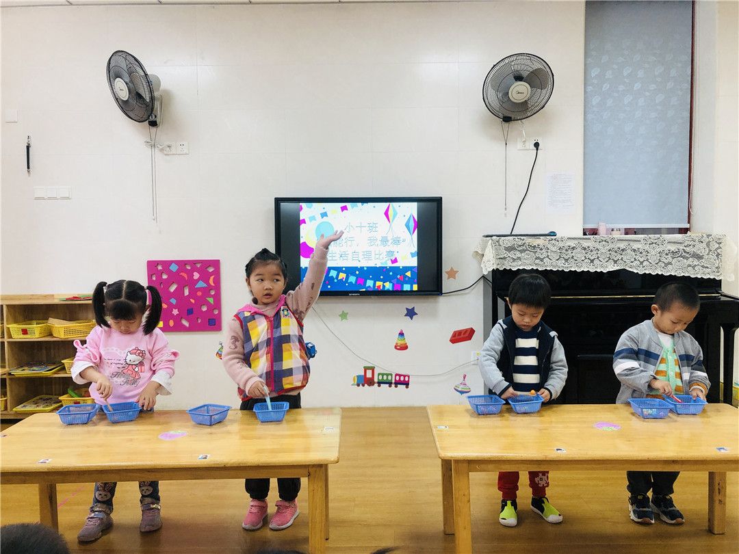想知道我们的练习结果吗?赶快来观看我们的“我能行!我最棒!”生活自理能力比赛哦!比赛项目有舀豆子、串珠子、穿外套、折外套、穿脱鞋袜哦!这些可都是我们平时有练习的,可难不倒我们哦!