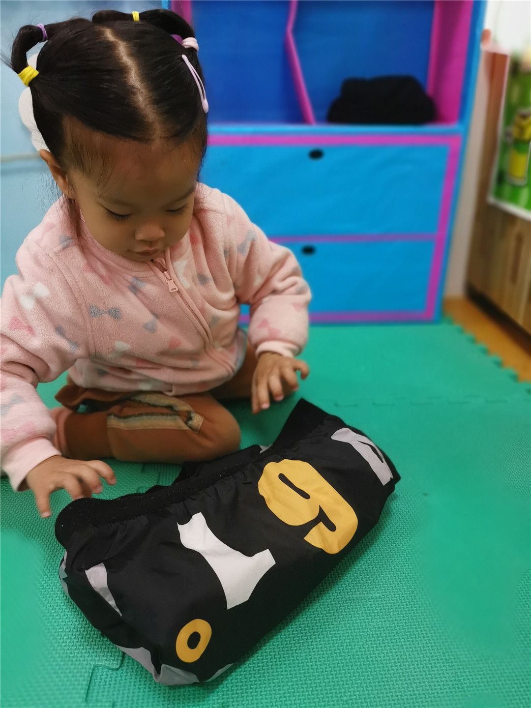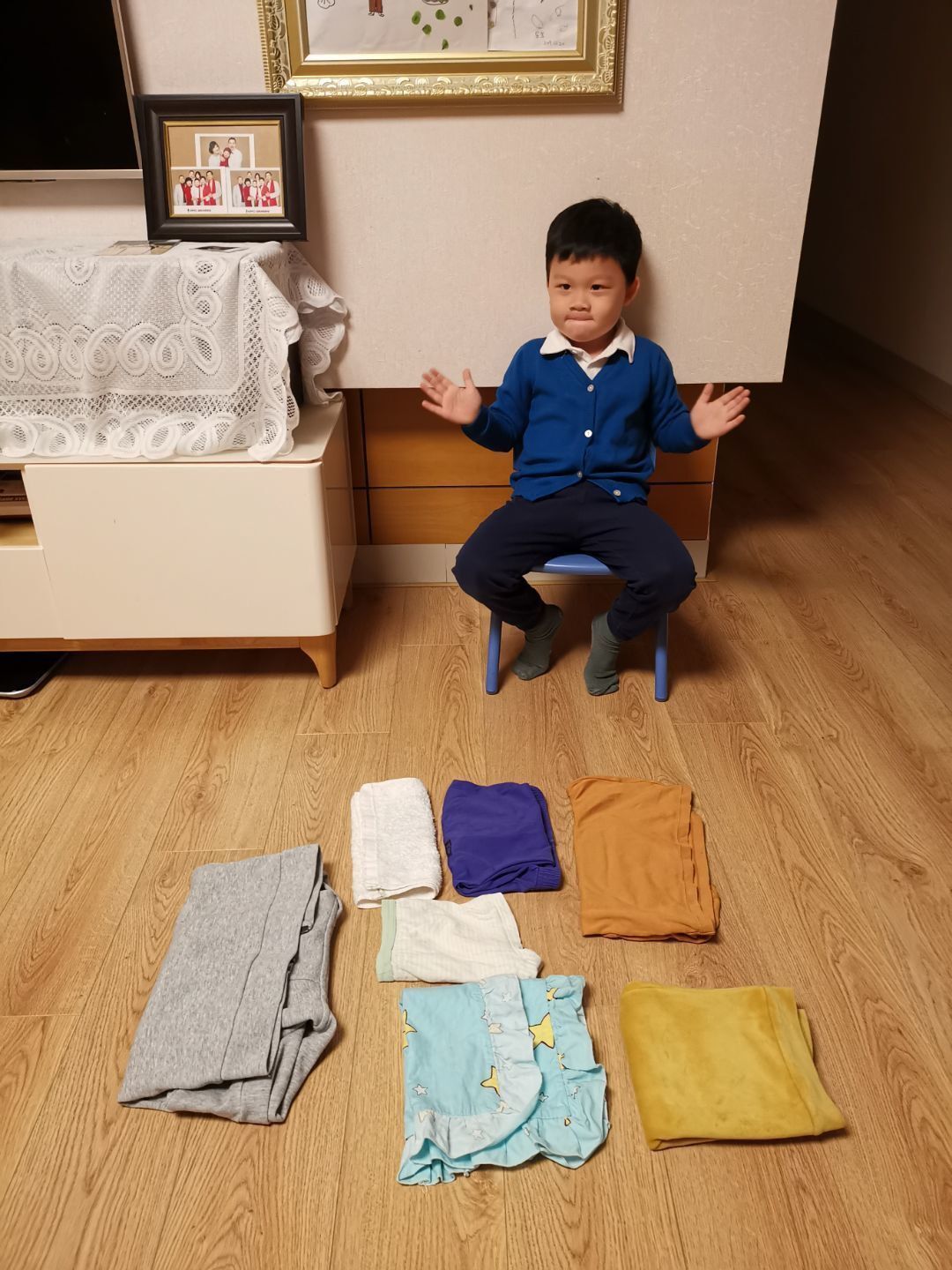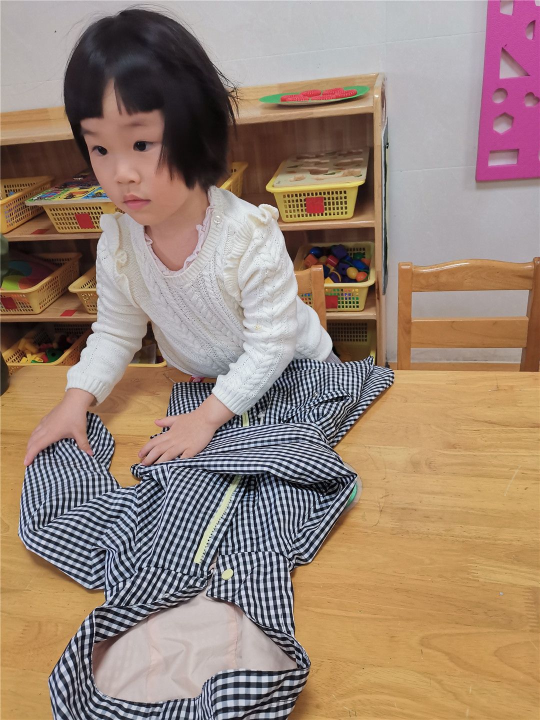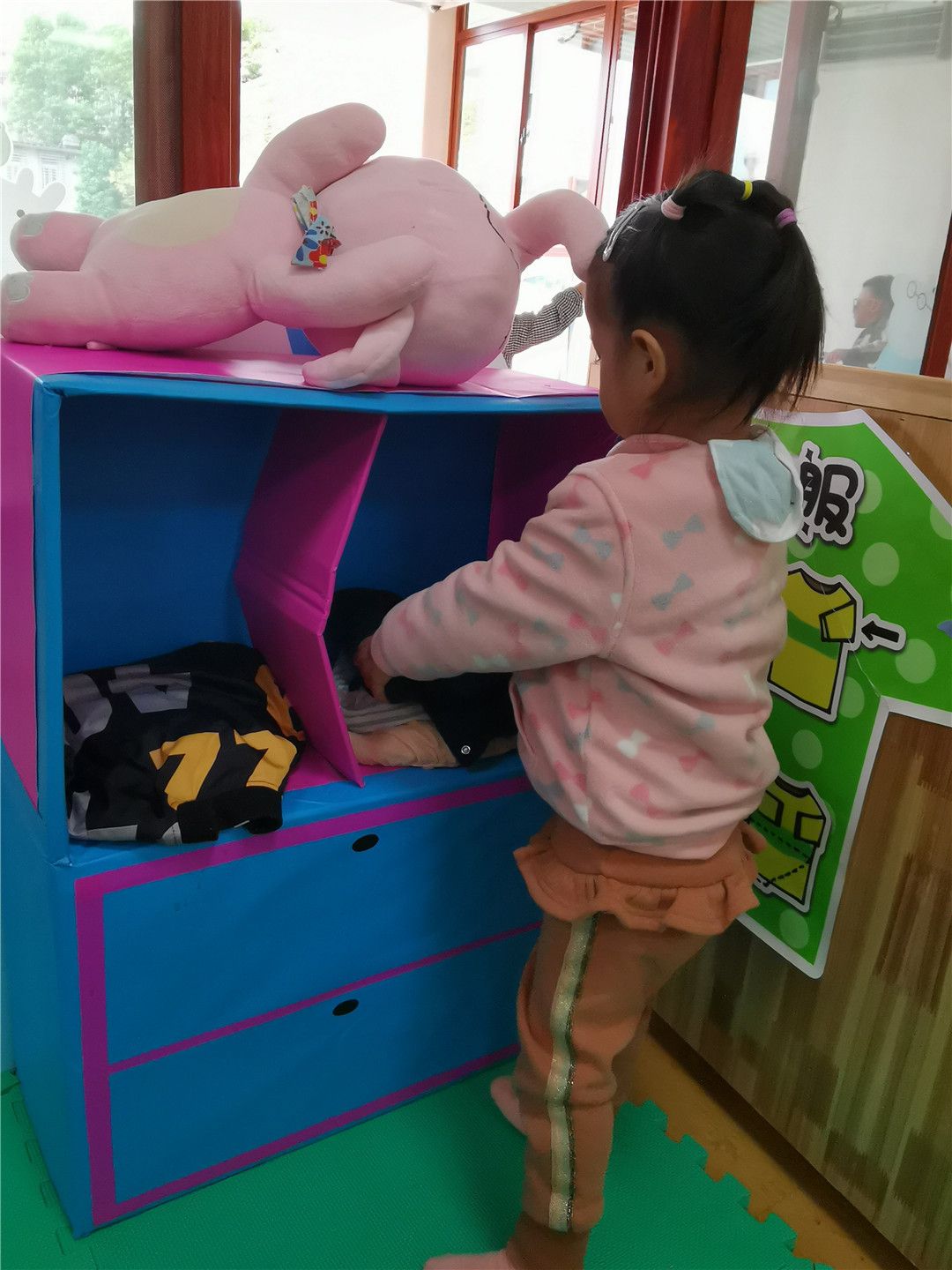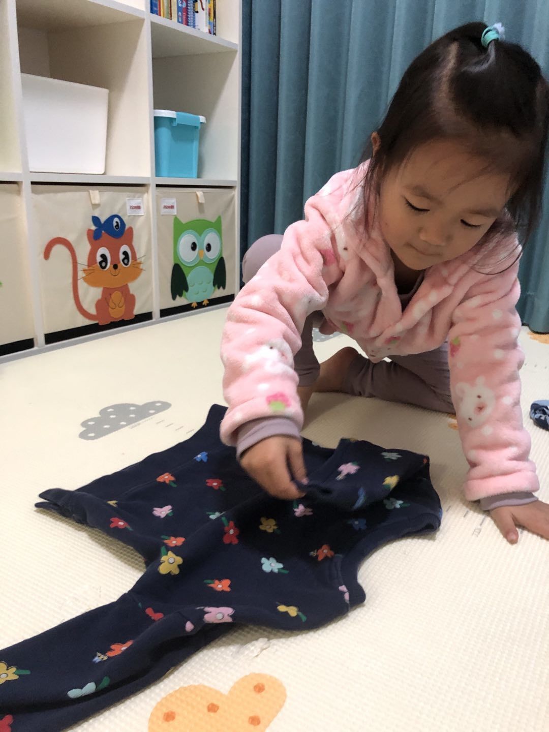 湉湉学着勤劳的妈妈,折叠着衣服,还一件一件地摆放到衣柜中呢!