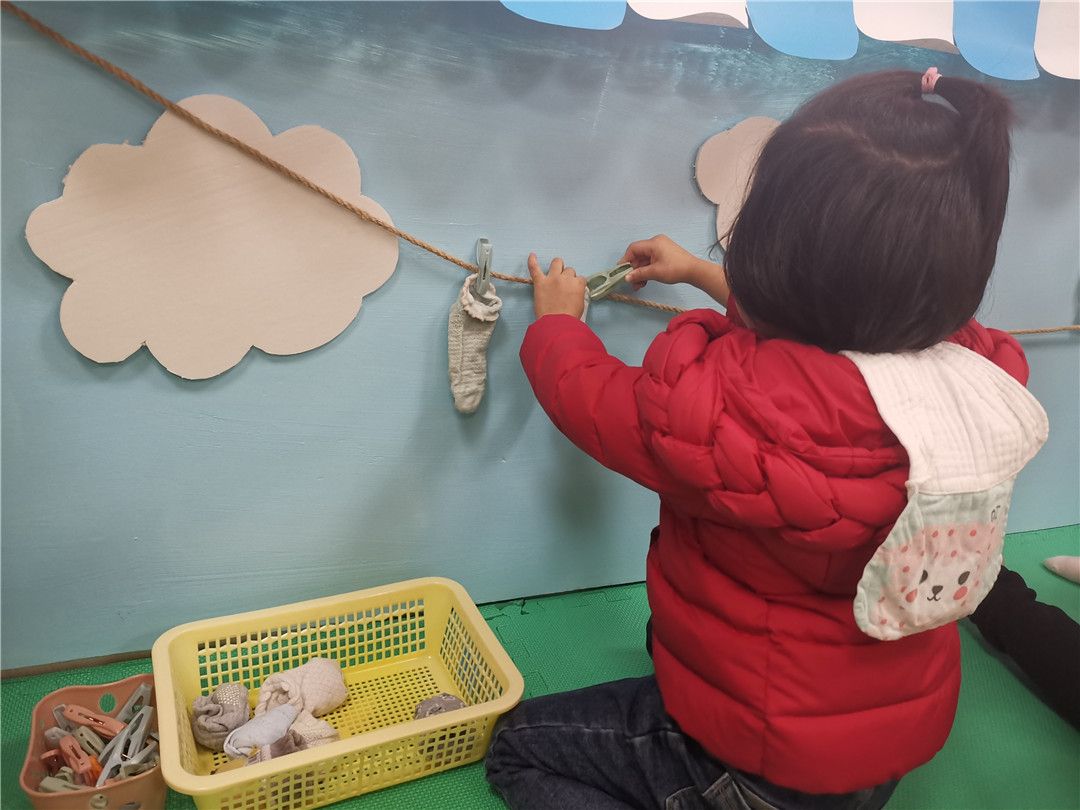 清清和兮兮整理好了袜子,正在学着用夹子晾晒小娃子哦!