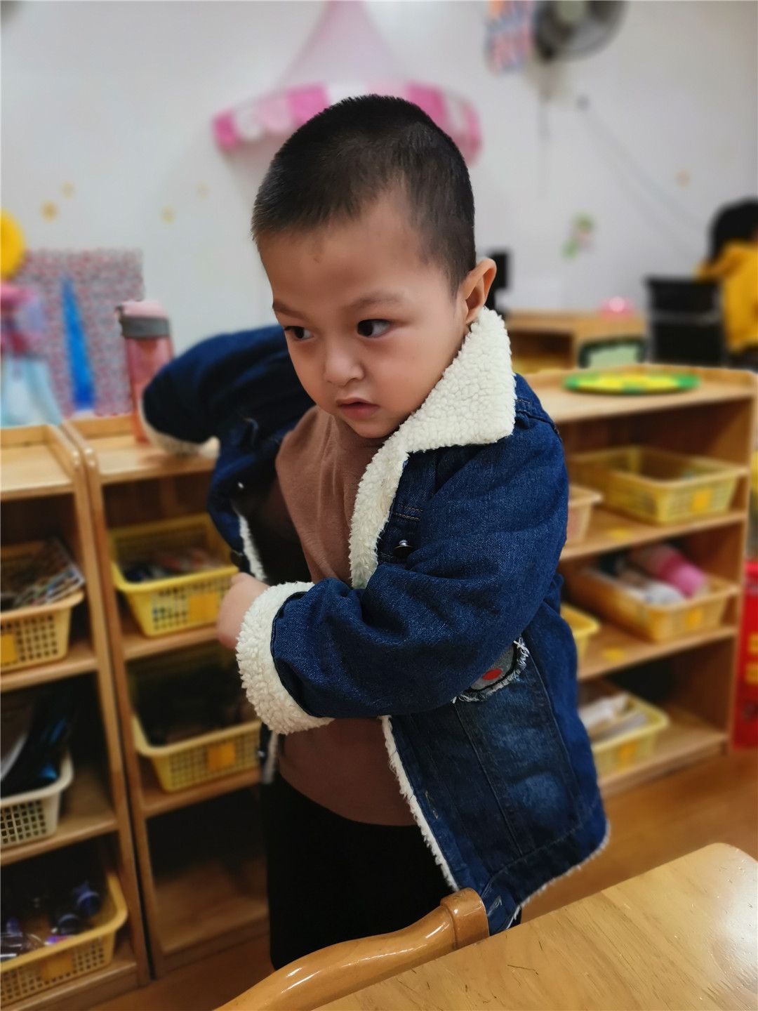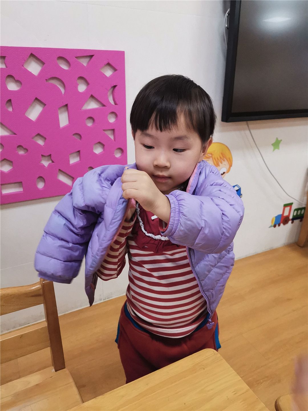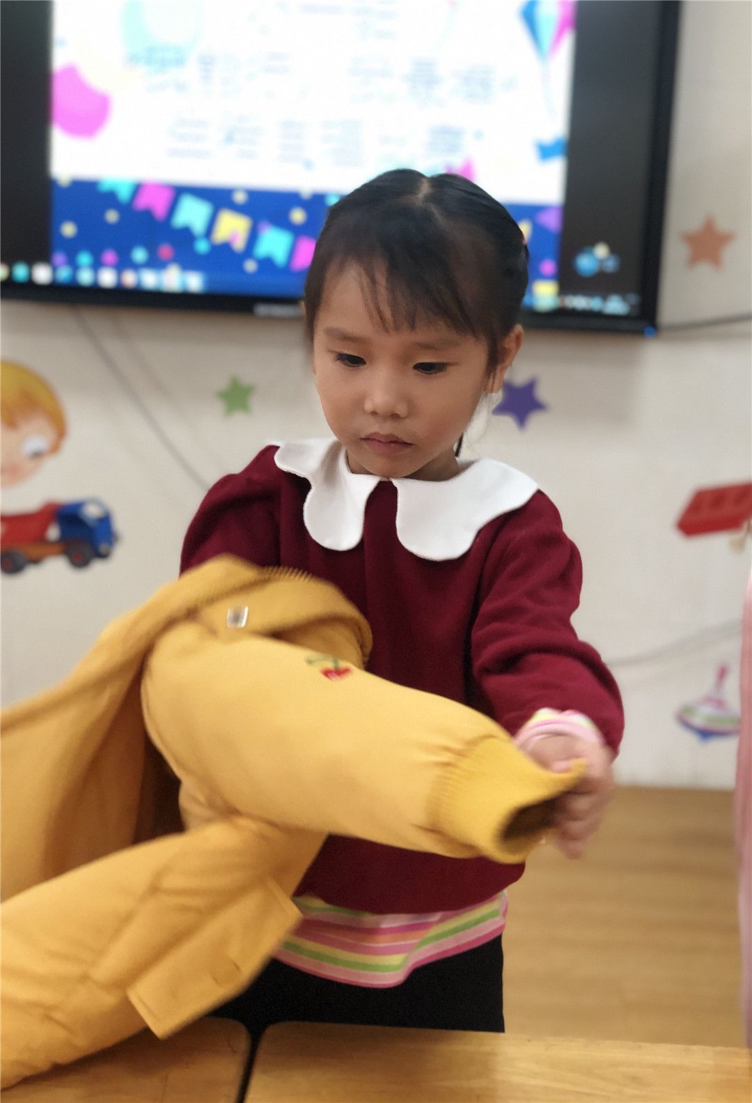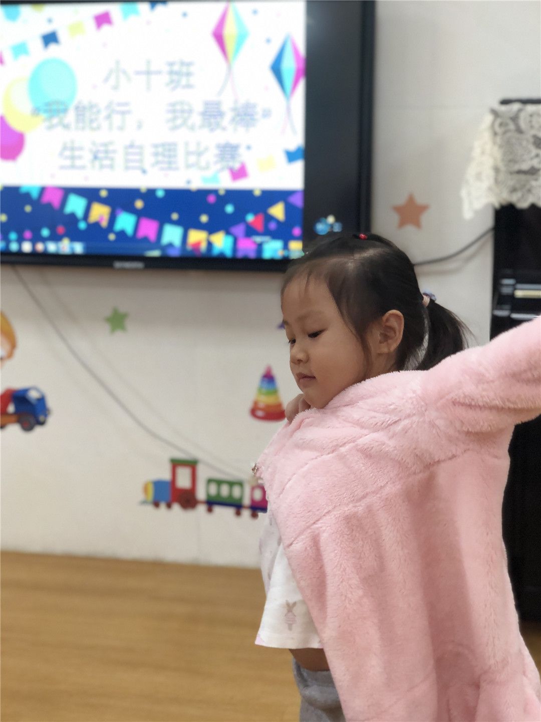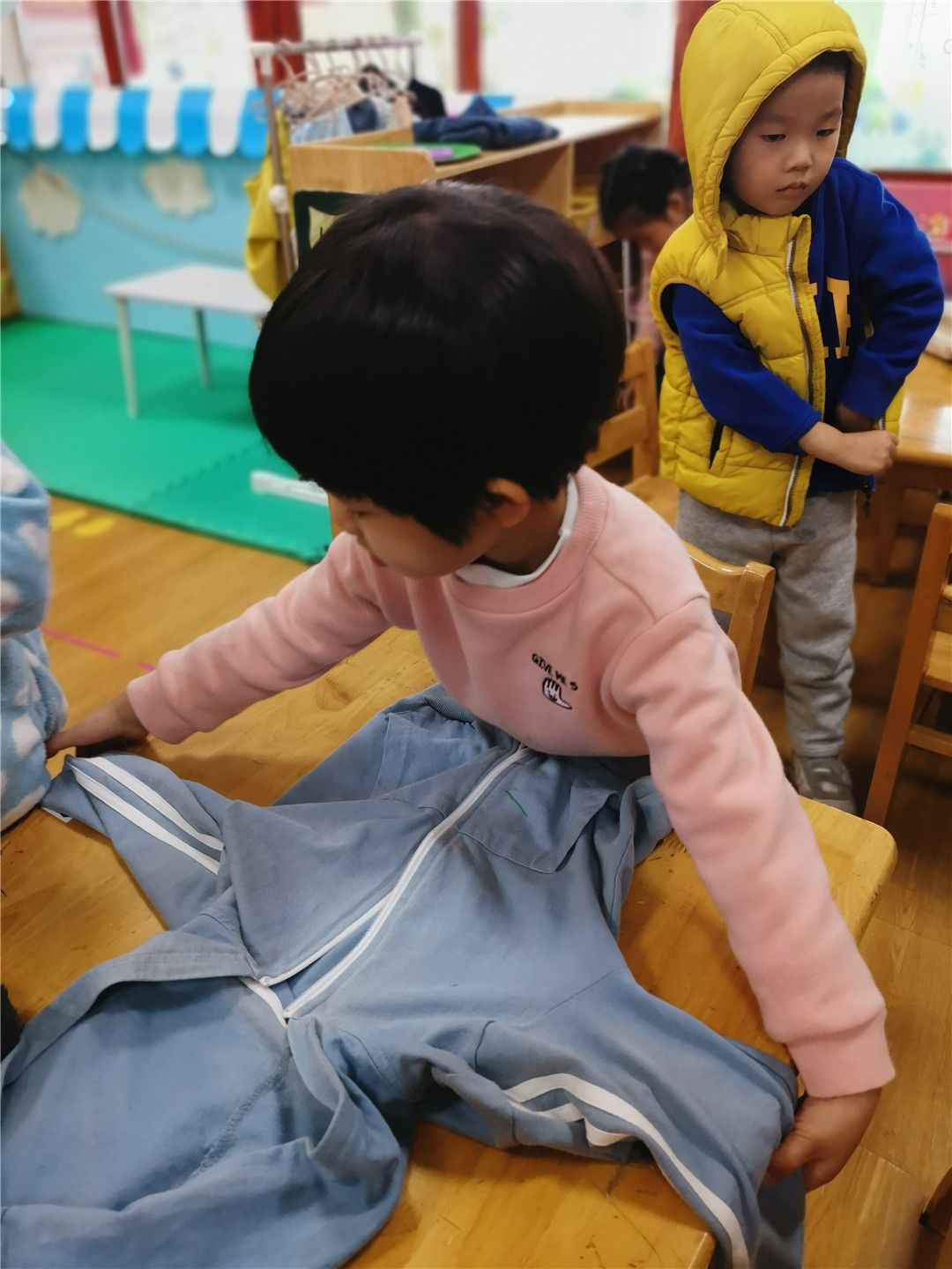 小外套,手中拿。这边钻钻,那边钻钻,哇!我的衣服穿好啦!