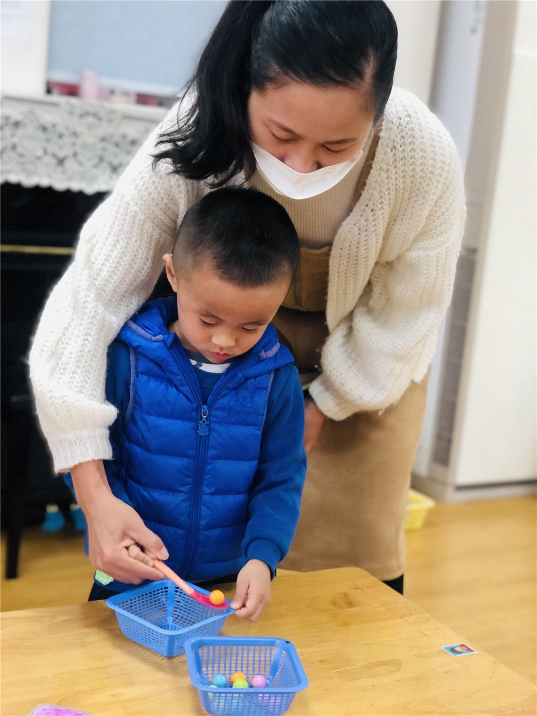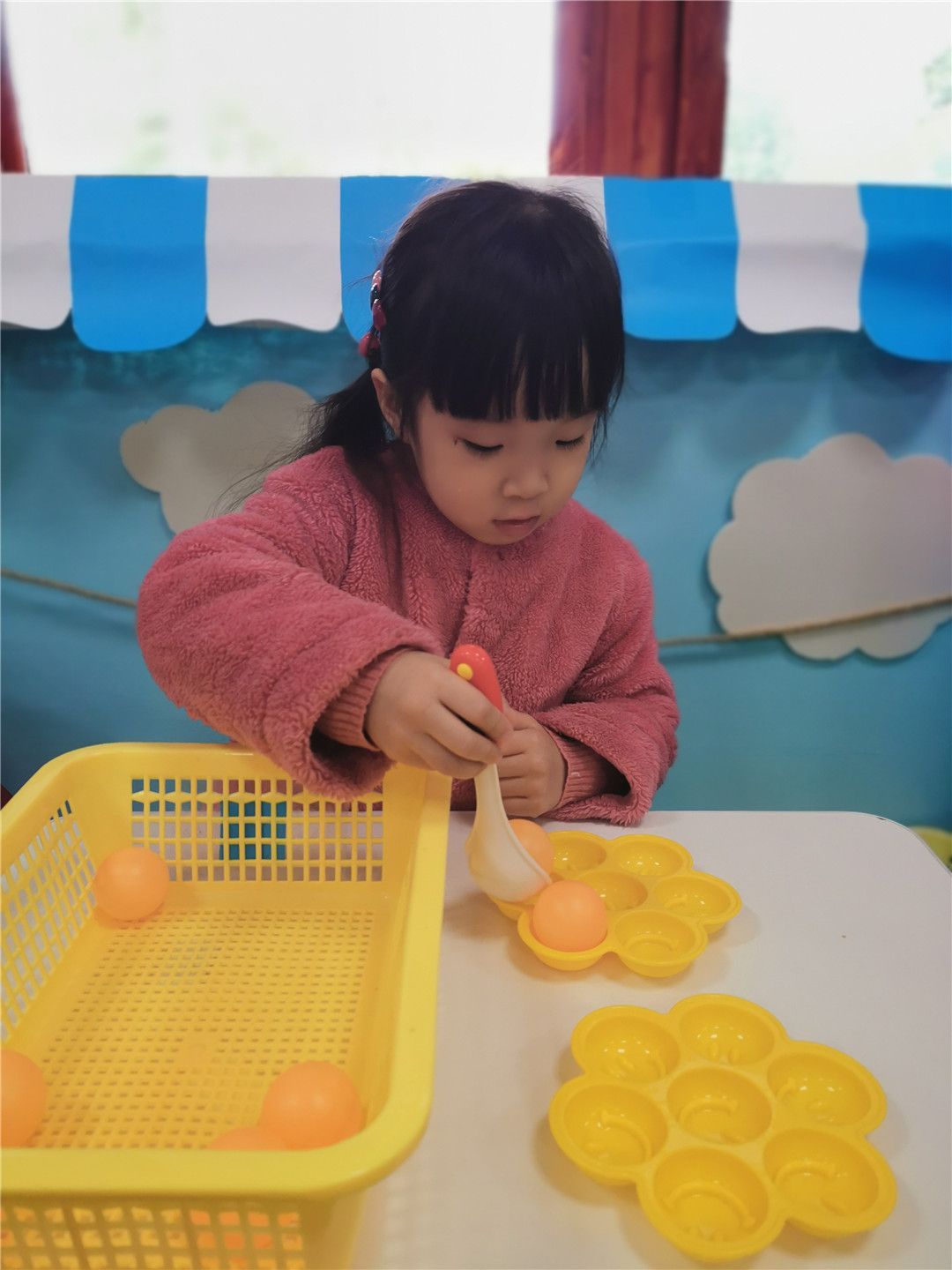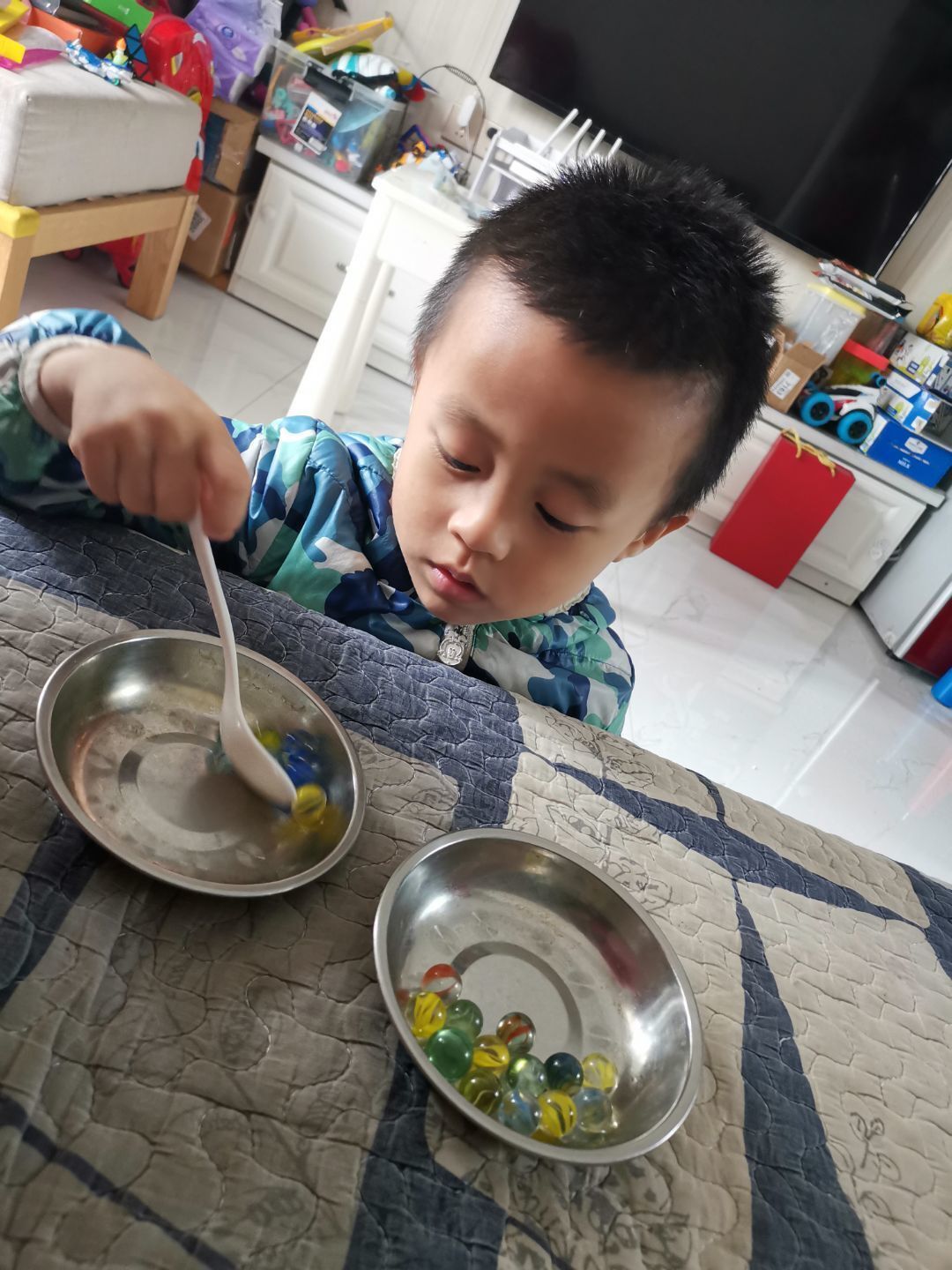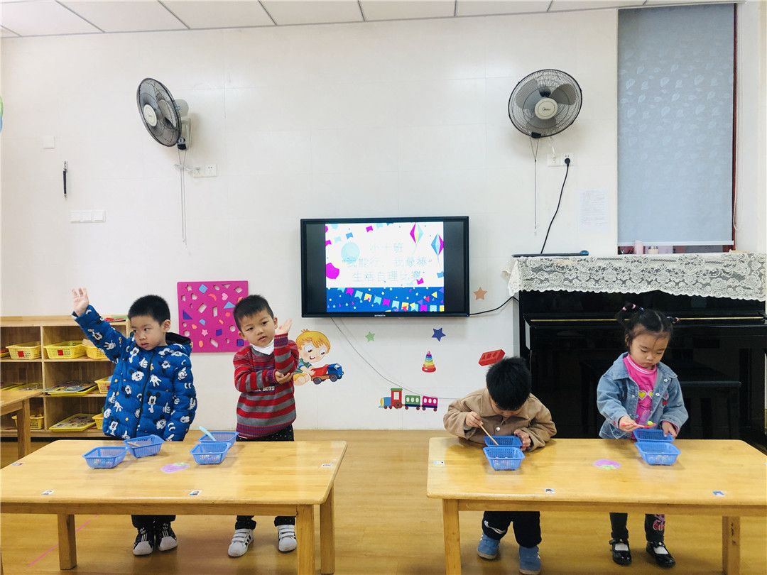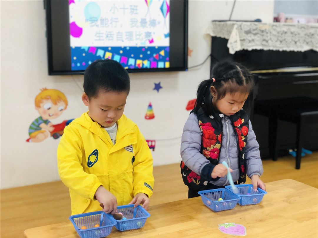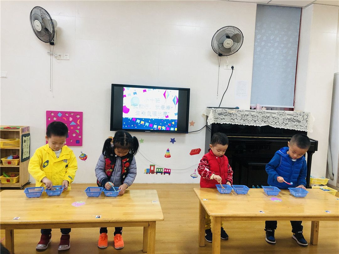 看!大家都已经准备好啦!老师一声令下,小选手们快速地开始舀珠子,一颗两颗三颗……YEAH!我胜利啦!