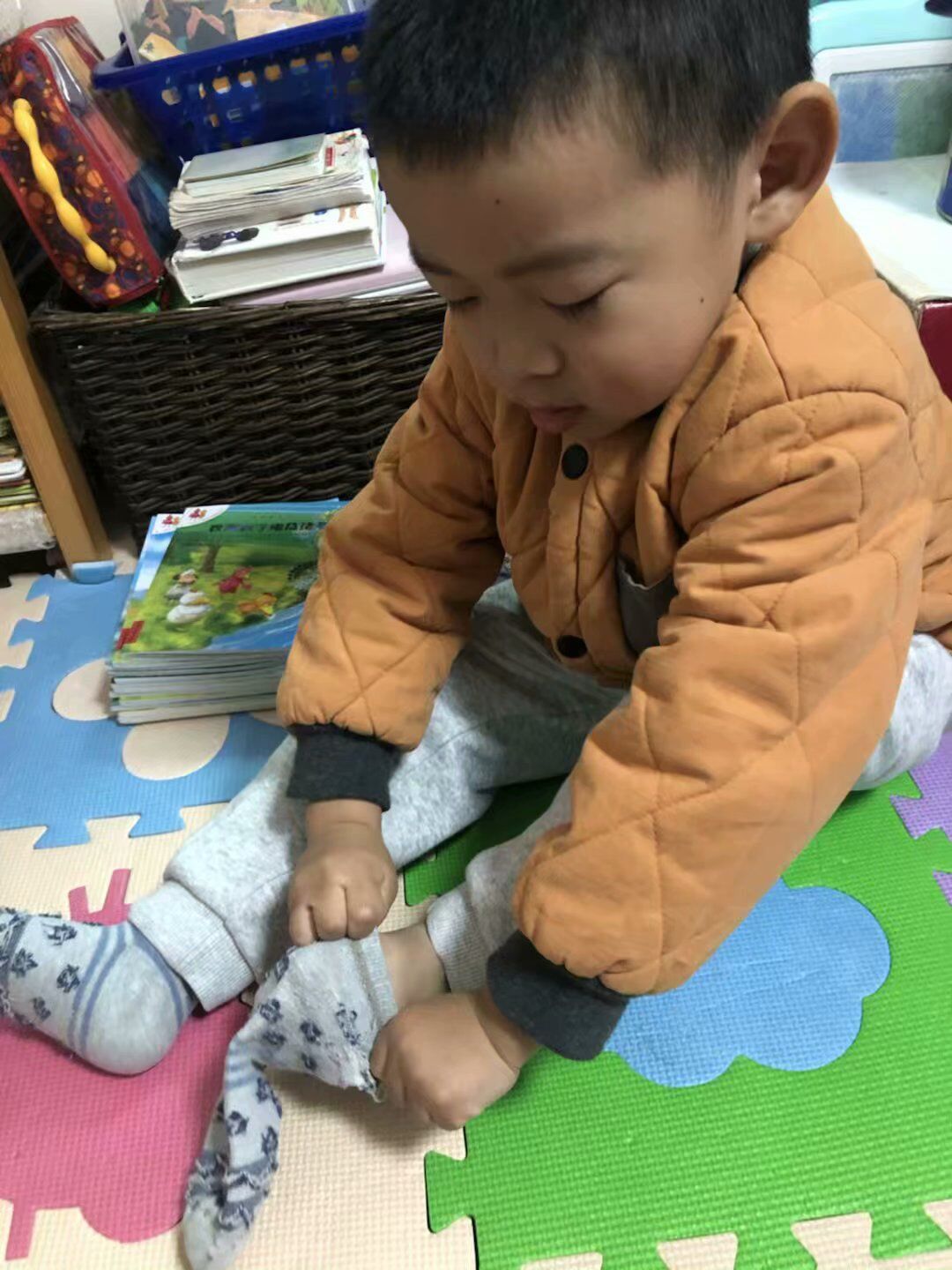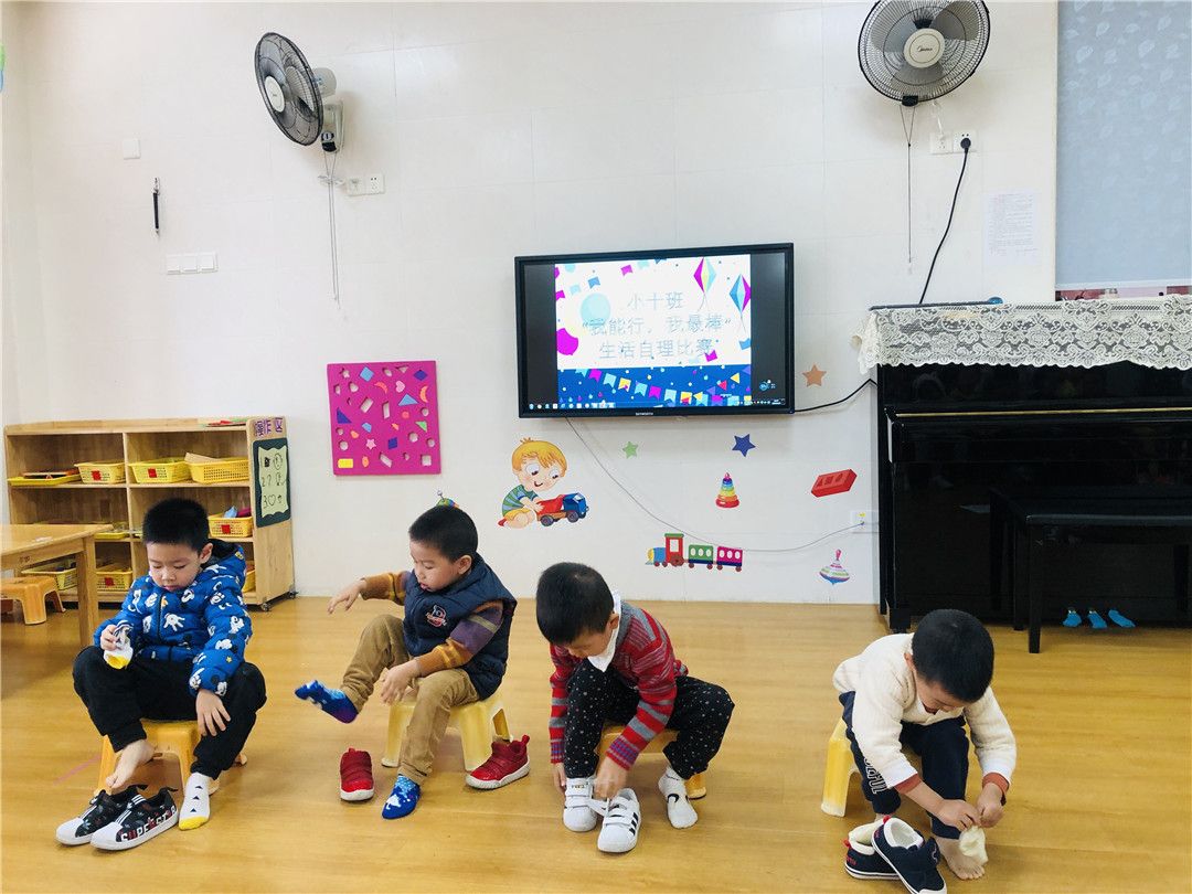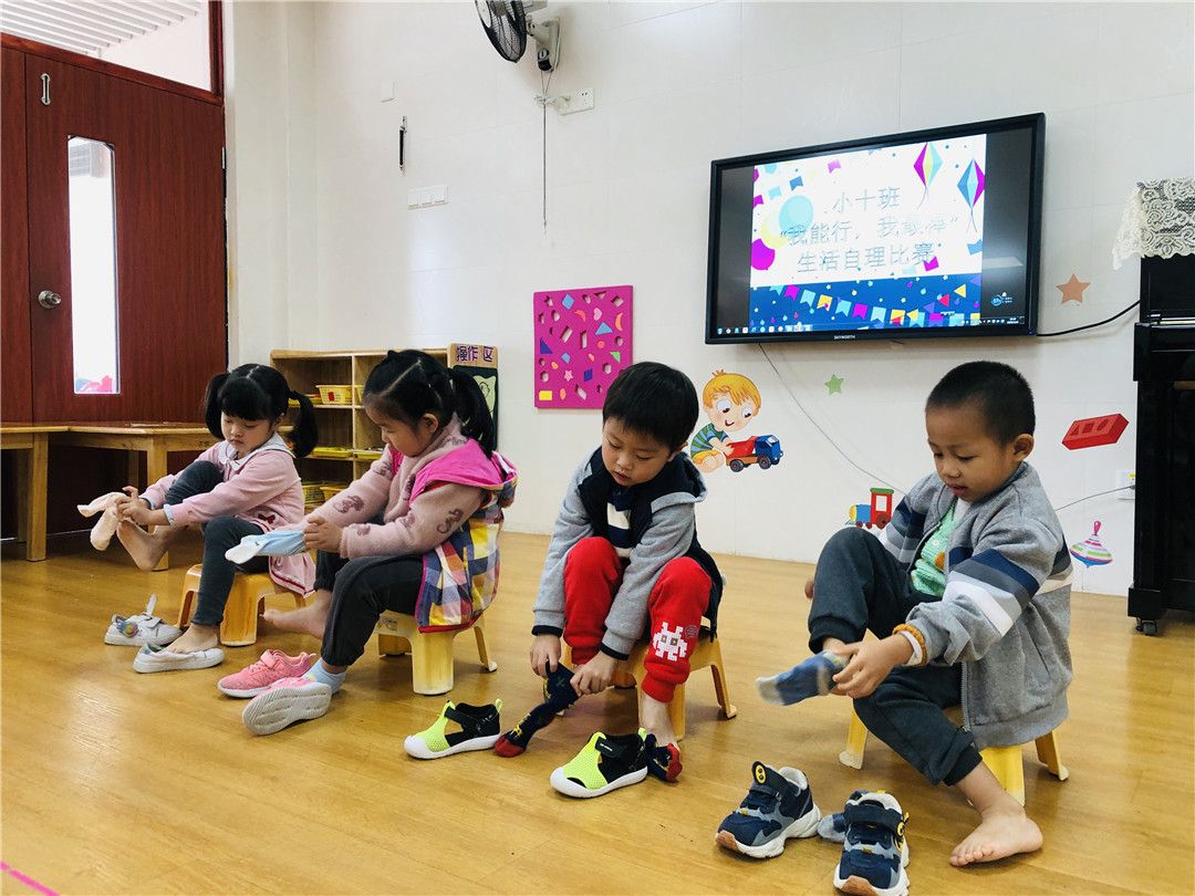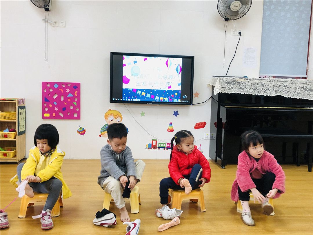 最后的比赛项目是穿鞋袜,这个是我们每天都在做的事情哦!我们不仅会穿穿好,而且还会注意袜面袜底分清楚哦!