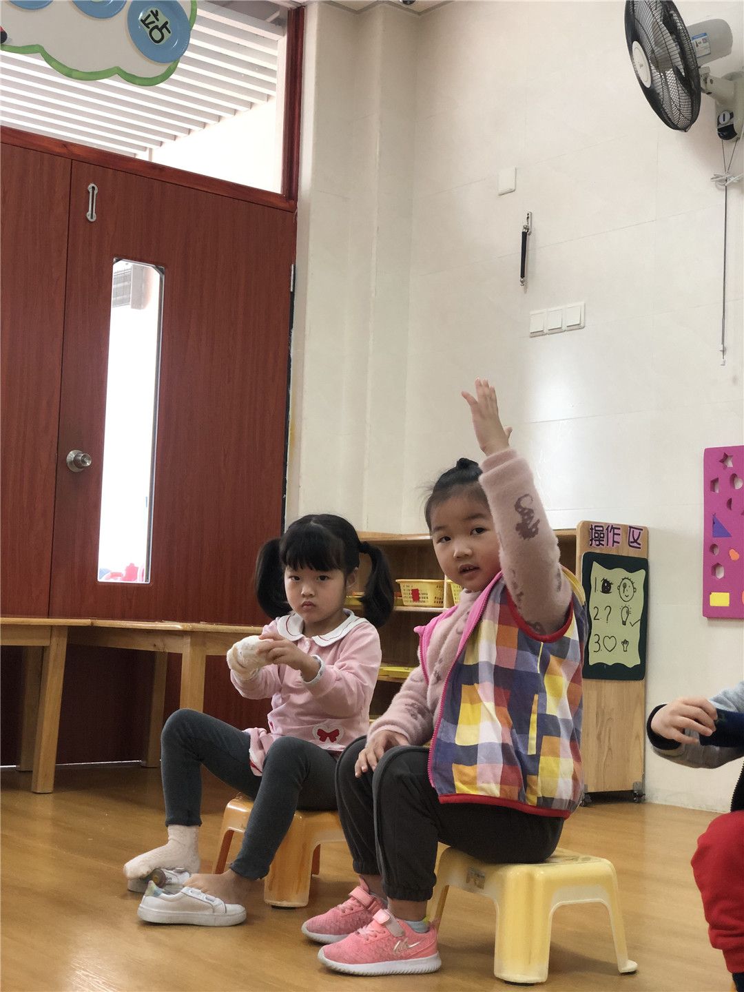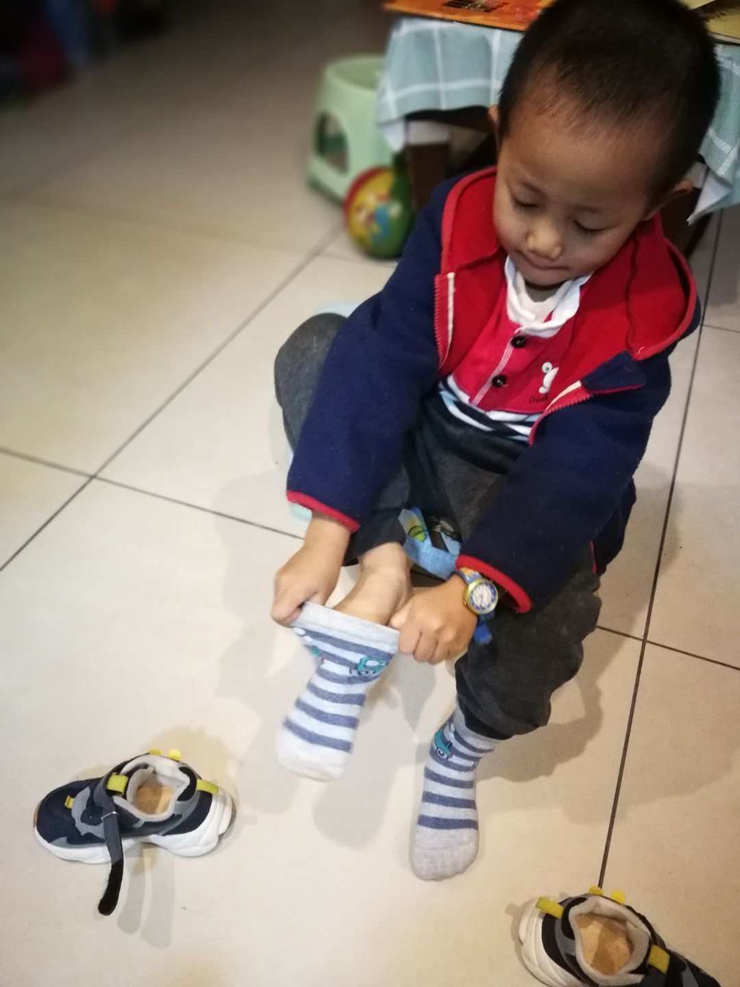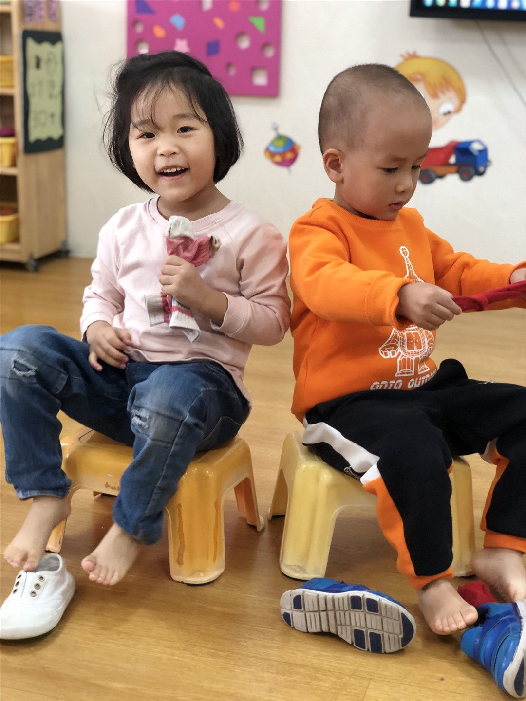 最后的比赛项目是穿鞋袜,这个是我们每天都在做的事情哦!我们不仅会穿穿好,而且还会注意袜面袜底分清楚哦!