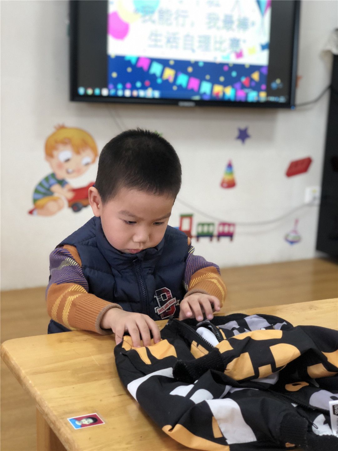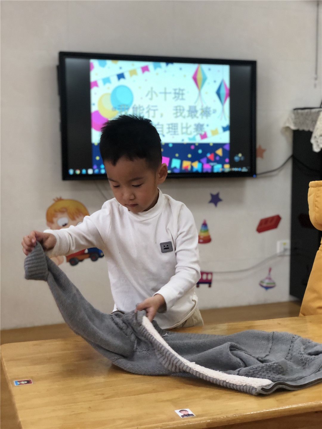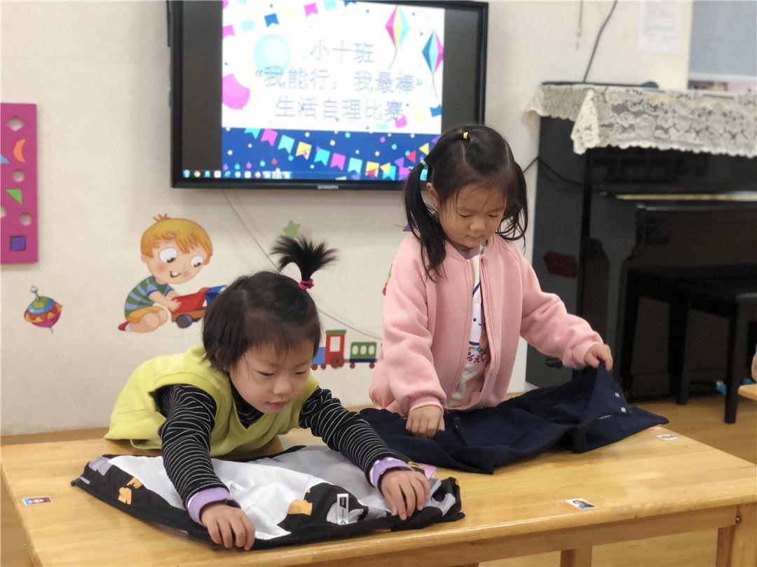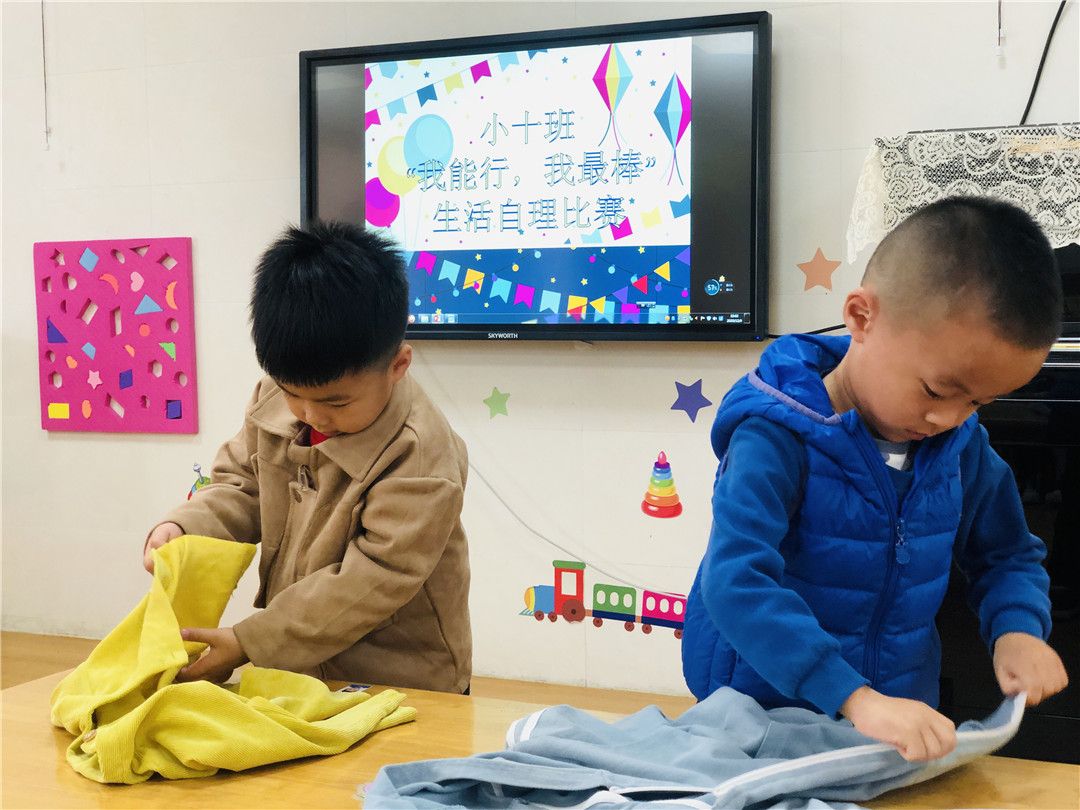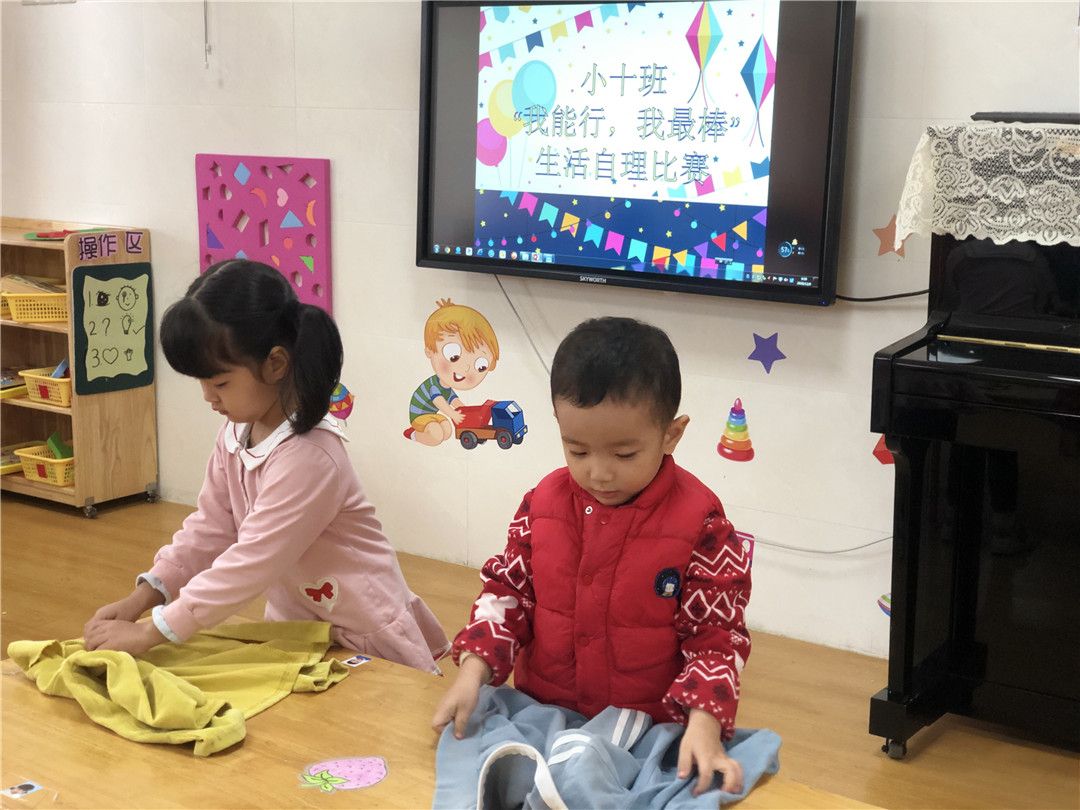 瞧!我们正在一起练习穿衣服、折衣服呢!