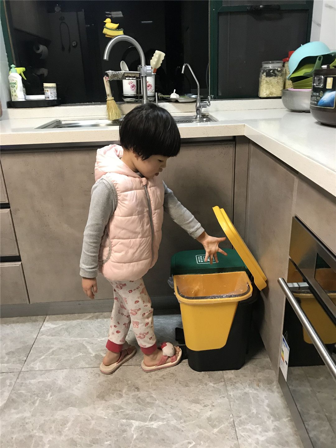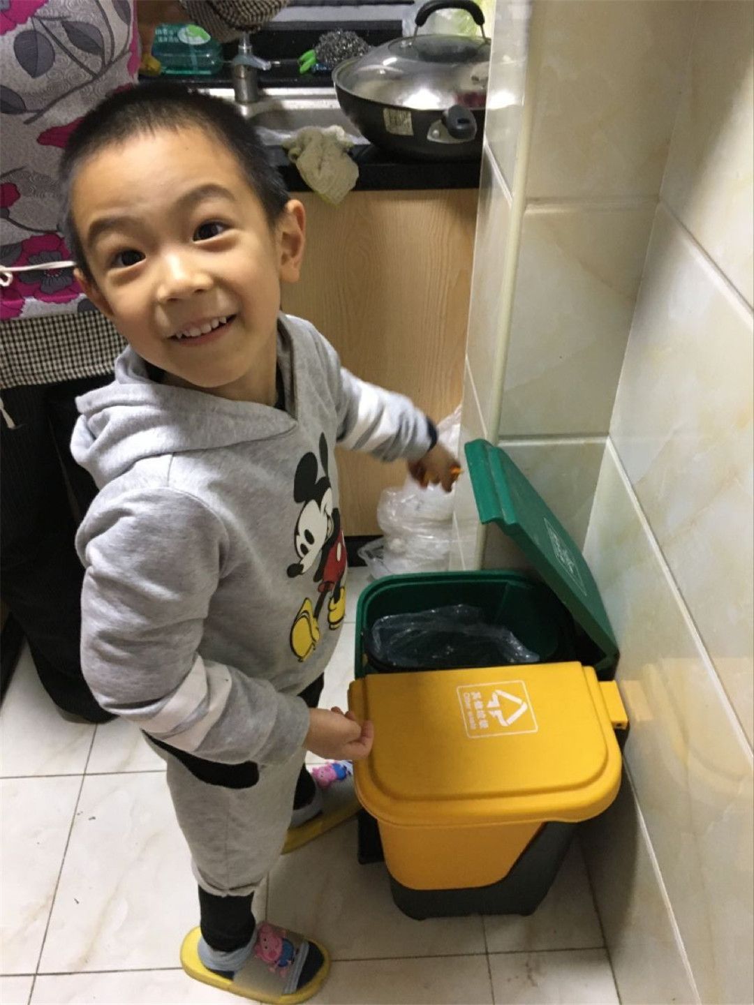 “菜叶是要丢进厨余垃圾桶里面!”